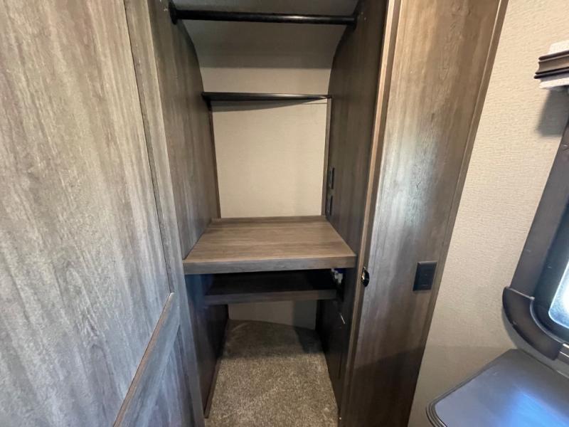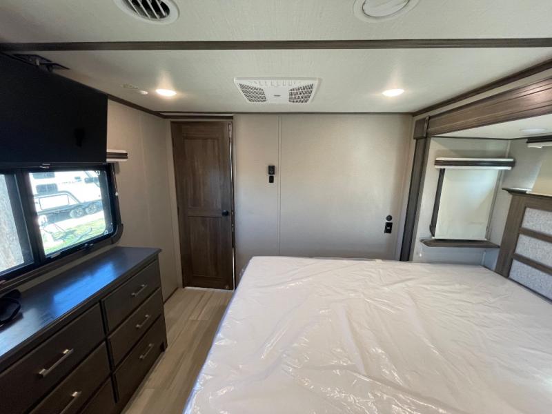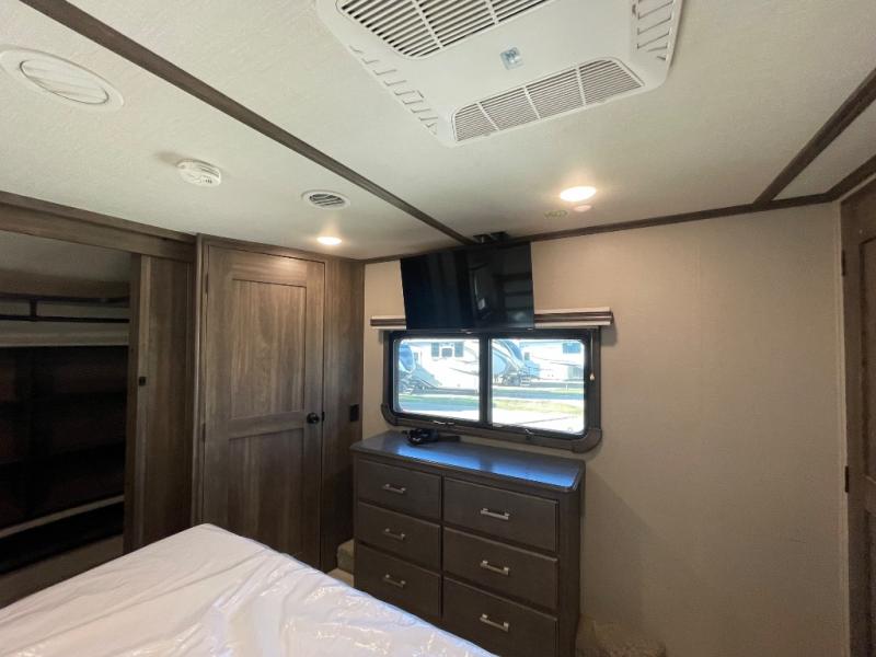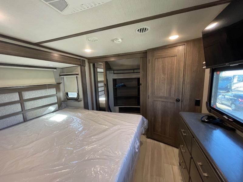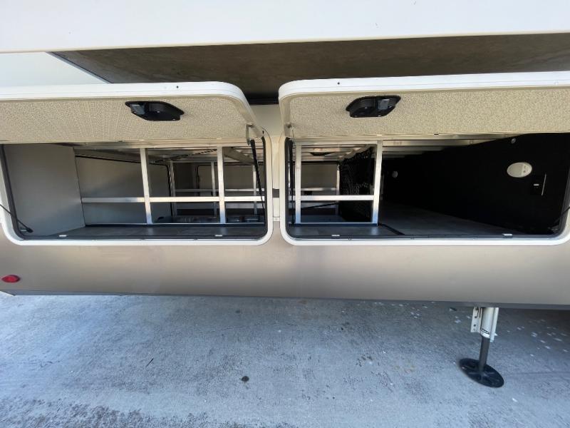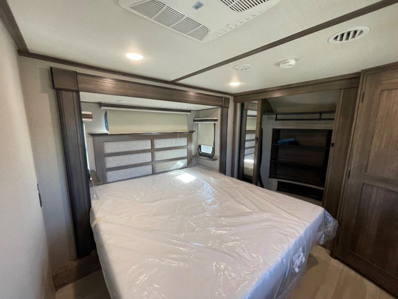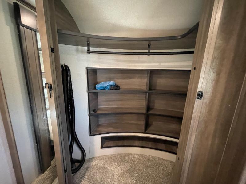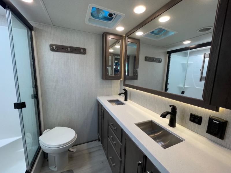 You will love your extended stays while traveling in this Solitude fifth wheel which features five slides! A rear raised kitchen provides the family chef a great space with opposing slides as well as an island for food prep. A raised bar top with two stools overlooks the center living space that also features dual opposing slides, two tri-fold sofas, and theatre seating. Dual sinks in the full bathroom means getting ready is easy for two, and the shower with skylight offers more head room that you are also sure to appreciate. As you wind down your day, the front master bedroom will be a welcomed retreat thanks to a queen bed slide with a pull-out ottoman to sit on when removing your shoes, and the walk-in closet provides ample space for all of your things. For added storage, a large exterior sliding tray offers more room for luggage and larger items. There is also a mid-coach pass-through storage compartment for other camping gear, and an optional pull-out kitchen and/or king bed option if you decide to change things up.