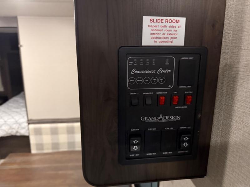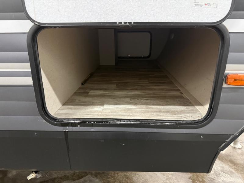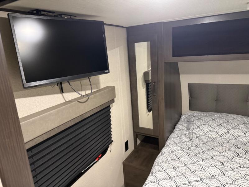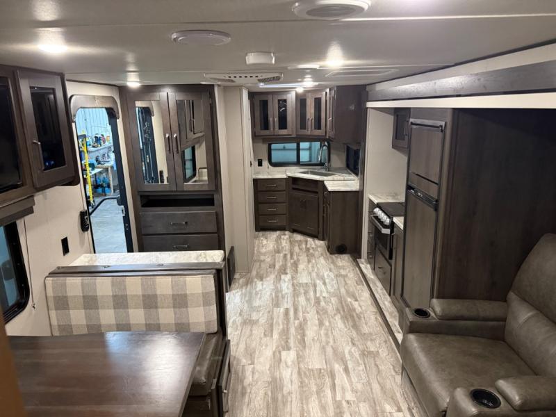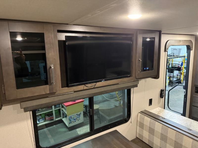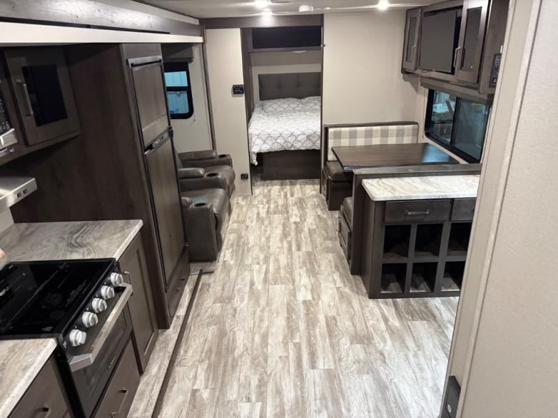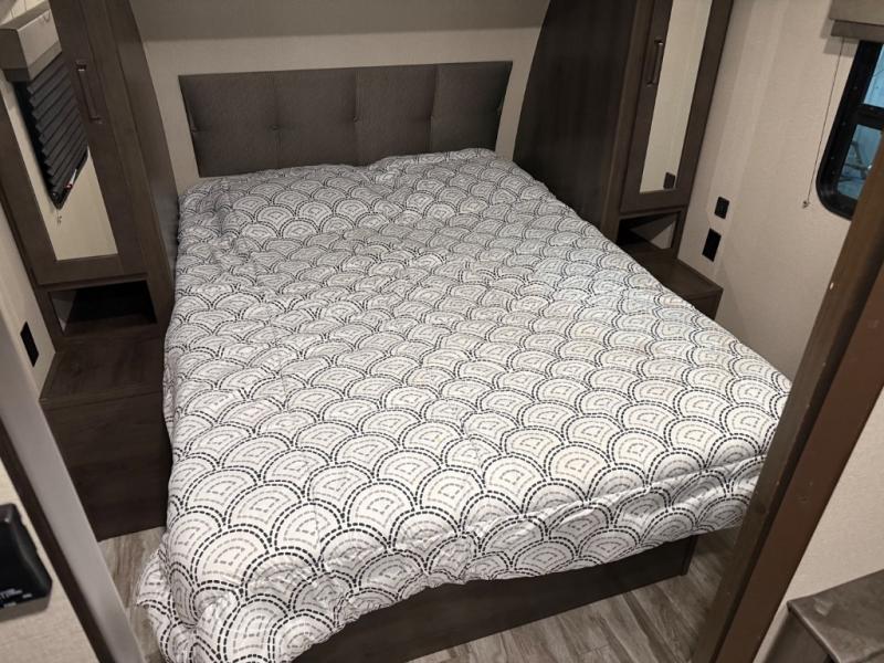 When it’s time to rest, the private front queen bedroom delivers a comfortable night’s sleep with convenient storage options. Additional sleeping space is available thanks to the convertible dinette, making this trailer flexible for families, couples, or travel friends.