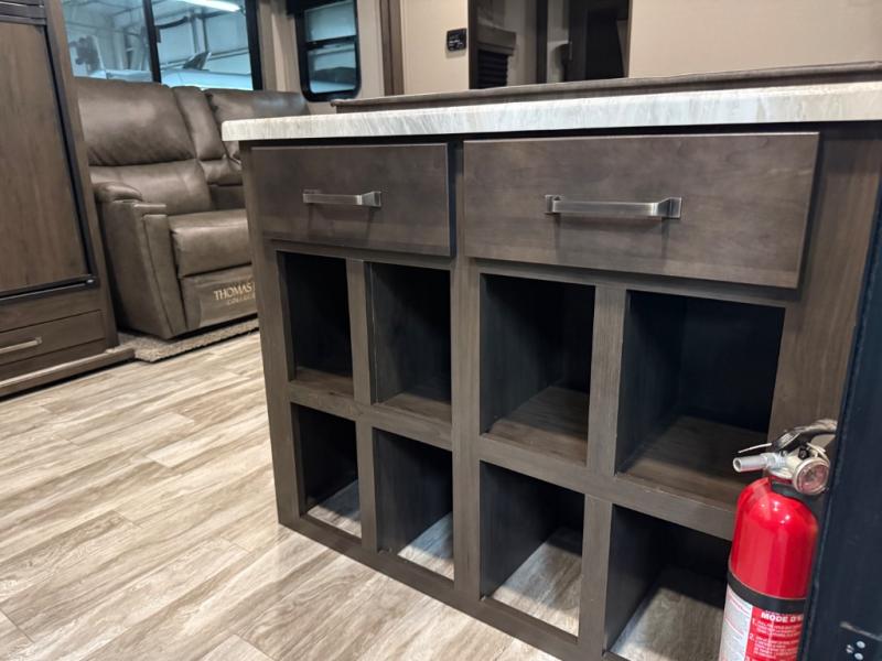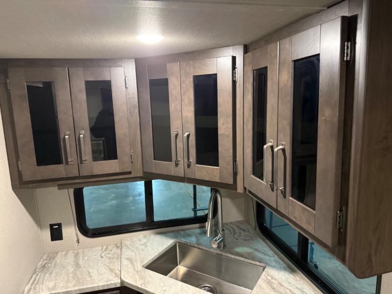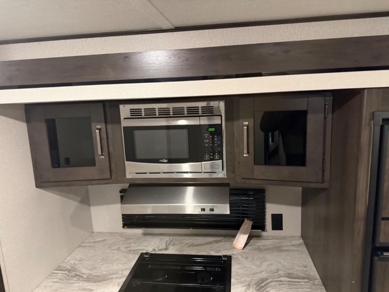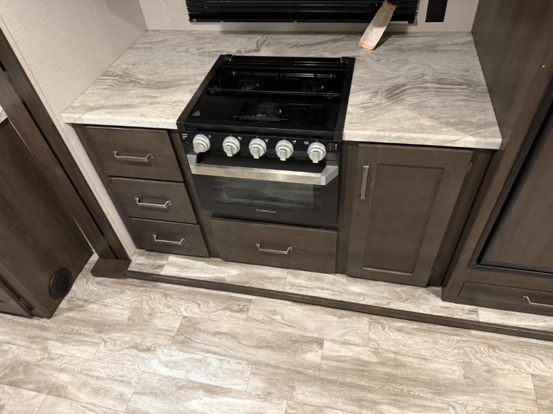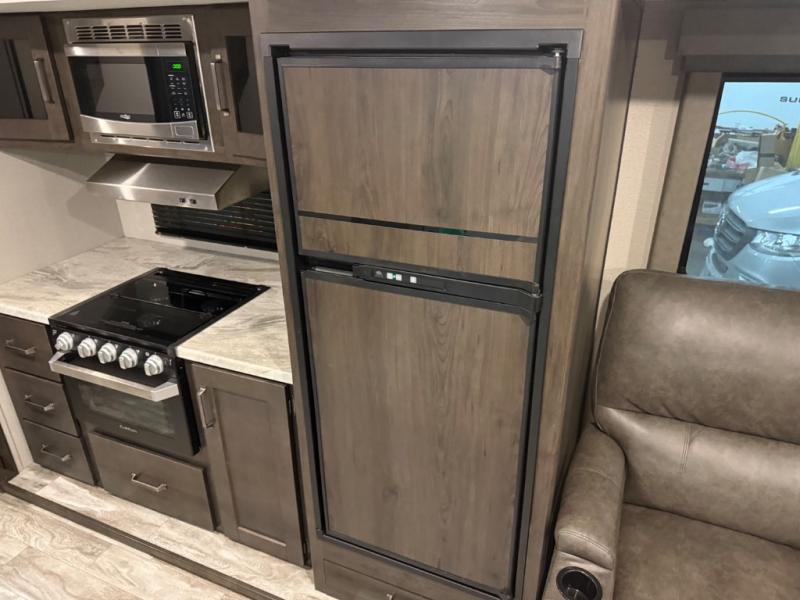 The kitchen area makes cooking on the road a breeze with a three-burner cooktop, oven, refrigerator, microwave, and ample counter space. You’ll find plenty of cabinets for storage, plus clever design touches that make meal prep both functional and enjoyable.