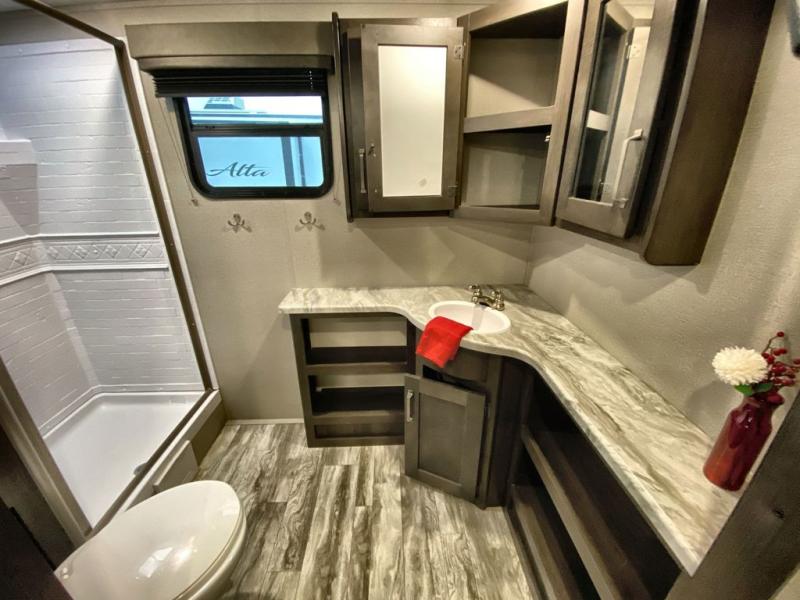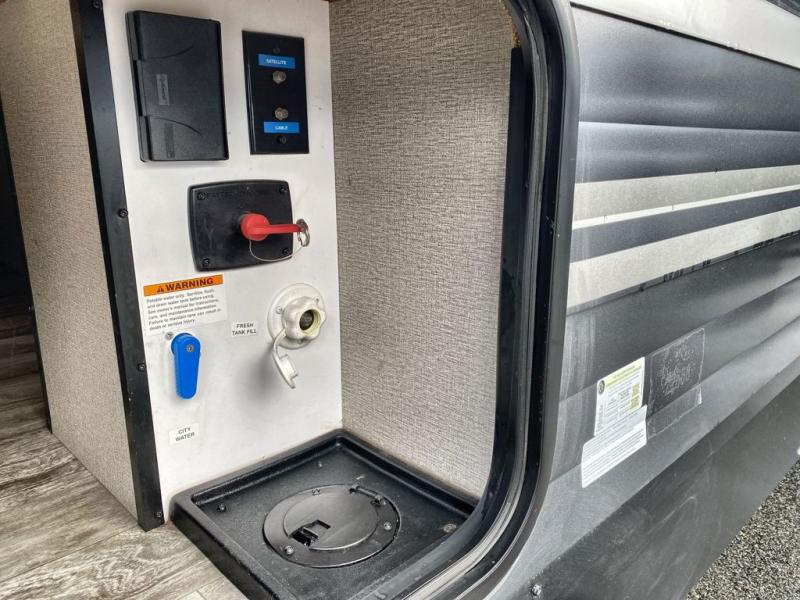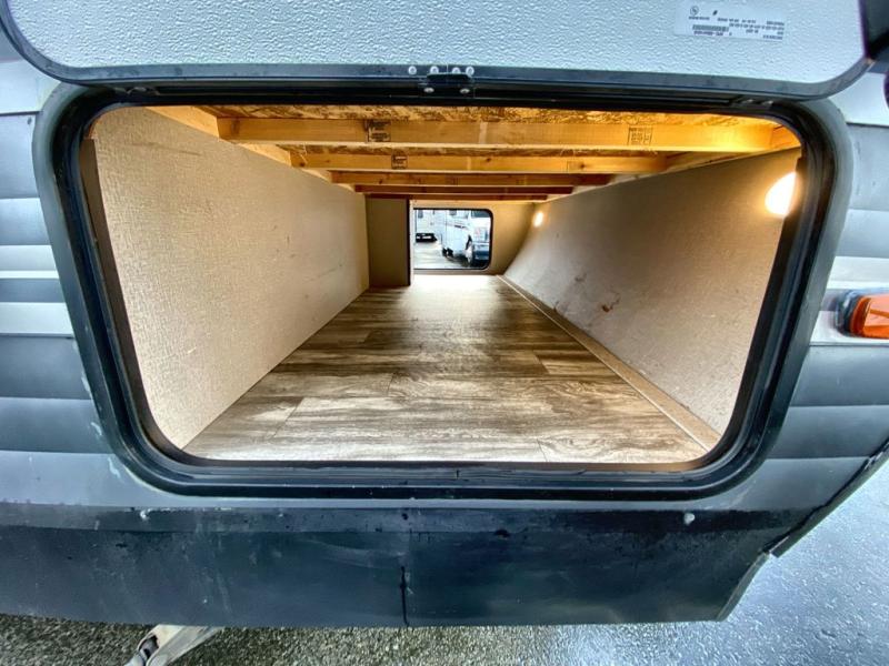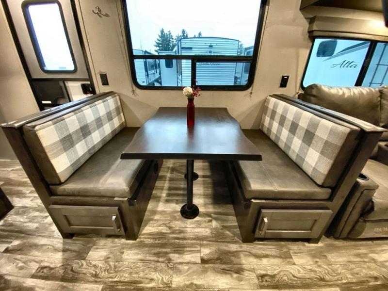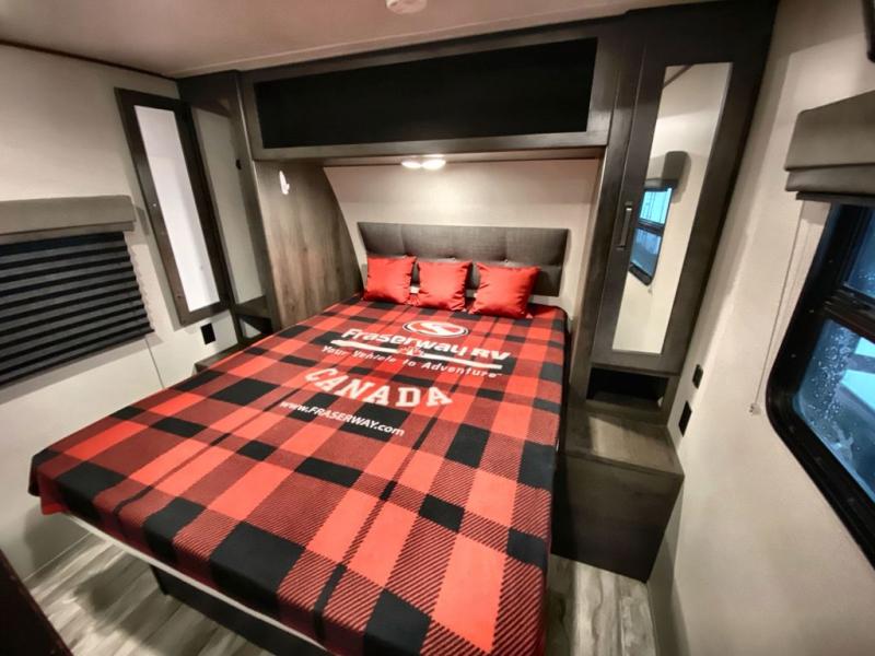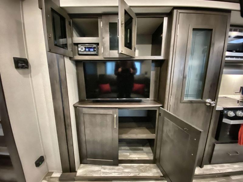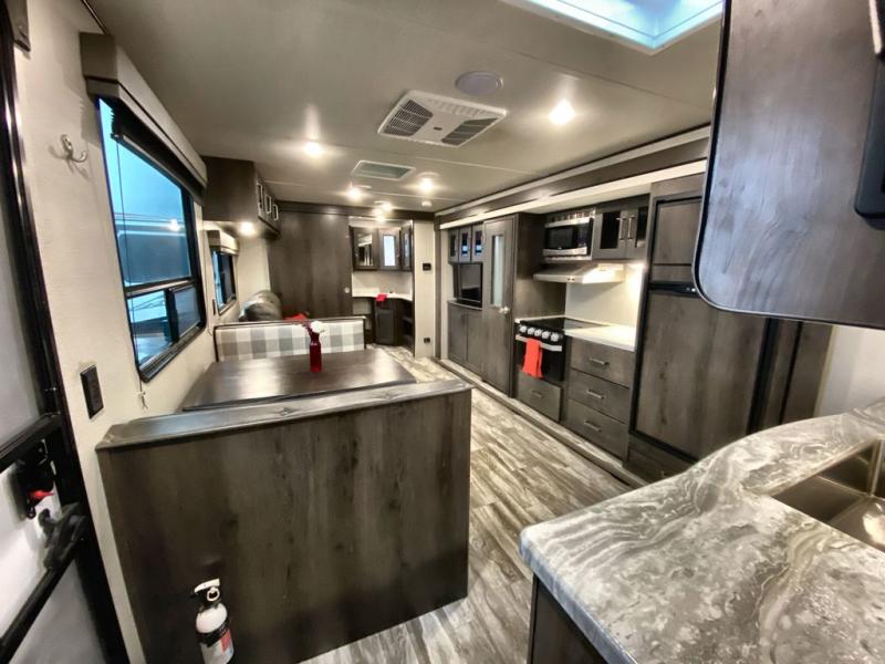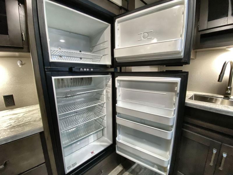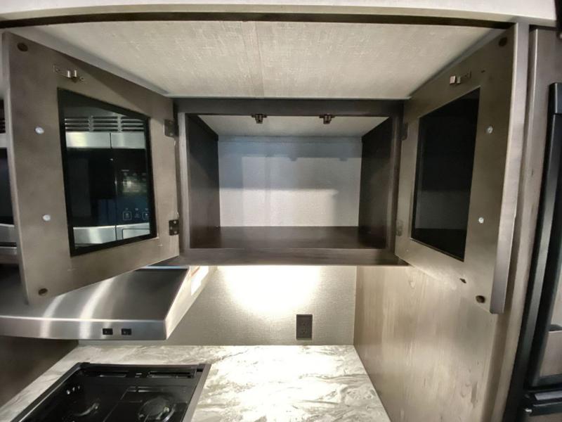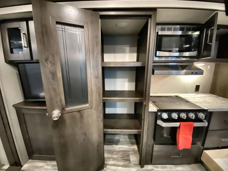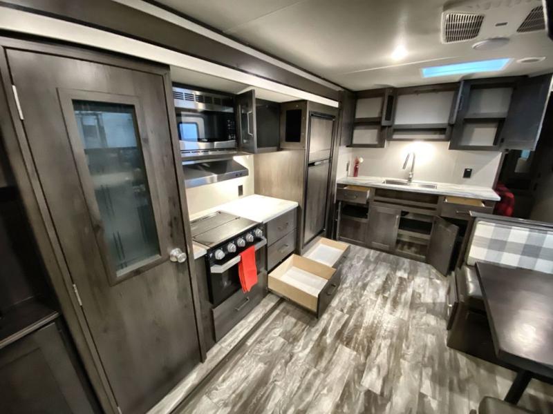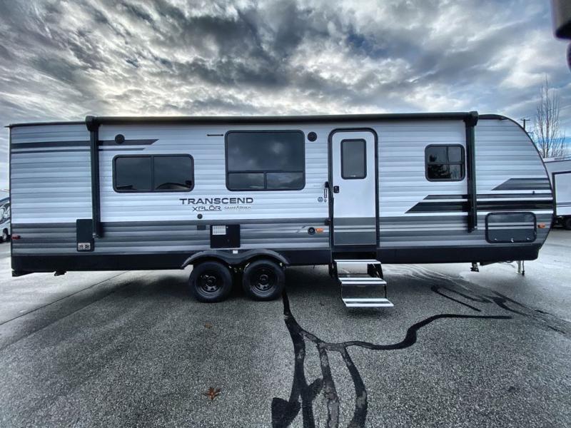 With a private bedroom up front and a full bathroom in the back, this Transcend Xplor travel trailer gives you a very comfortable layout for your travels! Right in the heart of the trailer is where you will find your main living area, and the theater seating and booth dinette provide great places to sit down and reminisce about the day's events. Just across from those pieces of furniture is the kitchen, so you can stay involved in the conversation even while you prepare dinner on the three-burner range with oven. There is also a pet drawer beneath the double-door refrigerator so that your furry friend can eat their dinner too.