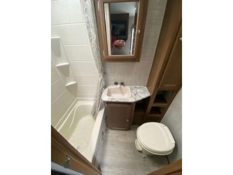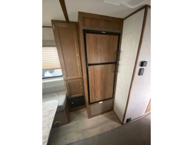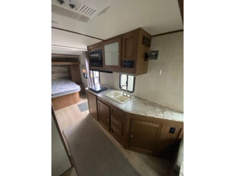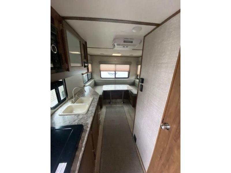 Get ready for family adventure with this trailer in tow! Your family of four will love this travel trailer that includes a U-shaped dinette with a rear window for natural lighting and great views, and provides a place to eat your meals at and play games, plus gives your kiddos their sleeping space. You will appreciate the queen bed in the front bedroom, and the full bath allows everyone to get cleaned up before they start their day. There are overhead cabinets for your dishes, books, and board games, shirt closets for clothing, and the exterior pass-through storage can hold the fishing poles. The kitchen amenities offer everything you will need to make warm meals, and the exterior electric awning offers an outdoor living area protected from the elements.