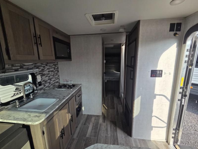 This travel trailer will feel more like home thanks to its front bedroom with a queen bed and dual wardrobes for your clothes. There is a private toilet and sink, with the shower just across the hall so two people can freshen up at once, and the rear booth dinette will provide a place to dine and sleep. The 6 cu. ft. double door refrigerator will keep your perishables fresh all week, and you can prepare meals on the two burner cooktop or in the microwave oven.