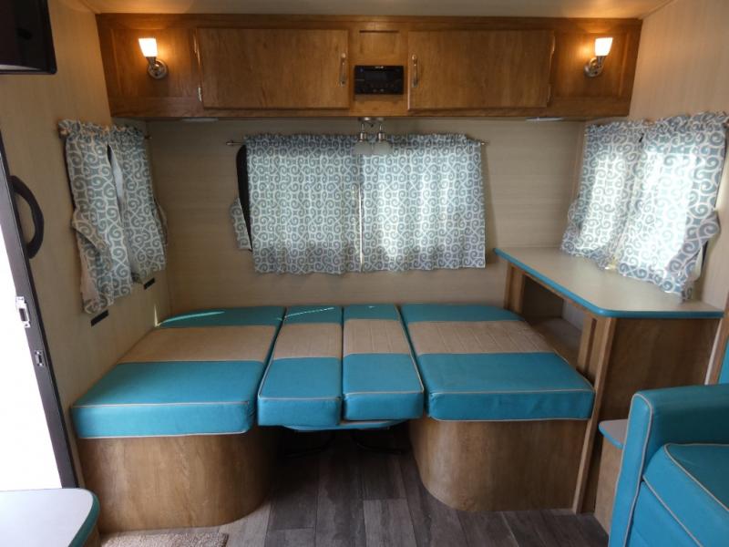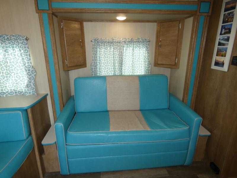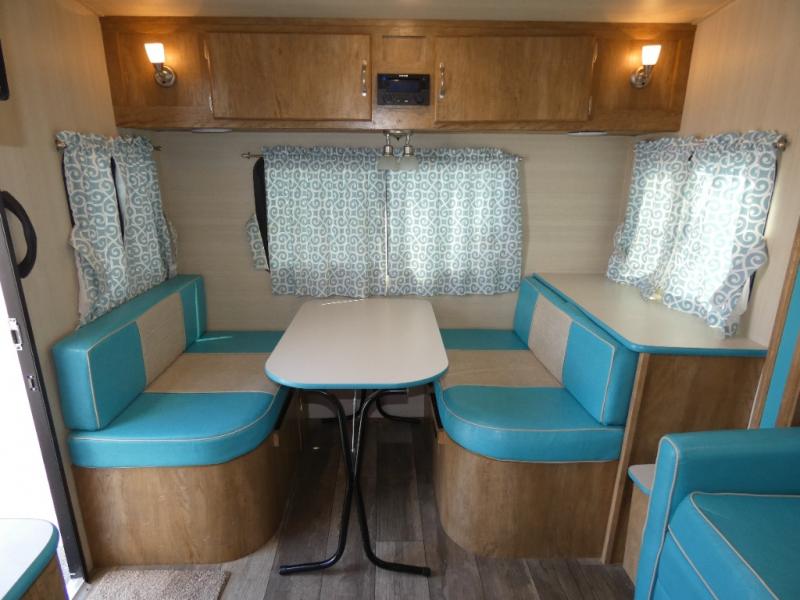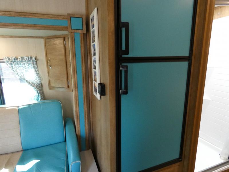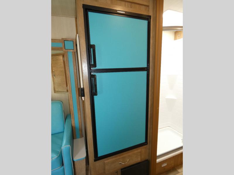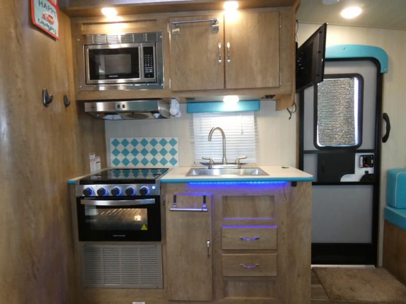 Camping with friends just got a whole lot sweeter in this retro travel trailer! Once you arrive at the lake, prepare a quick lunch on the two burner cooktop, or use the microwave oven. When you return, two people can freshen up at once since there is a private toilet and sink with the shower just across the hall.