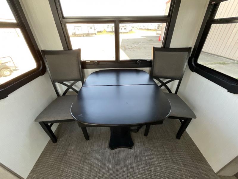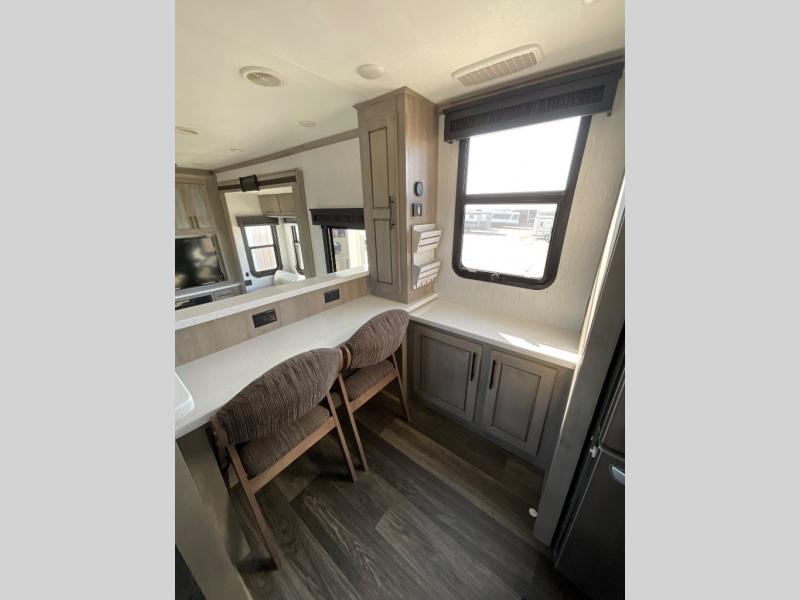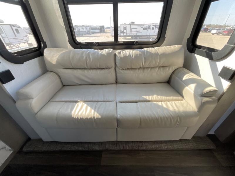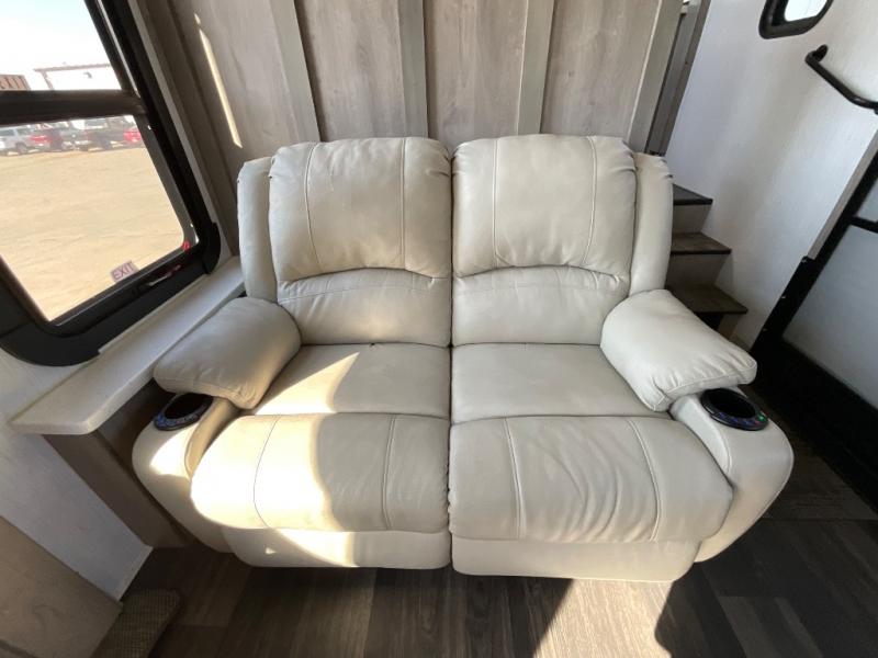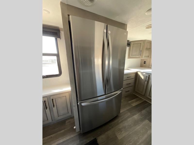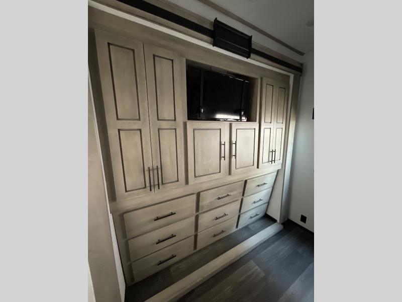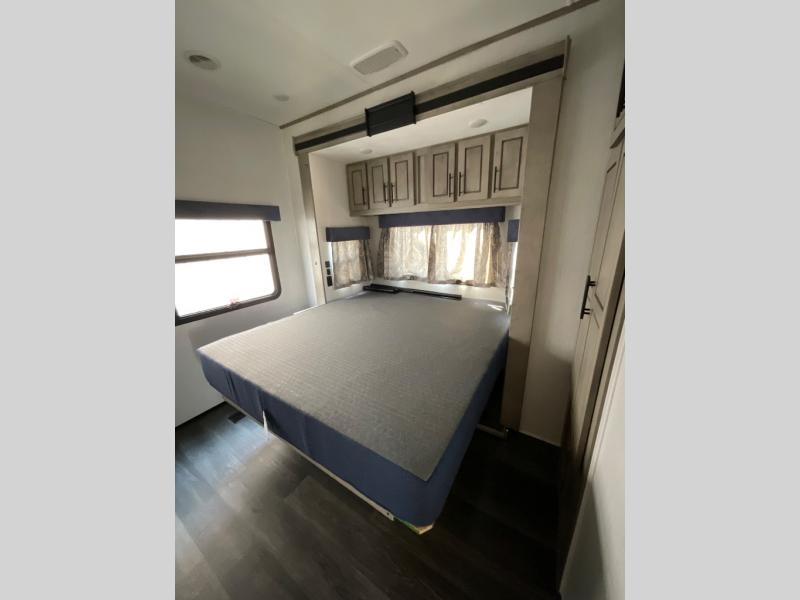 You will love the spacious front kitchen area with all the appliances you need to make meals to keep everyone fed even at thanksgiving, plus lots of counter space including a bar-top with seats to dine at. This is a chef's dream kitchen! The separate living area in the middle of the RV offers dual opposing sofa slides, and a theater seating to relax and unwind after hiking, fishing or shopping in town. You can retire to your own master bedroom with dual slides as well, a king bed and a large wardrobe, plus a closet prepped for a washer and dryer. And the full bathroom includes a shower with a seat as an added bonus!