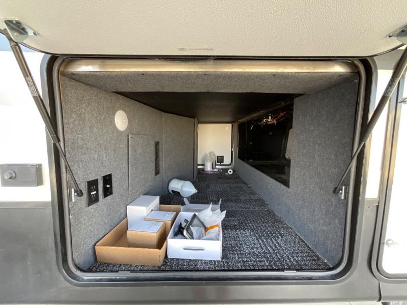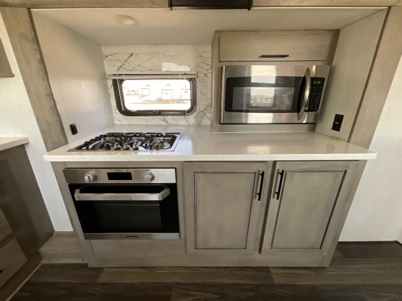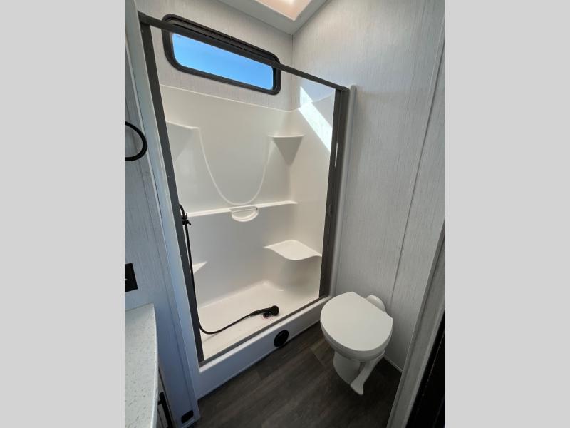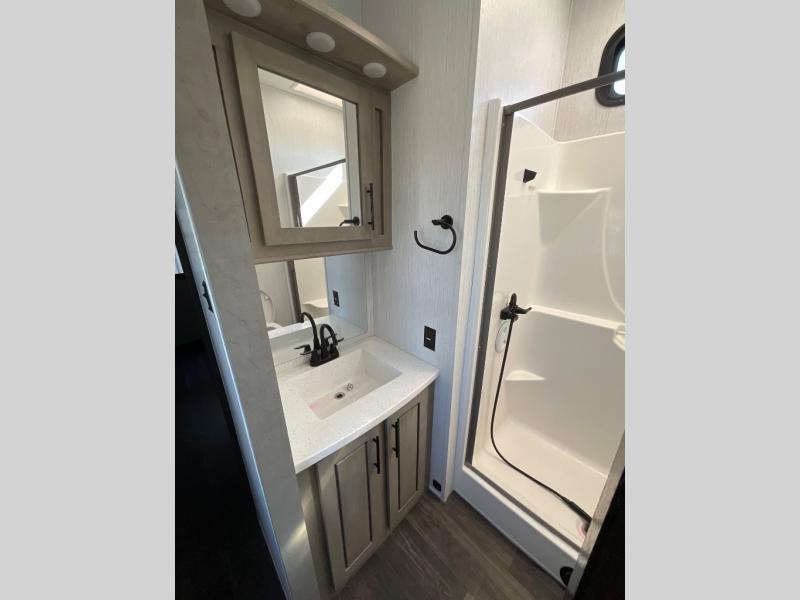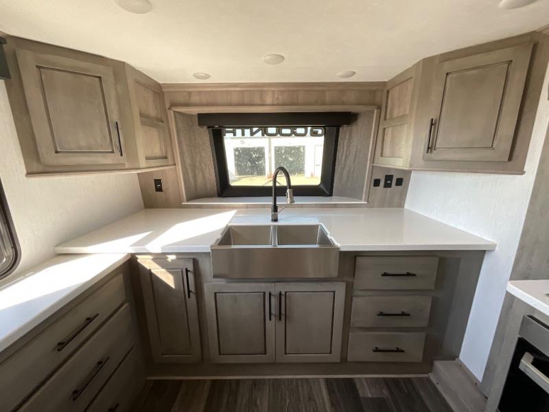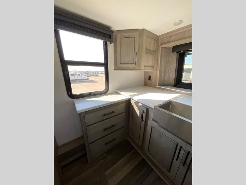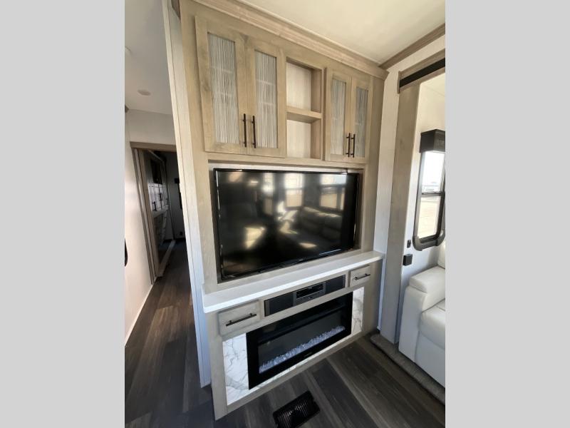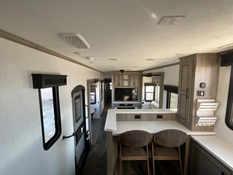 You will love the spacious front kitchen area with all the appliances you need to make meals to keep everyone fed even at thanksgiving, plus lots of counter space including a bar-top with seats to dine at. This is a chef's dream kitchen! The separate living area in the middle of the RV offers dual opposing sofa slides, and a theater seating to relax and unwind after hiking, fishing or shopping in town. You can retire to your own master bedroom with dual slides as well, a king bed and a large wardrobe, plus a closet prepped for a washer and dryer. And the full bathroom includes a shower with a seat as an added bonus!