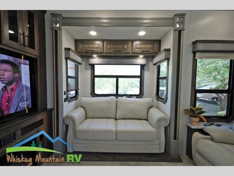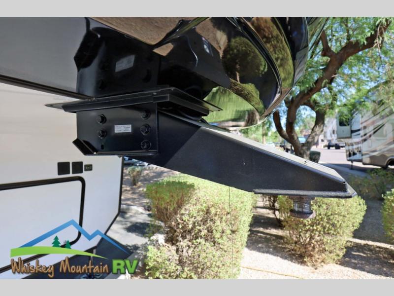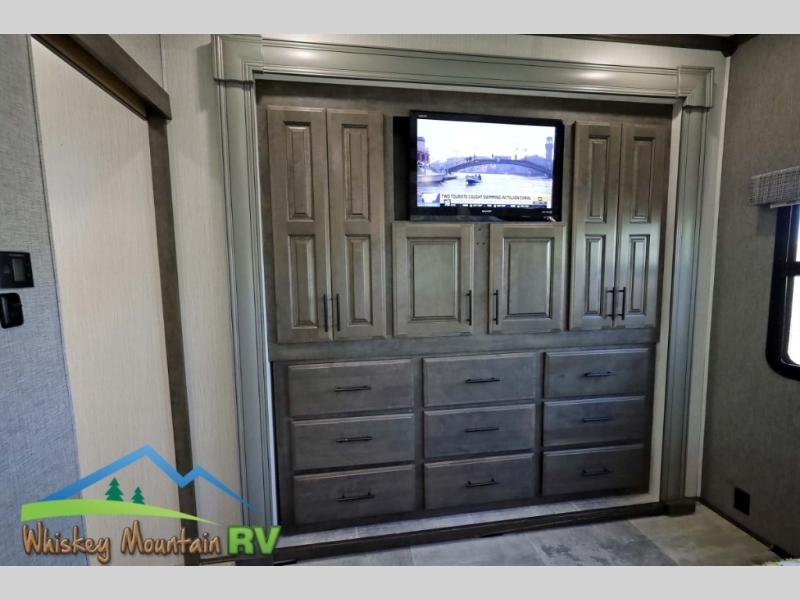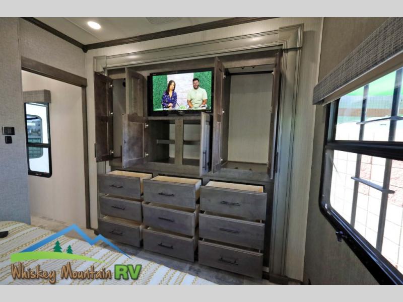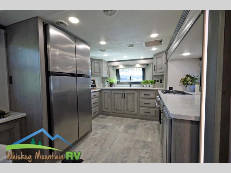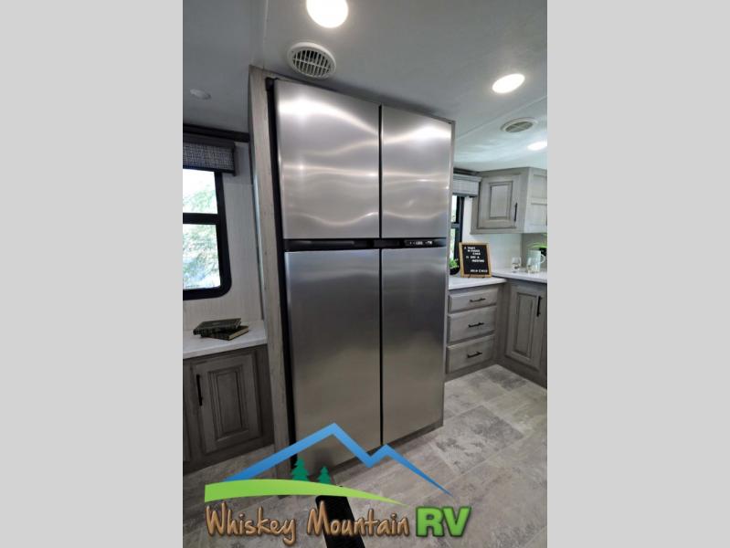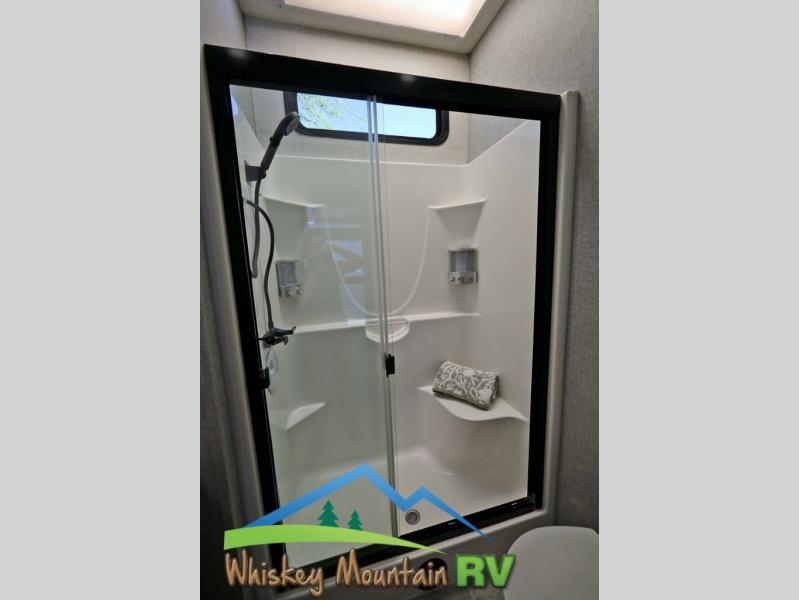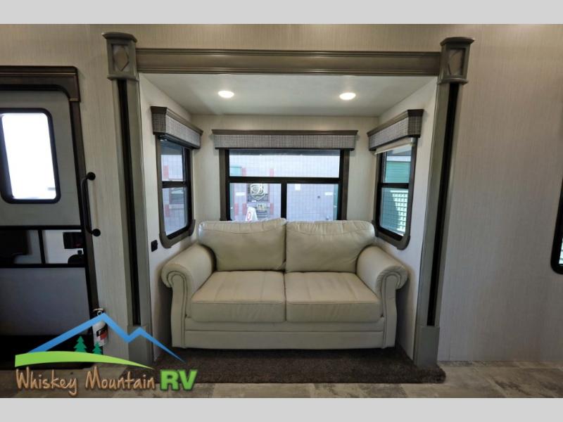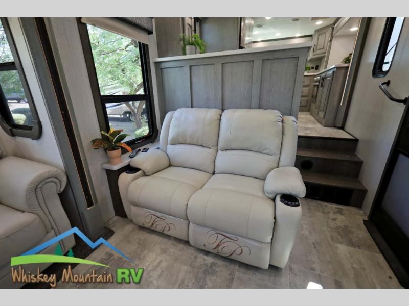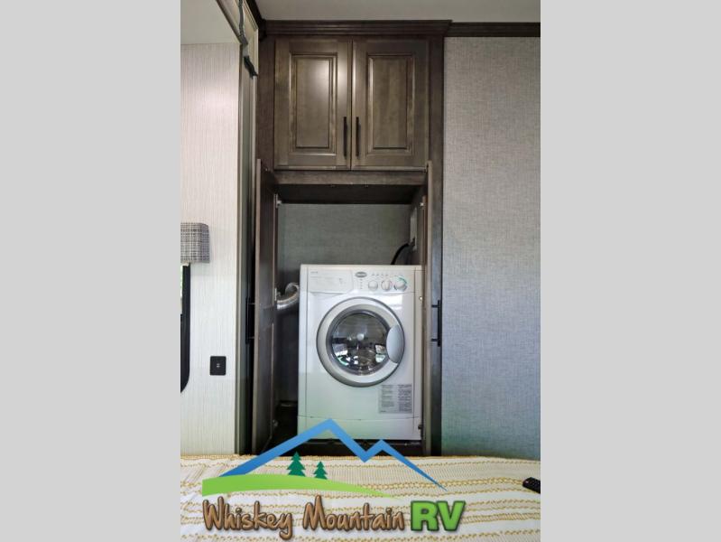 You will be amazed at all this fifth wheel has to offer! From the front raised kitchen with lots of counter space, the large, deep pantry, and breakfast bar counter with two bar stools overlooking the living and dining area to the spacious rear bedroom. The living area has a flip and fold sleeper sofa for you to take an afternoon nap on or relax at the power theater seating while others play card games at the standard dinette slide which can be switched out for the optional sofa. After a fun-filled day outdoors, head to the full bathroom and take a nice, hot shower in the shower with a teak seat. The rear private bedroom welcomes you to a good night's rest on the king bed slide, and if you choose to add the optional washer and dryer then you can have clean clothes throughout your entire trip!