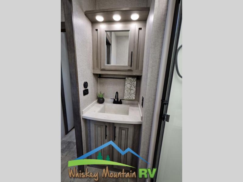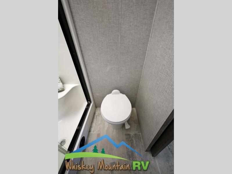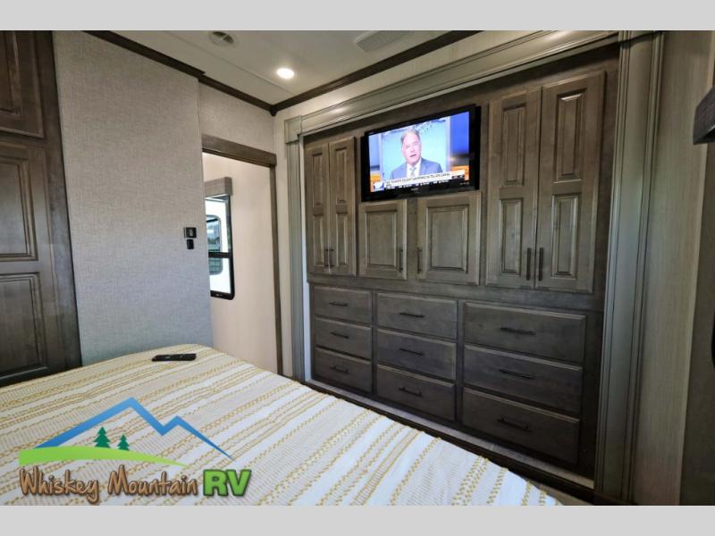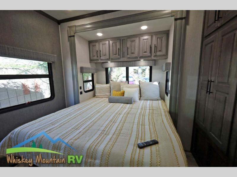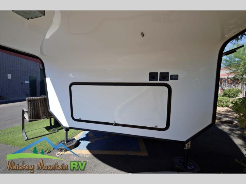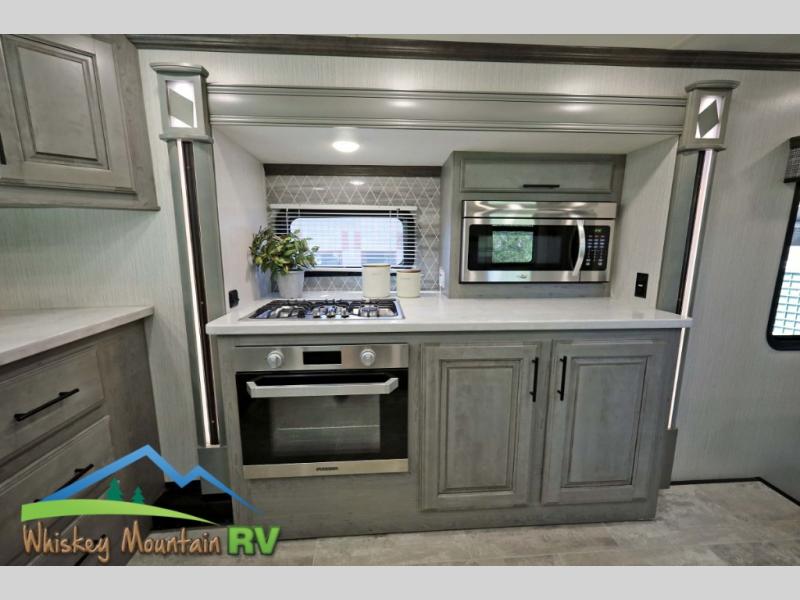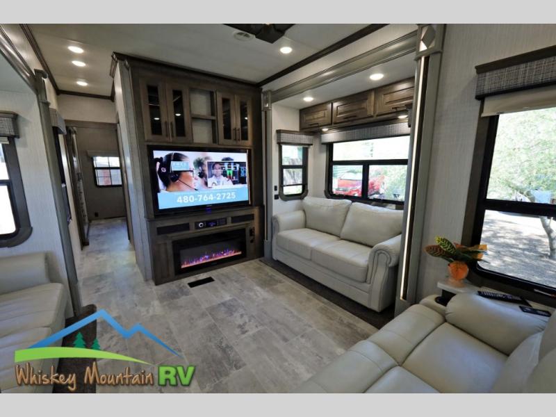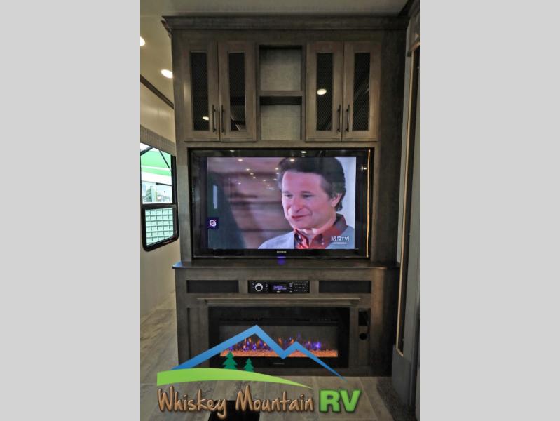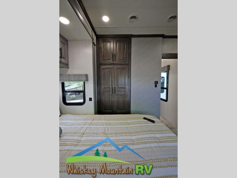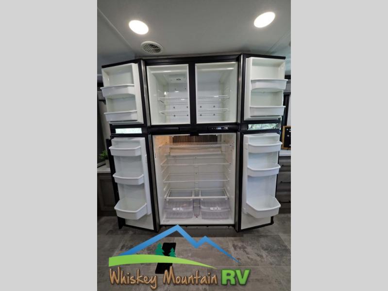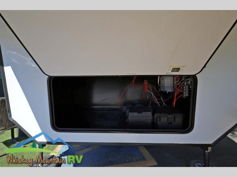 You will be amazed at all this fifth wheel has to offer! From the front raised kitchen with lots of counter space, the large, deep pantry, and breakfast bar counter with two bar stools overlooking the living and dining area to the spacious rear bedroom. The living area has a flip and fold sleeper sofa for you to take an afternoon nap on or relax at the power theater seating while others play card games at the standard dinette slide which can be switched out for the optional sofa. After a fun-filled day outdoors, head to the full bathroom and take a nice, hot shower in the shower with a teak seat. The rear private bedroom welcomes you to a good night's rest on the king bed slide, and if you choose to add the optional washer and dryer then you can have clean clothes throughout your entire trip!