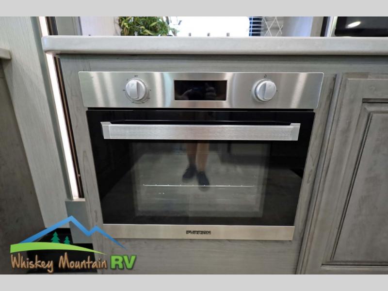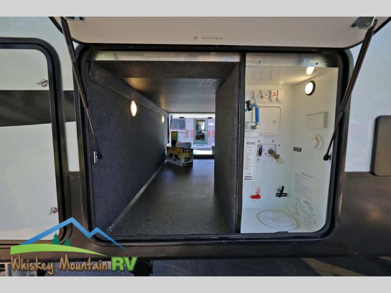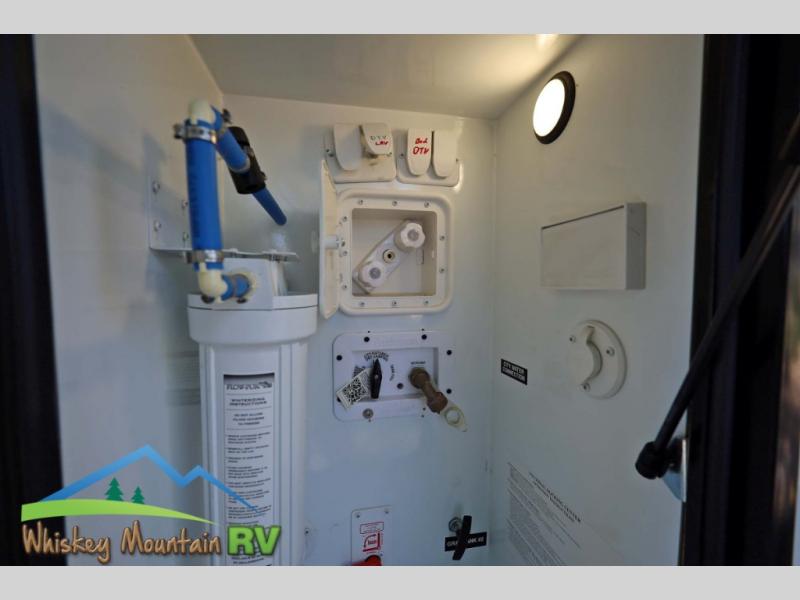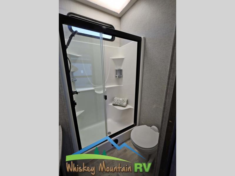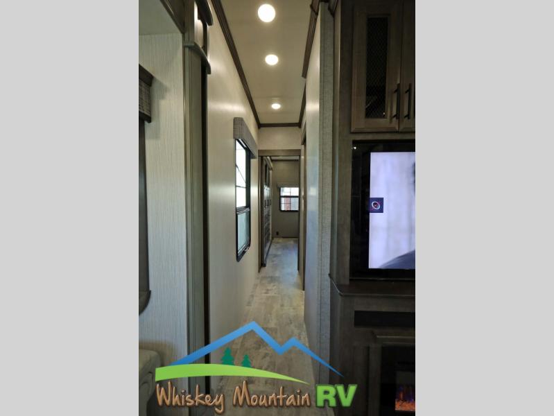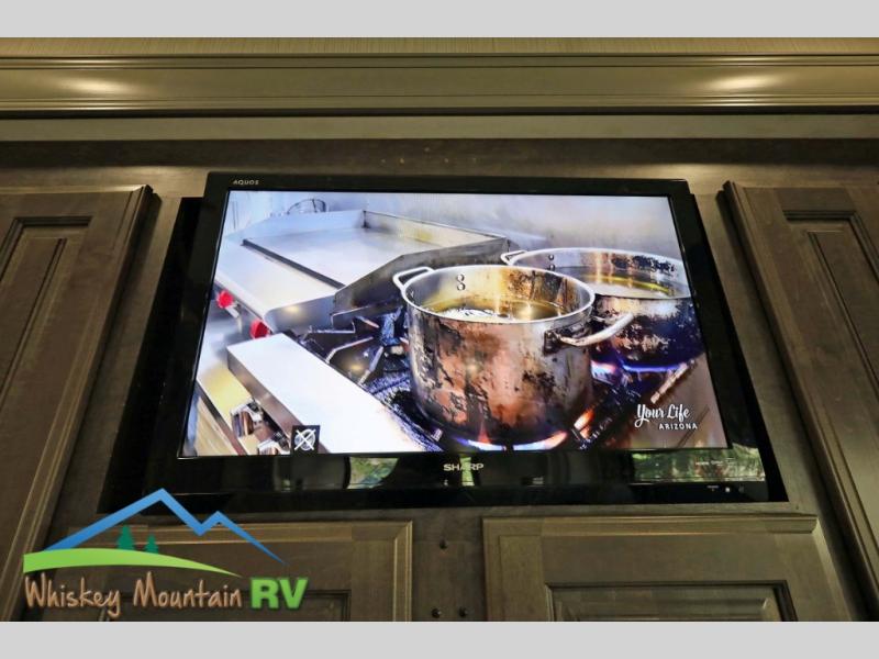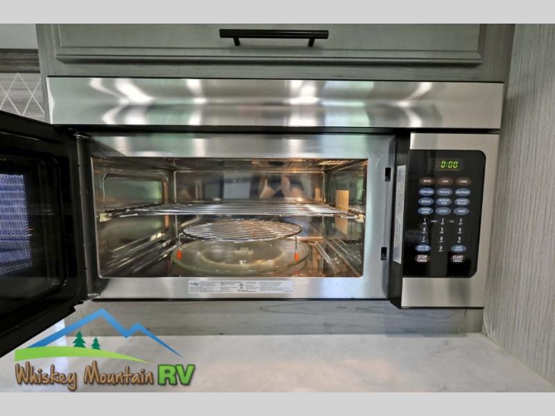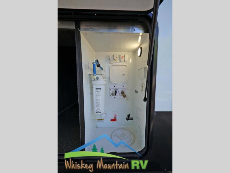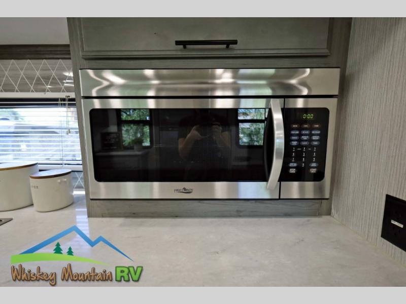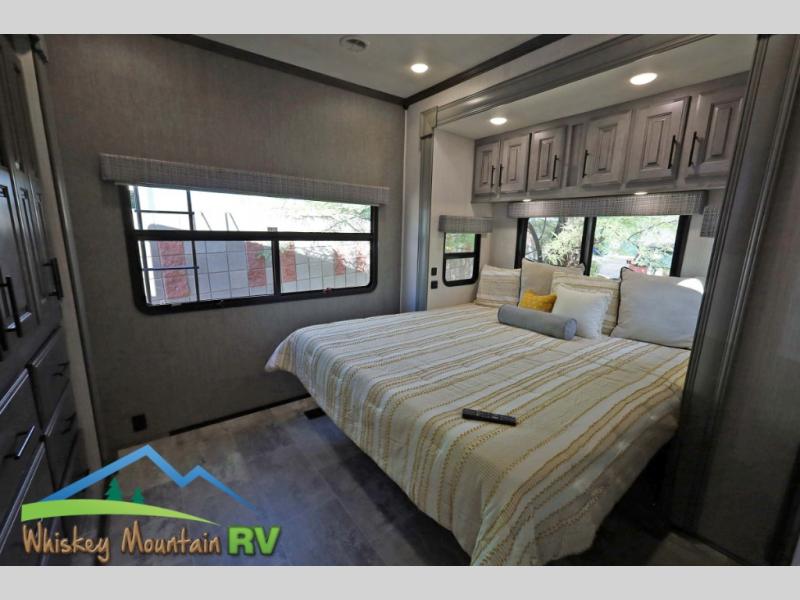 You will be amazed at all this fifth wheel has to offer! From the front raised kitchen with lots of counter space, the large, deep pantry, and breakfast bar counter with two bar stools overlooking the living and dining area to the spacious rear bedroom. The living area has a flip and fold sleeper sofa for you to take an afternoon nap on or relax at the power theater seating while others play card games at the standard dinette slide which can be switched out for the optional sofa. After a fun-filled day outdoors, head to the full bathroom and take a nice, hot shower in the shower with a teak seat. The rear private bedroom welcomes you to a good night's rest on the king bed slide, and if you choose to add the optional washer and dryer then you can have clean clothes throughout your entire trip!
