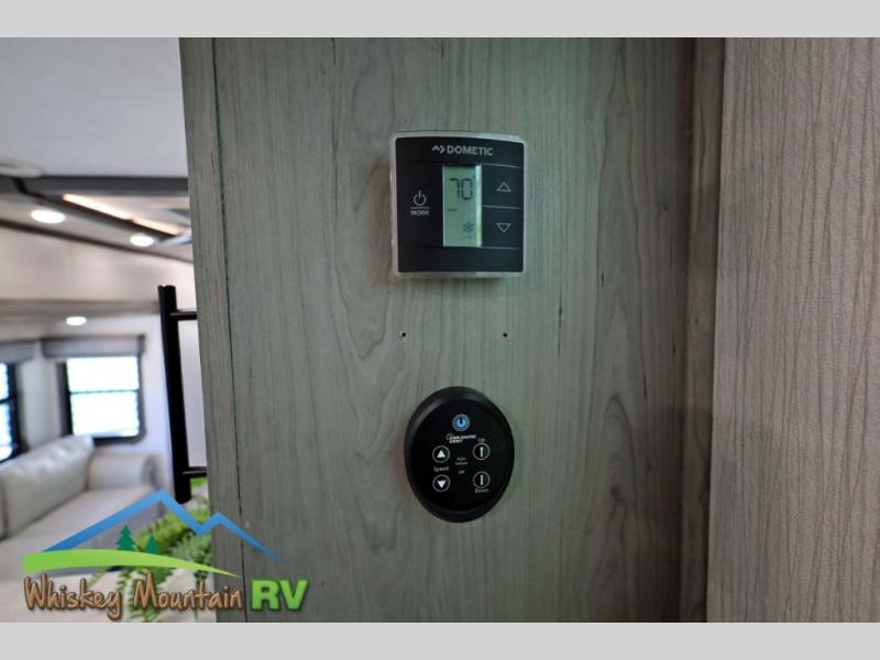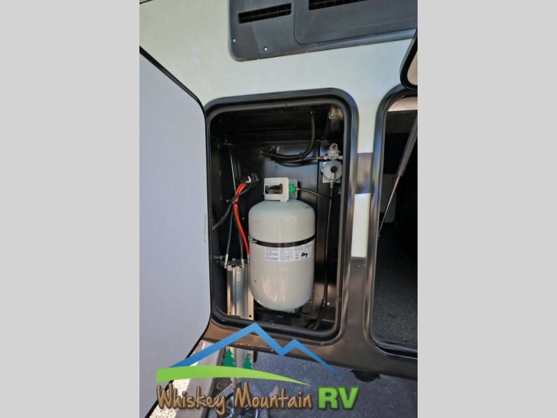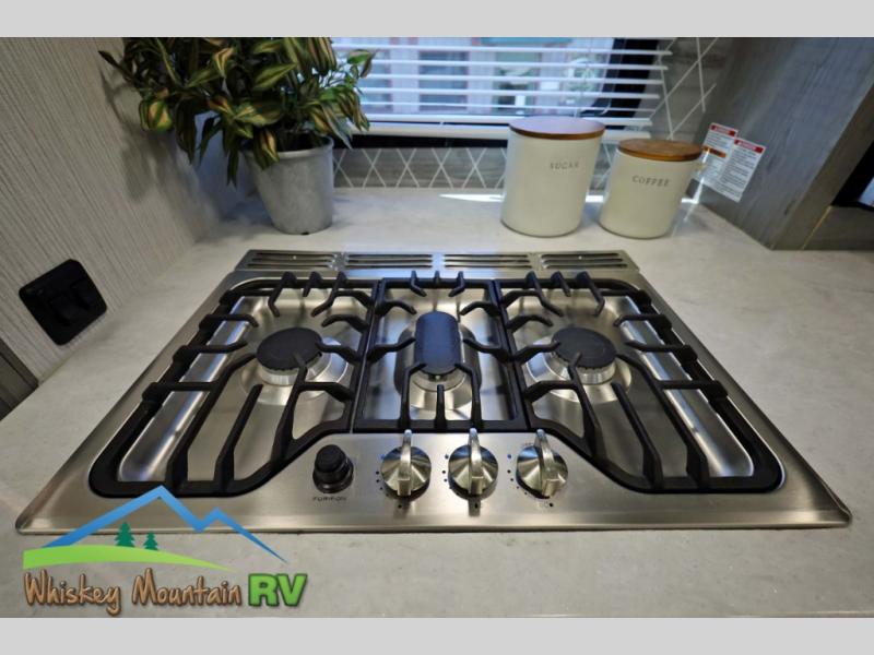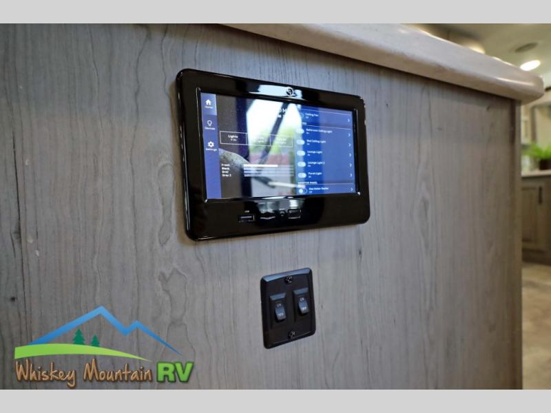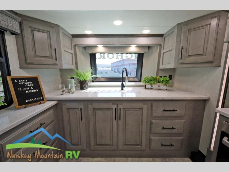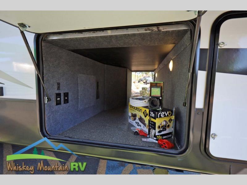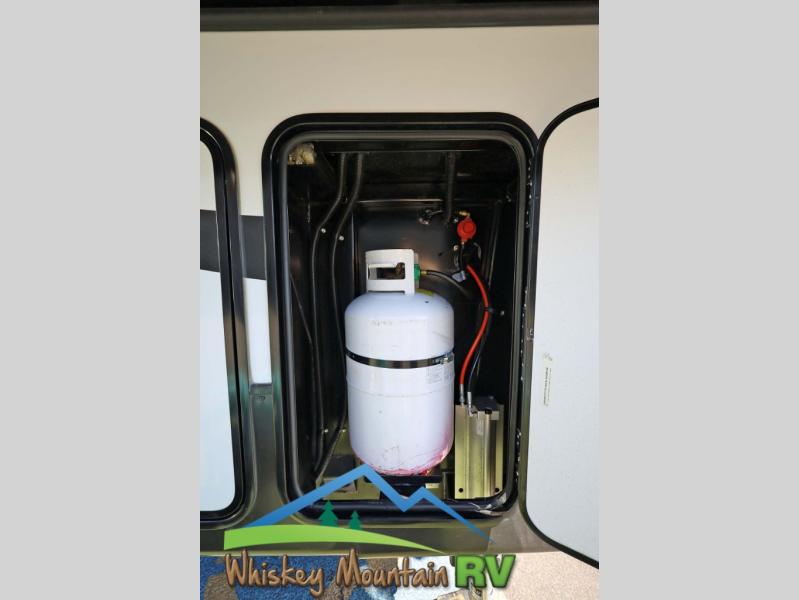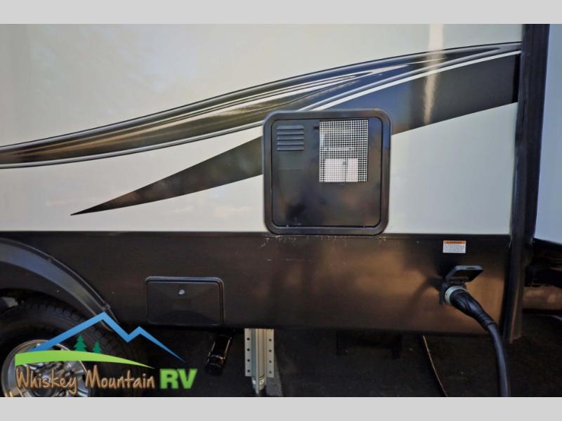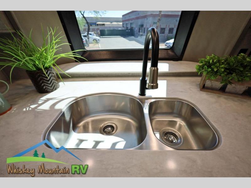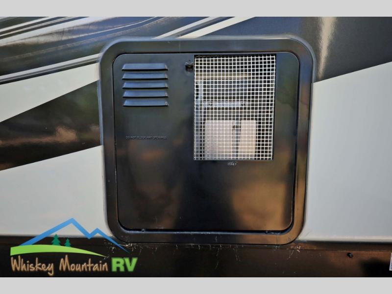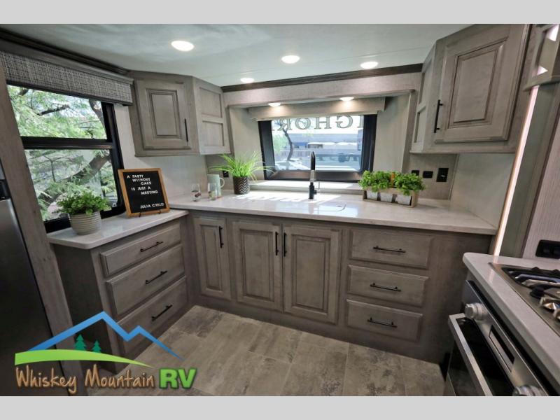 You will be amazed at all this fifth wheel has to offer! From the front raised kitchen with lots of counter space, the large, deep pantry, and breakfast bar counter with two bar stools overlooking the living and dining area to the spacious rear bedroom. The living area has a flip and fold sleeper sofa for you to take an afternoon nap on or relax at the power theater seating while others play card games at the standard dinette slide which can be switched out for the optional sofa. After a fun-filled day outdoors, head to the full bathroom and take a nice, hot shower in the shower with a teak seat. The rear private bedroom welcomes you to a good night's rest on the king bed slide, and if you choose to add the optional washer and dryer then you can have clean clothes throughout your entire trip!