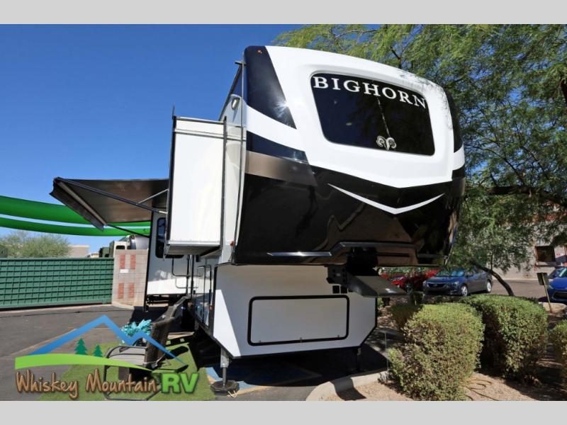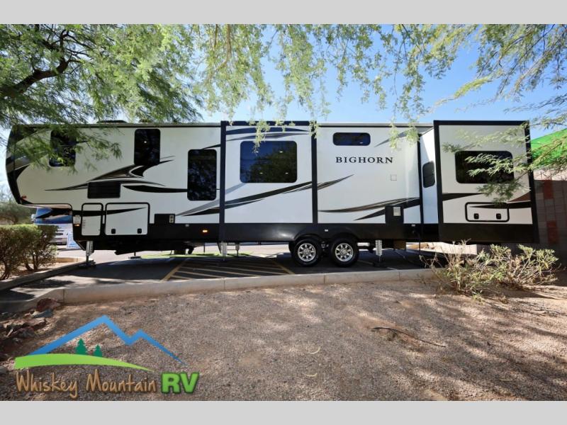 Every Heartland Bighorn fifth wheel will hold up to their reputation as an affordable yet sturdy RV! Each is built with a double-welded aircraft quality aluminum superstructure cage construction, in-house constructed laminated fiberglass sidewalls and 3" vacuum bonded laminated main and upper deck floors, plus seamless corrugated underbelly material. More construction features include the 6-point hydraulic landing gear and auto leveling system, color-coded Plumb-PLEX water lines, a heated and enclosed underbelly plus wrapped and insulated residential style heating ductwork to travel all year long. The interior offers spa baths with solid surface sinks, a marble-look shower, a removable shower head and a teak wood seat, plus 100% maple hardwood cabinetry and fascia, dual panoramic windows in the main slide, vinyl flooring on all main floors and woven flooring on slide floors, and residential features throughout.