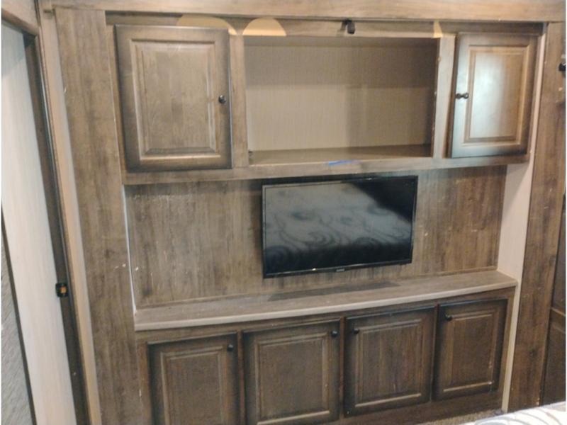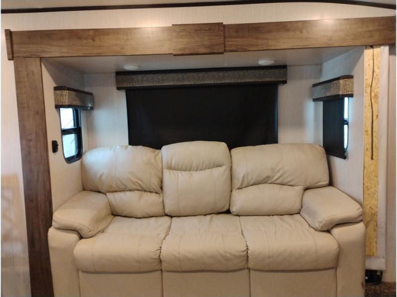 Why not be comfortable wherever you decide to live! This fifth wheel offers opposing sofas and power theater seating in the separate front living area which also includes an entertainment center and fireplace. The middle kitchen area is equipped with everything you will need to create home-cooked meals including a residential refrigerator, a kitchen island, extra counter space and a free-standing dinette to dine at. The cook will also love having the choice of cooking on the outside kitchen while everyone relaxes under the power awning. The full bathroom is near the second exterior entry as an added convenience, and it includes a cabinet prepped to add the optional washer and dryer. And you can fall quickly to sleep in the rear bedroom on your own king bed slide out.