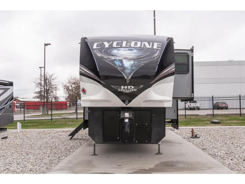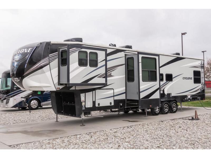 Used Heartland 5th Wheel for sale – 2021 Heartland Cyclone 4006 is approximately 45’ 0” feet in length, 3 slides and features Lippert Hydraulic leveling system, aluminum wheels, 3 A/C's, patio awning, door awning, pass through storage, baggage door side swing, black tank flush, water filtration system, power electrical reel, exterior shower, exterior TV, ladder, inverter, all electric coach, leather seating, washer/dryer, central vacuum, fireplace, multi-plex control panel, convection microwave, residential refrigerator, 3 burner gas range with oven and much more. For more details on this unit, our full inventory, brochures, window stickers, videos, photos, and customer reviews, visit MHSRV.com or call 800-335-6054 for the Texas location or 334-288-0331 for our Alabama location. At Motor Home Specialist, we DO NOT charge any prep or orientation fees like you will find at other dealerships. Read Thousands upon Thousands of 5-Star Reviews at MHSRV.com and See What They Had to Say About Their Experience at Motor Home Specialist. WHY PAY MORE? WHY SETTLE FOR LESS?