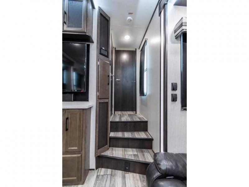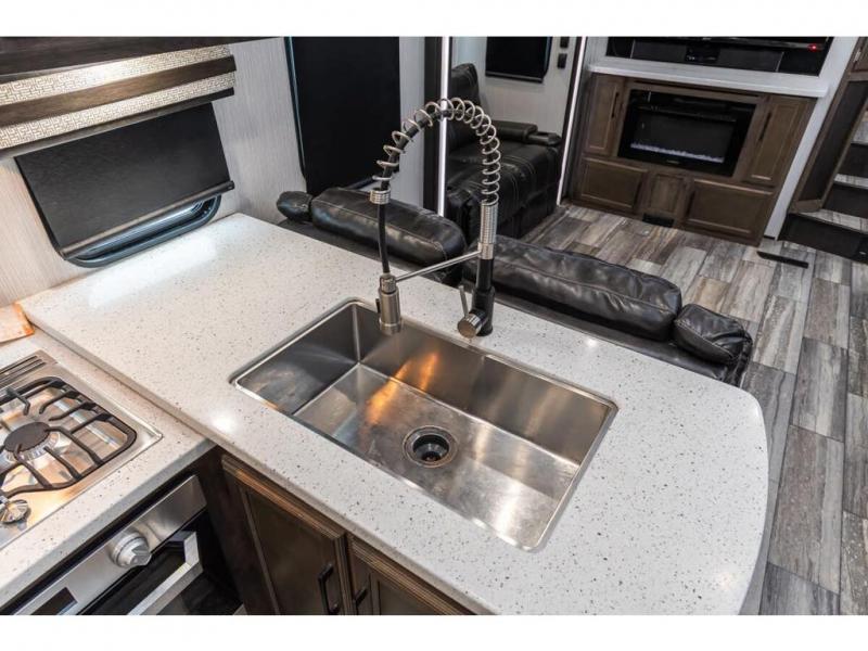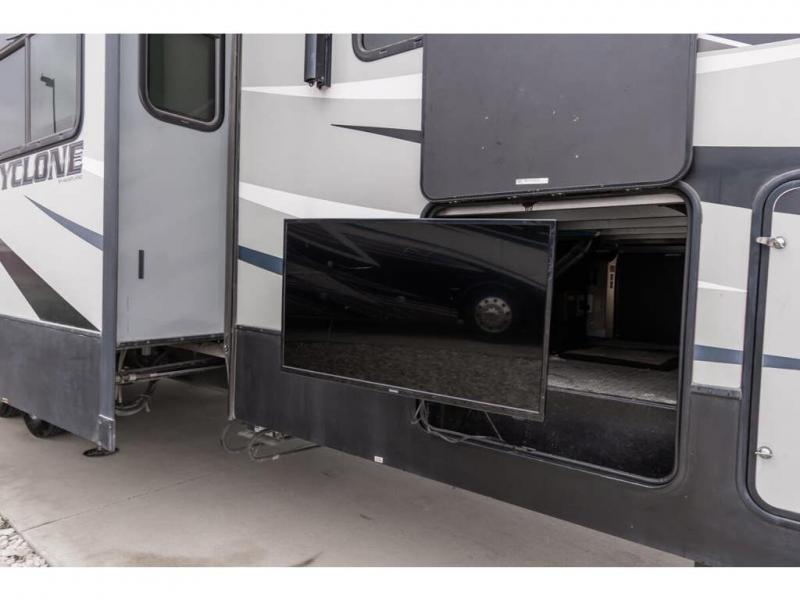Each one of these Heartland Cyclone fifth wheel toy haulers offer luxury, toy hauler capacity, and a residential look and feel! You will find comfort and convenience from the inside out starting with the "Swift Space" pull out dresser work station and the culinary kitchen work space to the patent pending Stor-Mor exterior storage with three-sided access to the basement with 30% more capacity for your gear. The adjustable sunlight blackout shades make it easy for you to take an afternoon nap so you can re-charge and get back to riding the trails. These units are strong, lightweight, weather and temperature resistant, and easy to haul with the Azdel laminated sidewalls and composite substrate. An ultimate outdoor kitchen combination is just waiting for you to grill up your best burgers while taking in your beautiful scenery!