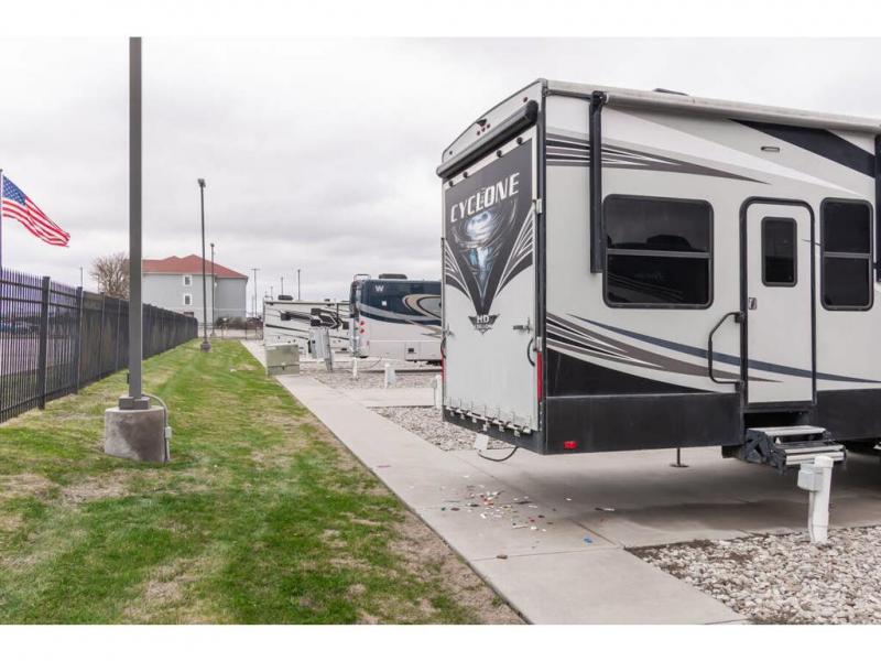 You won't want to camp any other way once you step inside this Cyclone 4006 toy hauler fifth wheel by Heartland RV! The front private bedroom is fit for a king with a tilting king bed, a front wall wardrobe, and access into the dual entry bath. You can relax in true comfort in the living area on either one of the three sofas while you enjoy the fireplace. The chef of your group will love having the extra counter space in the kitchen to prepare the delicious meals. Next to the half bath is an area that is prepped for you to add the optional washer and dryer, and the dual entry doors allow for a smooth flow of traffic in and out of the unit!