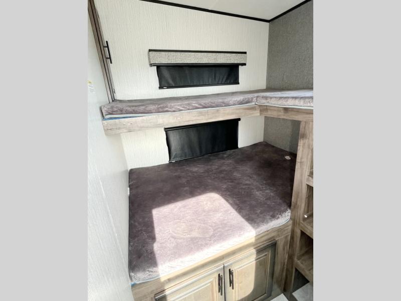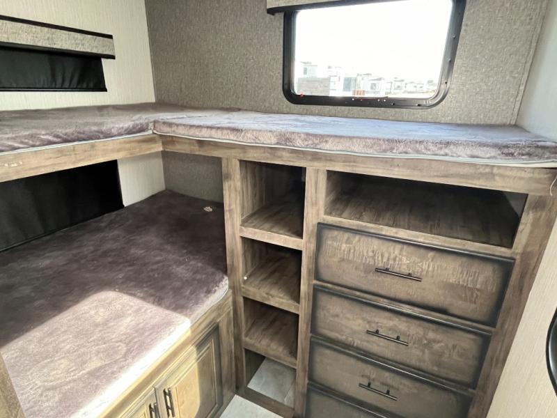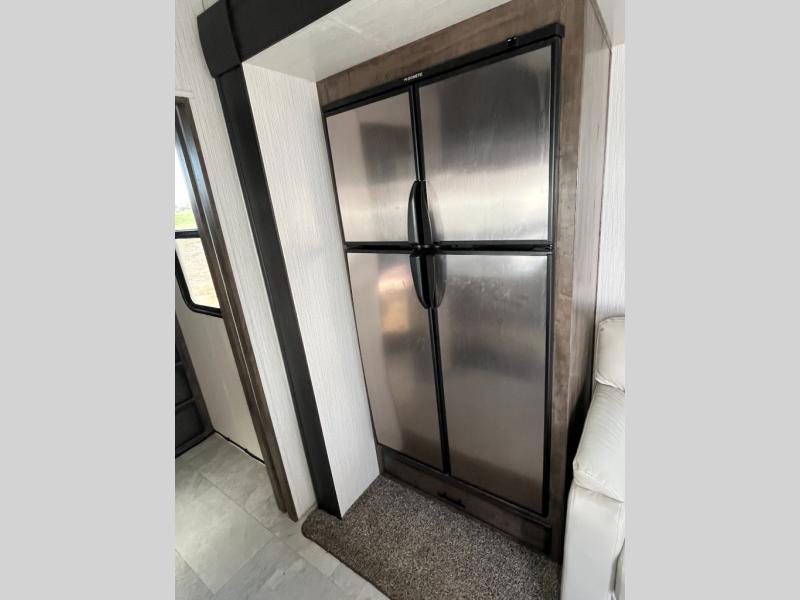 The whole gang can head to the campsite in this ElkRidge fifth wheel! The kiddos will have their own space with the rear private bunkhouse that has two bunk beds, and you will love your own master suite up front with a queen bed that has nightstands/shirt closets on either side and a wardrobe/dresser slide to keep your clothes looking nice. There is even an entrance into the dual entry bathroom which has a radius shower for everyone to freshen up in, and the outside shower will help to keep mud from being tracked inside too. The tri-fold sleeper sofa is a great place for an afternoon nap, movie night across from the Connex entertainment center with a 40" fireplace, and an extra sleeping space. The booth dinette slide is conveniently next to the 12 cu. ft. residential stainless steel refrigerator so you don't have to go very far for a re-fill!