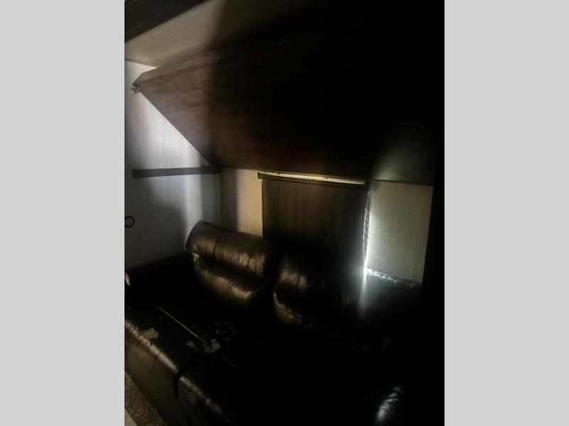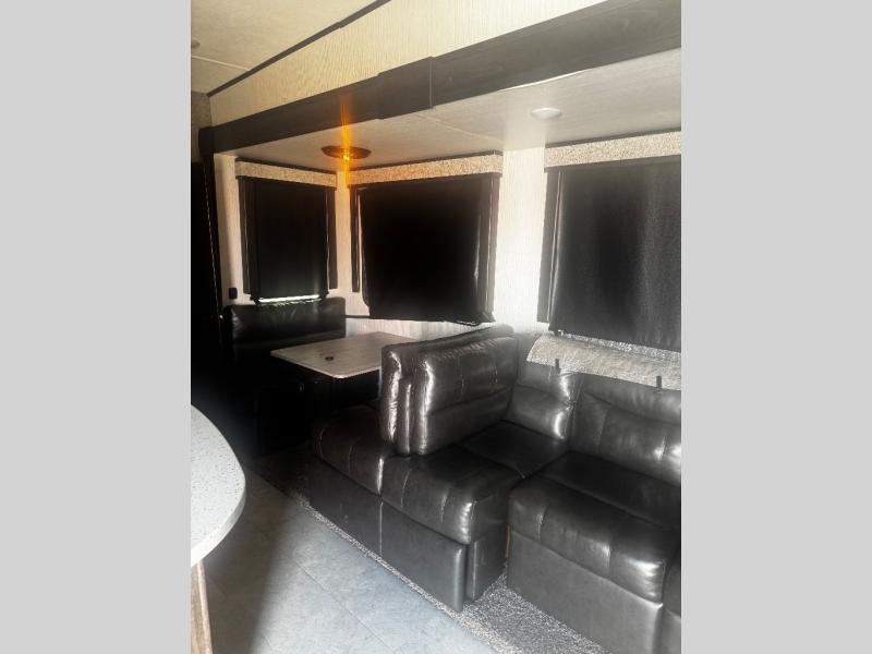 For extravagance beyond your imagination, you need this Elkridge fifth wheel. This unit is the perfect companion for those who enjoy traveling the countryside with family and friends because of the private bunkhouse that contains its own full bathroom and rear entry into the trailer, as well as the front private bedroom with its king bed slide and walk-in closet. This entire unit has plenty of space for living and sleeping because of the five slides that have been installed throughout the interior, and the breakfast bar will be your favorite place to spend your mornings sipping a cup of hot coffee and eating a plate of scrambled eggs.