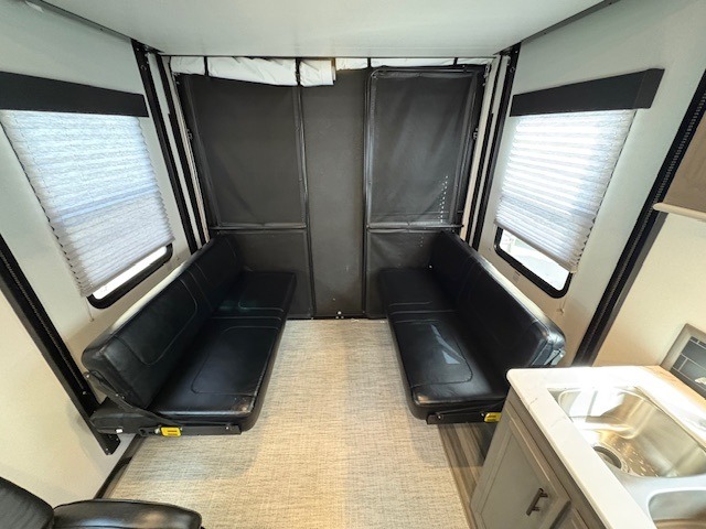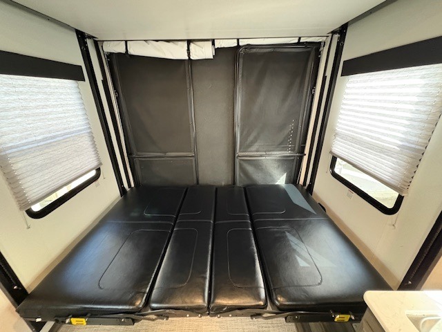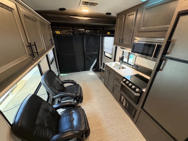 This Fuel toy hauler is big enough for extra guests to join! You will feel right at home in the front private bedroom with a king bed slide that has wireless phone charging ports on the nightstands, two dressers, and a wardrobe to keep your clothes looking nice, plus an entrance into the dual entry bathroom. You can prepare a delicious home cooked meal on the three burner cooktop, store any leftovers in the 8 cu. ft. stainless steel refrigerator, and easily clean up with the double stainless steel sink that has a residential style faucet. The two recliner chairs welcome you to a relaxing evening by the entertainment center, and the queen bed lift is above a dual hinge couch for your convenience!