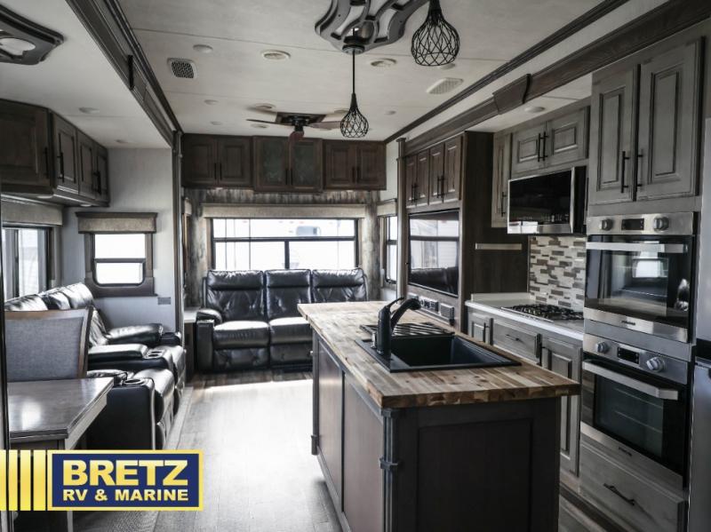 You will be able to make memory after memory with this Landmark 365 fifth wheel! The large opposing slides are what create an open and inviting space in the back of this unit so that you can gather with friends on the sofa with end tables while you watch something on the TV with soundbar. Plus, if you are in the kitchen creating a delicious meal on the three-burner gas cooktop or washing dishes in the farmhouse sink, you can still be a part of the fun. You can also use the free-standing table with chairs to sit down and eat dinner or play a game later on.