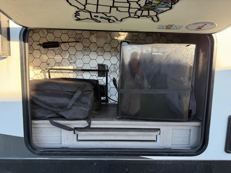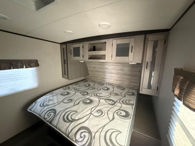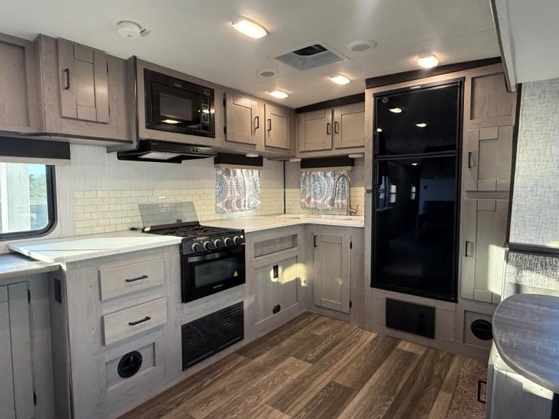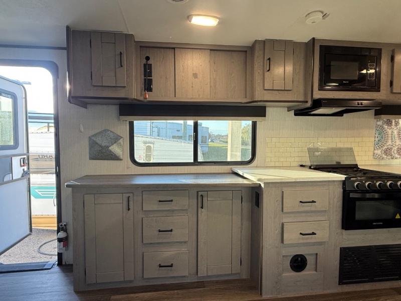 As you look inside and outside, you will find everything needed to enjoy your camping trip to its fullest with this Mallard travel trailer! There is a large slide in the main living area with a booth dinette and sofa, and on the exterior is an outdoor kitchen with slide cooktop and a 17' power awning with LED lighting. Back on the interior, there is also a second sofa for another member to lie down and recharge in the afternoon while the chef makes lunch indoors with lots of counter space and all the appliances necessary to make any type of meal. You can get cleaned up in the full bathroom before retiring to your private bedroom with a king bed while your guests sleep on the furniture once set up for nighttime.