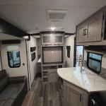 Imagine having two entry doors in your next travel trailer allowing you to have easy access to the full bathroom when you are outside or inside! This Mallard travel trailer provides you with that and more. There's something for everyone between the rear private bunkhouse with an entertainment center, two bunks, and seating, the exterior kitchen to grill up some juicy burgers while enjoying the sunshine, and the U-shaped dinette that can be used for meal time, game time, and bed time. You will even have your own private retreat when you head into the front private bedroom which features a king bed and overhead cabinets!