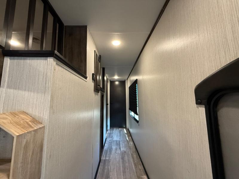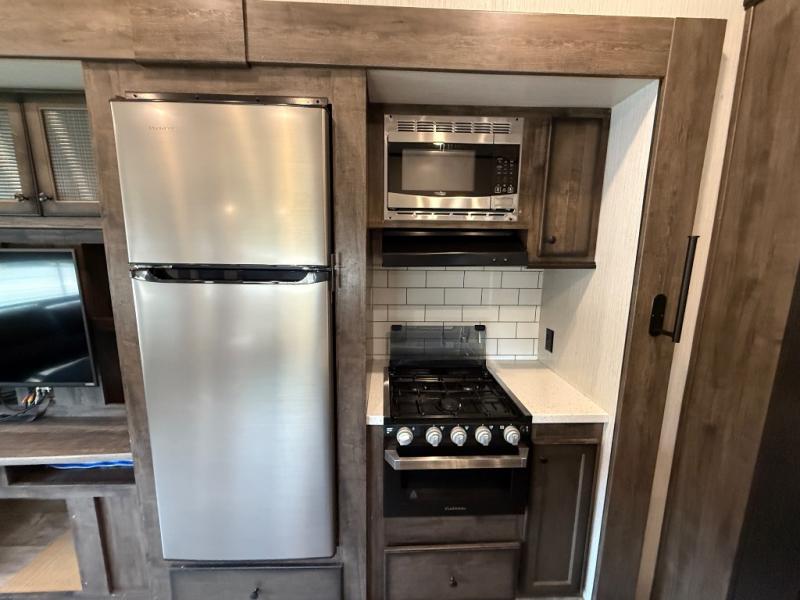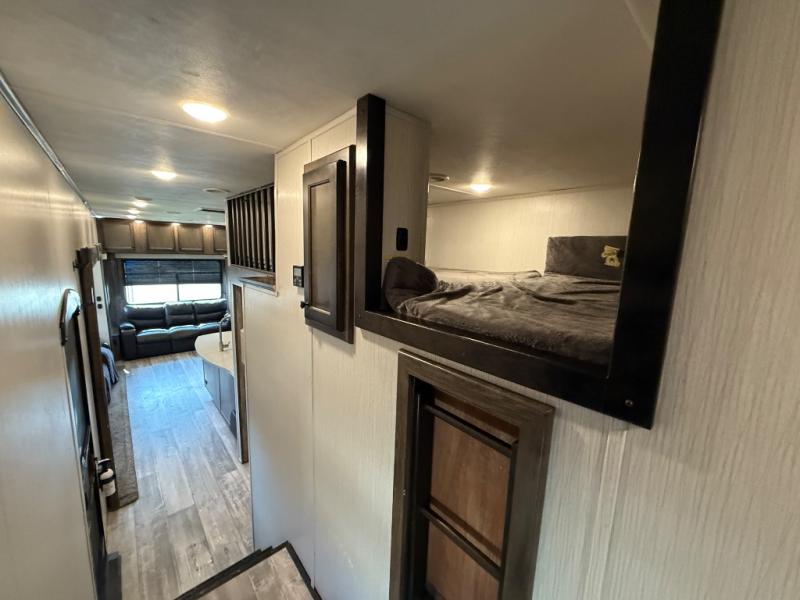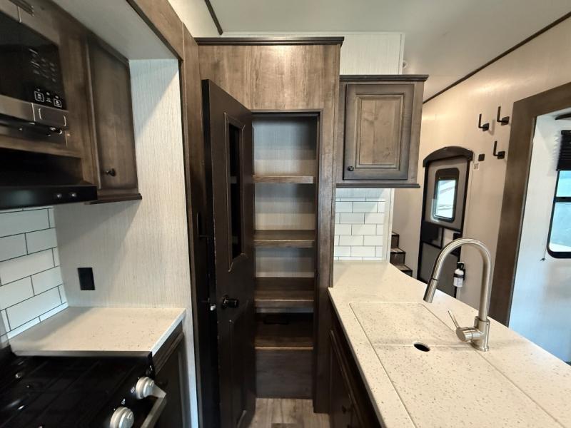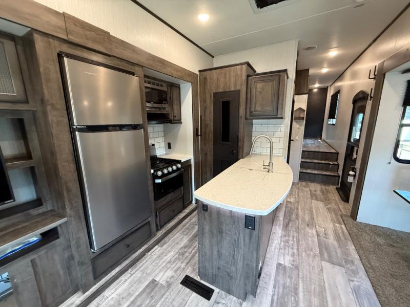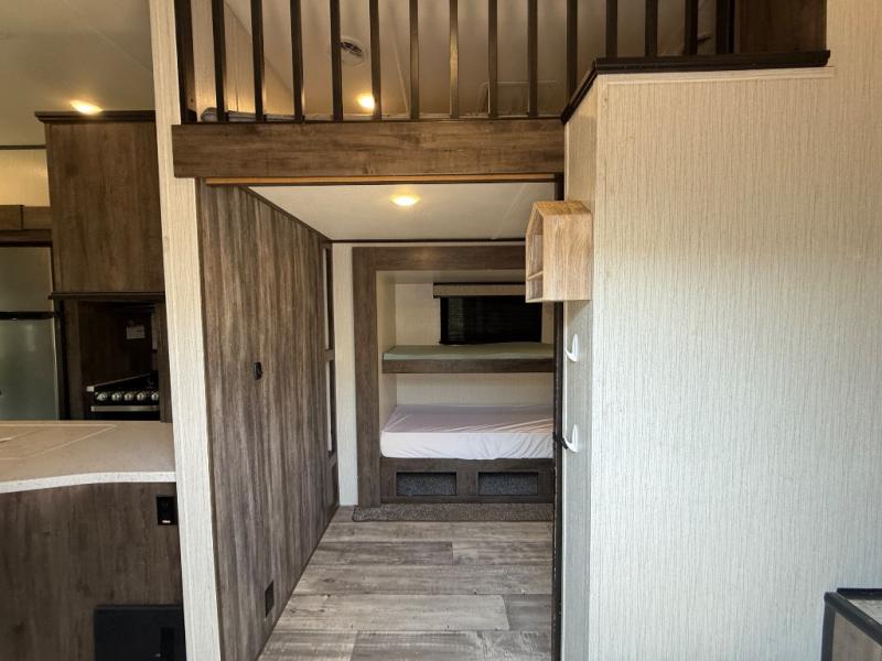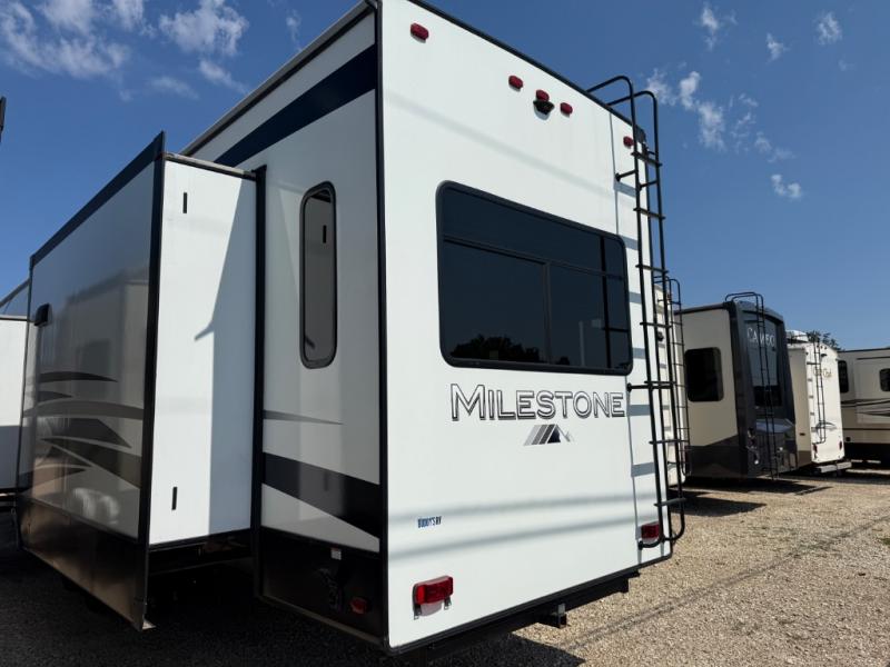 Imagine the kids laughing and visiting about their day as they sleep in the middle bunkhouse which also includes a half bath and storage for their things in this Milestone fifth wheel. If they invited their friends, the loft offers more sleeping space, and you will have your own master bedroom with a walk-around bed and a wardrobe slide. The rear living area provides a sofa and theater seating to relax on, and you will find all the kitchen appliances you will need including a residential refrigerator to store lots of cold food for everyone. The kitchen peninsula countertop is a great place to prepare and serve meals, and the pantry will hold lots of ingredients and snacks.