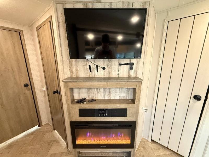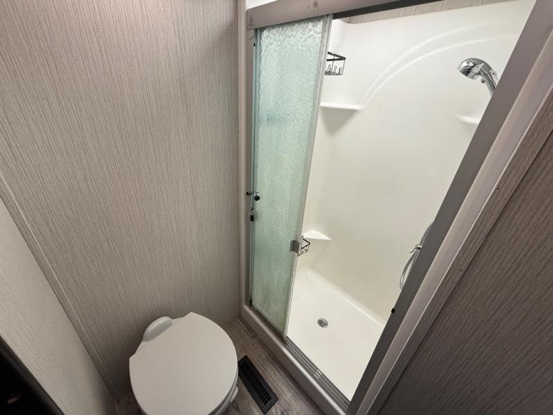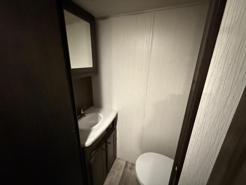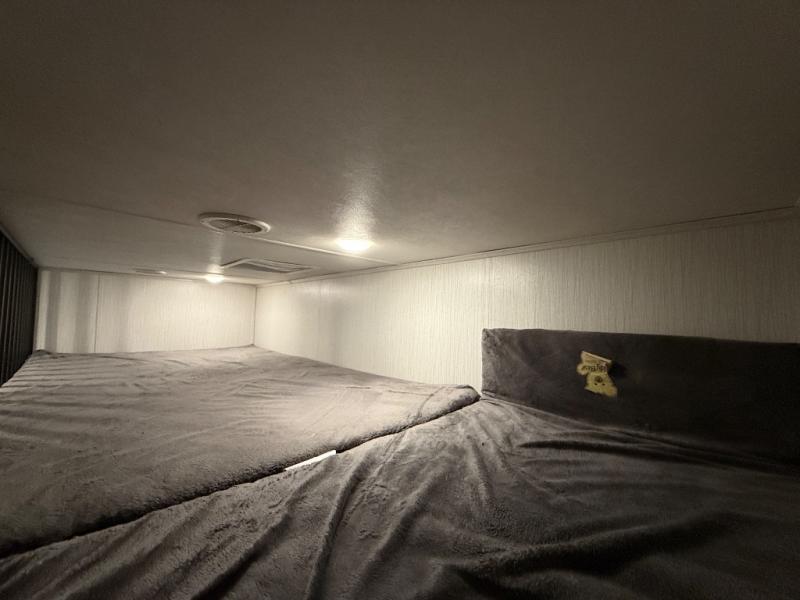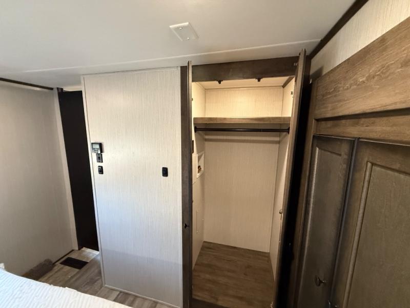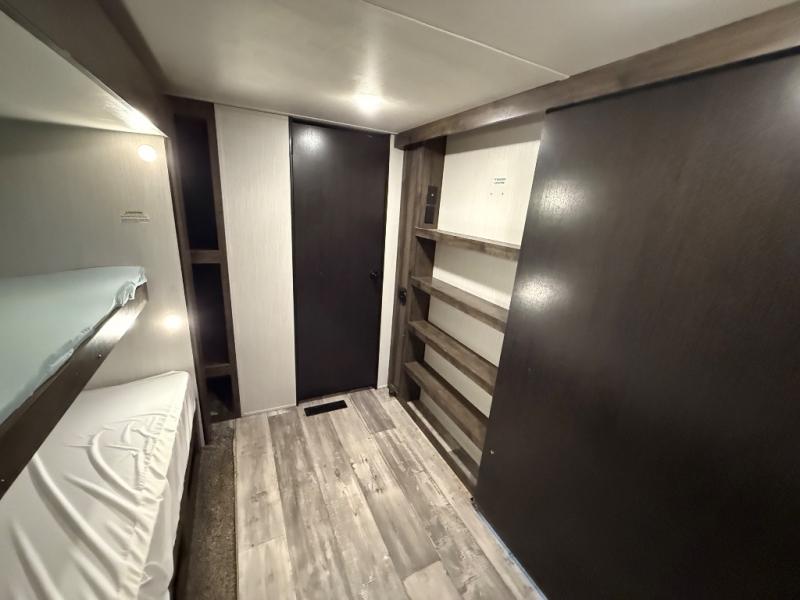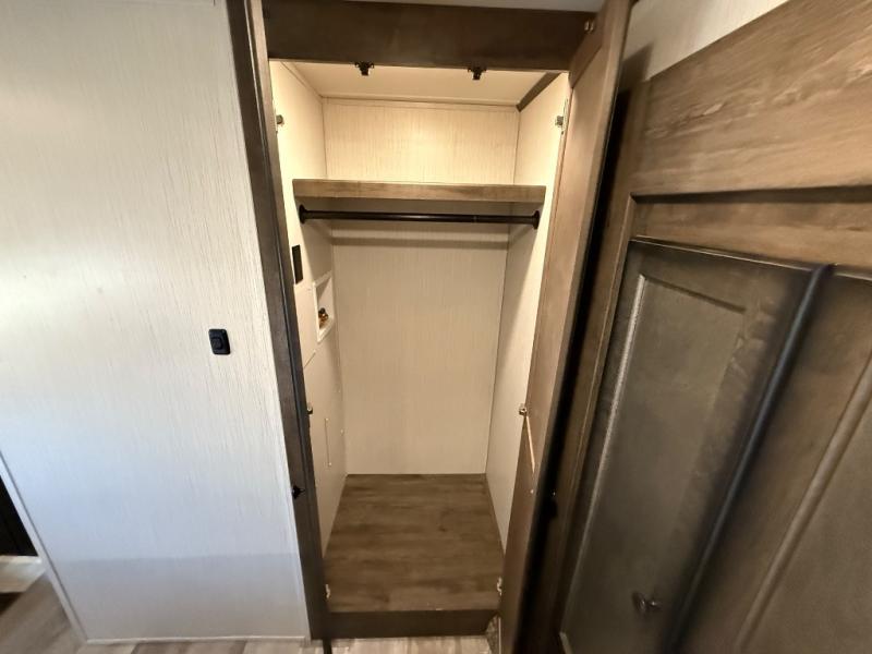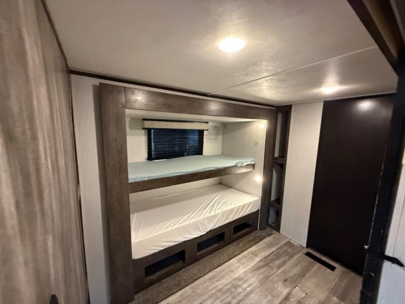 Imagine the kids laughing and visiting about their day as they sleep in the middle bunkhouse which also includes a half bath and storage for their things in this Milestone fifth wheel. If they invited their friends, the loft offers more sleeping space, and you will have your own master bedroom with a walk-around bed and a wardrobe slide. The rear living area provides a sofa and theater seating to relax on, and you will find all the kitchen appliances you will need including a residential refrigerator to store lots of cold food for everyone. The kitchen peninsula countertop is a great place to prepare and serve meals, and the pantry will hold lots of ingredients and snacks.