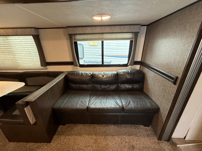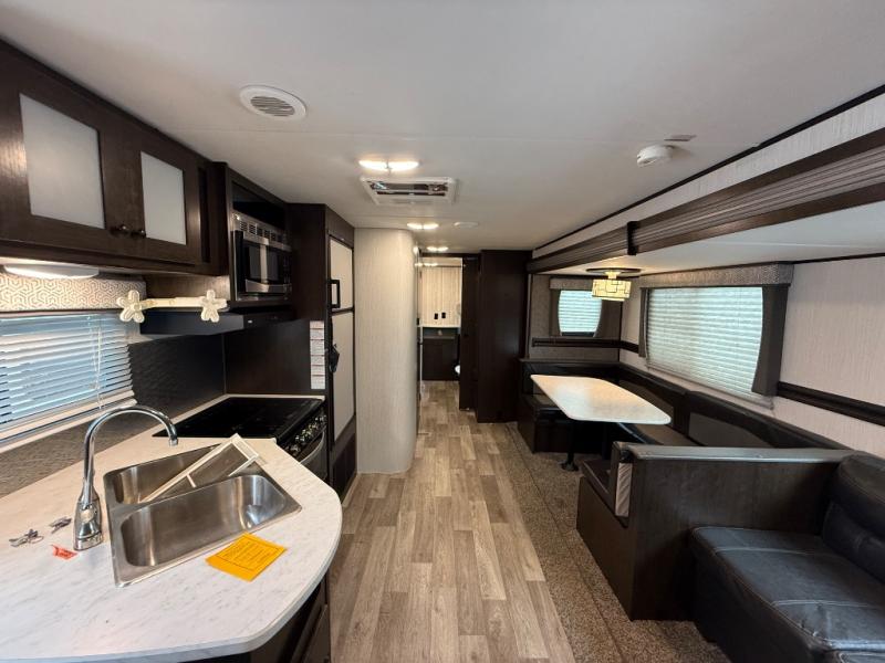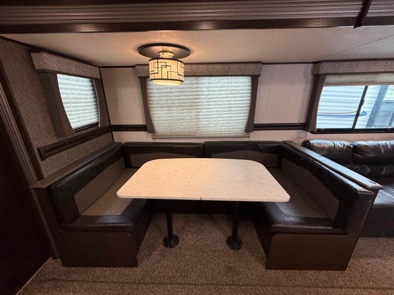 The whole family will have a comfortable place to sleep in this travel trailer! It features a front private bedroom with a queen bed for mom and dad, and a rear private bunkhouse for the kiddos. Inside the bunkhouse is a set of double bunk beds and a bunk bed above a kiddie dinette. You can prepare a delicious home cooked meal with the three burner cooktop then enjoy it at the U-shaped dinette. If you stuffed yourself too full, head to the sofa and relax for a bit or take a relaxing shower in the full bathroom!
