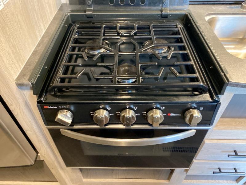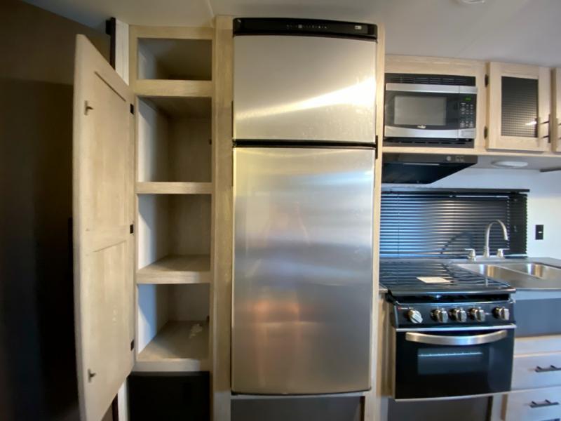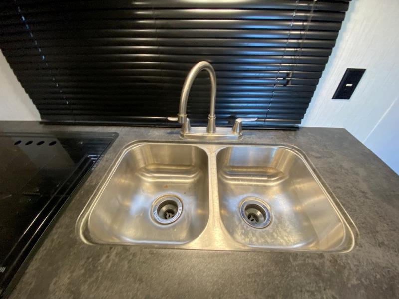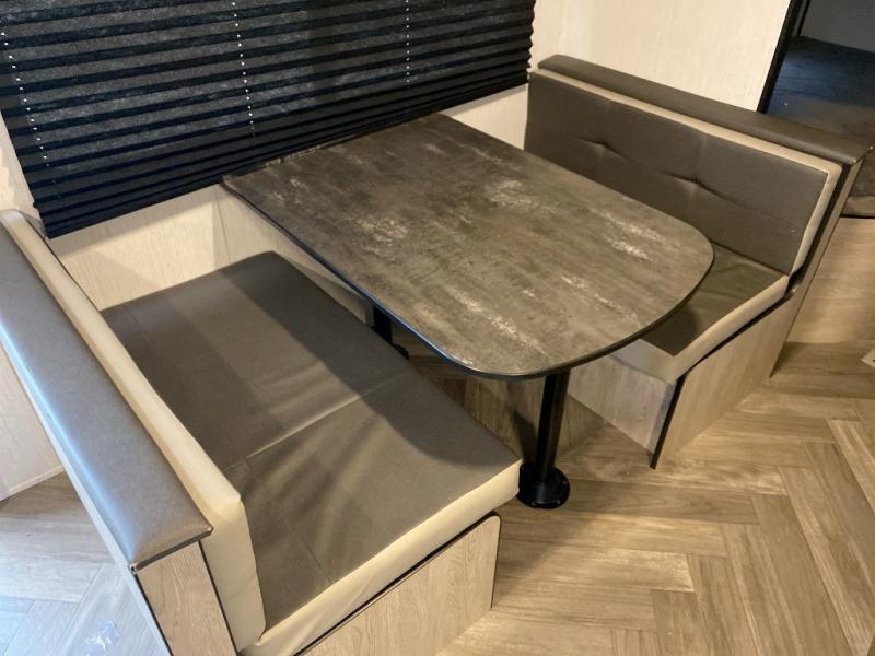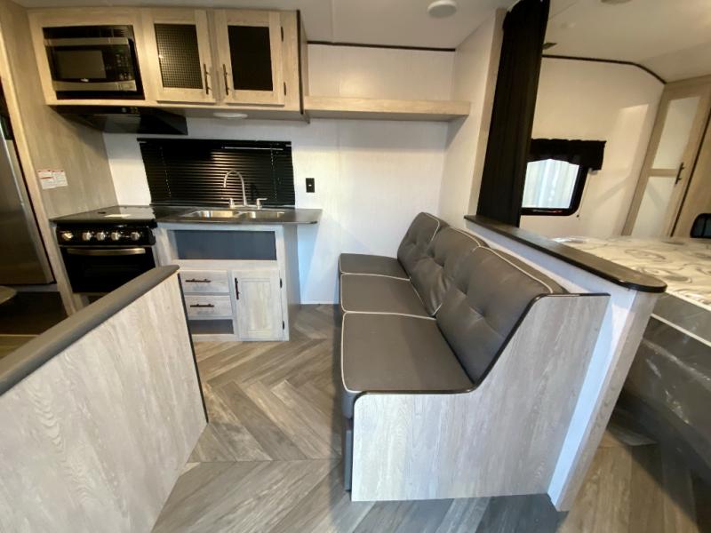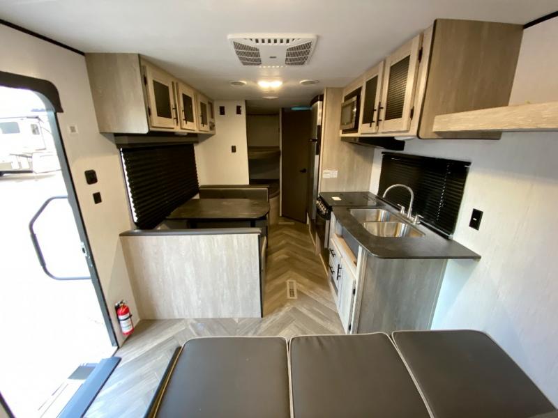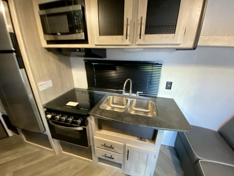 Adventure awaits you in this travel trailer that can sleep seven people each night, so invite the grandkids or friends along! They will love the bunk beds that include a double bed below and a single bunk above, plus the full bath is right next to the bunks for nighttime convenience. The chef of the group can whip up a hearty breakfast on the three burner cooktop, and clean up will be a breeze with the stainless steel residential style sink. After you've spent your day outdoors, cool off inside and relax on the sofa or play a game at the booth dinette. You may even want to rest on the queen bed in the front bedroom before starting dinner.