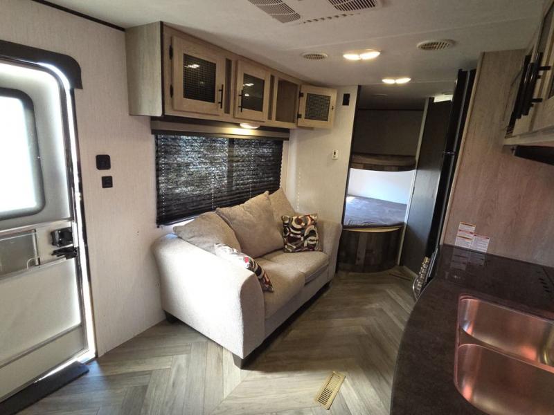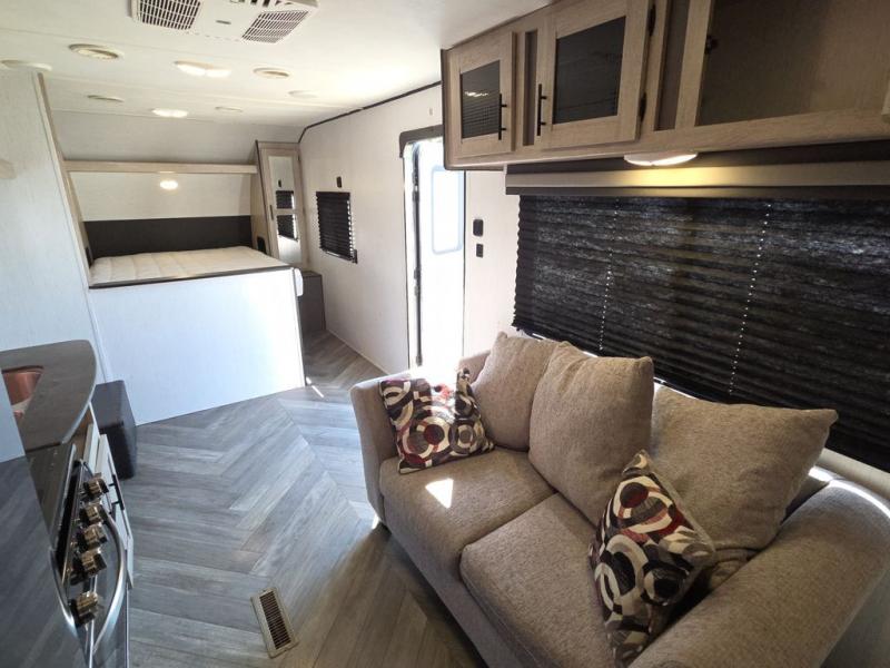Adventure awaits you in this travel trailer that can sleep seven people each night, so invite the grandkids or friends along! They will love the bunk beds that include a double bed below and a single bunk above, plus the full bath is right next to the bunks for nighttime convenience. The chef of the group can whip up a hearty breakfast on the three burner cooktop, and clean up will be a breeze with the stainless steel residential style sink. After you've spent your day outdoors, cool off inside and relax on the sofa or play a game at the booth dinette. You may even want to rest on the queen bed in the front bedroom before starting dinner.