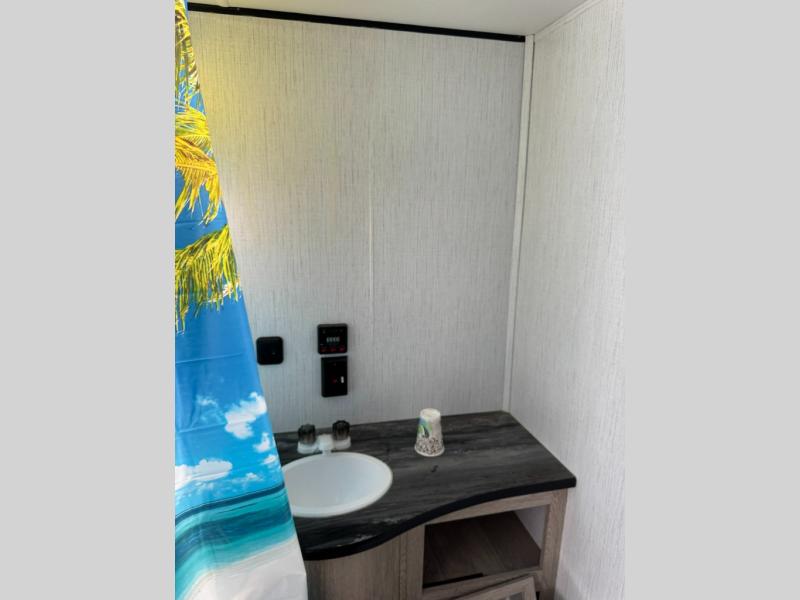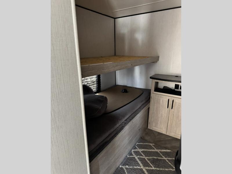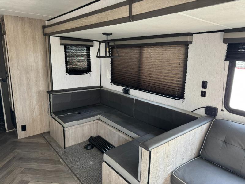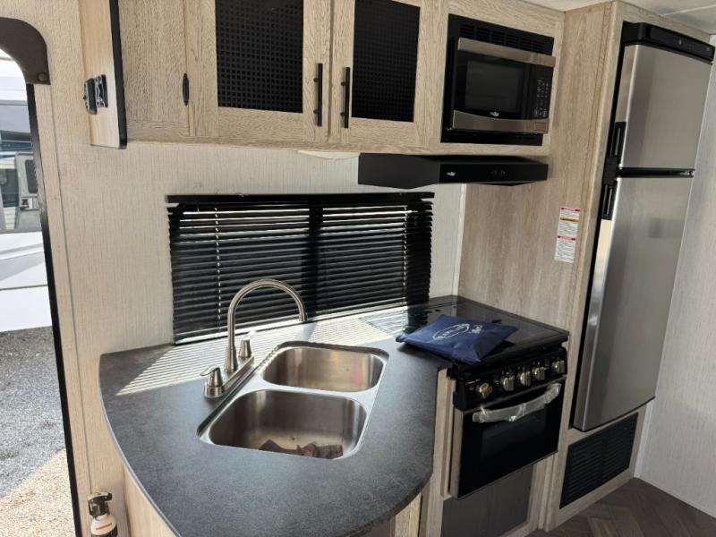 Now you can invite the grandkids along or your friends on camping trips since this travel trailer includes a private bunkhouse just for them! They will have three bunks to choose from, plus a dinette that can be converted to sleeping space at night. You and your spouse will sleep soundly on the queen bed in the front private bedroom, and any additional guests can sleep on the sofa or U-shaped dinette within the large slide out. The chef of the family can prepare eggs and bacon on the flush mount three burner cooktop in the morning before you all head out on a trail, and the full bath will allow everyone to clean up when you return!