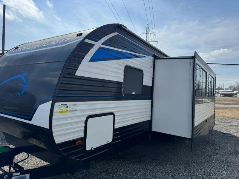 With any Prowler travel trailer by Heartland you will enjoy years of use and memories thanks to the performastructure aluminum front wall that deflects water and wind, and is 60% thicker than most competitors. The in-floor ducted heat, systems monitor panel, and finished pass-through storage are just a few features that will make camping easier than ever. Each travel trailer includes an extra large living room skylight to let natural light in, USB charging ports throughout to keep your favorite gadgets charged, plus stainless steel appliances in the kitchen for a more sleek look. The EZ clean interior with no carpet features full linoleum on the main floor and slide outs for hassle-free cleaning, plus you will stay cool during the hot summer months with the efficient H Blast AC system. There are also many options to choose from to further customize your camping experience, like the easy button set up with power stabilizer jacks and a power lighted tongue jack, an exterior shower, a second A/C on select models, and more!