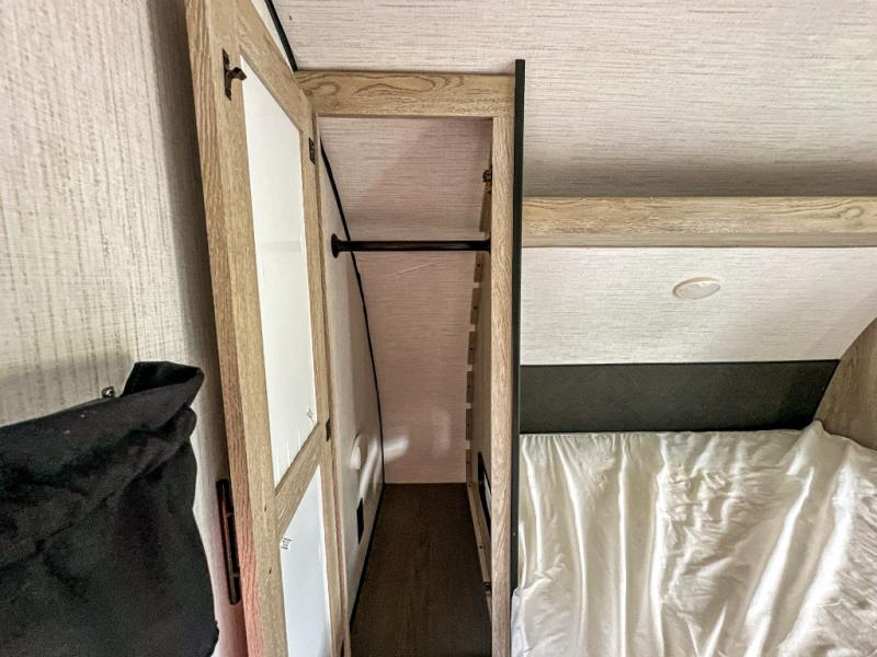 One step inside this travel trailer, and you may never want to go home! The large private bunkhouse includes its own slide for more space, three bunks, plus game chairs so the kids or your guests can hang out. The spacious full bath is nearby, plus it has its own exterior entry door for convenience. Everyone can meet in the main living area that includes the second slide out, a sofa, and a U-shaped dinette perfect for game night. This model also includes an at-home kitchen with a three burner cooktop, a microwave oven, and a residential style sink to make clean-up a breeze. And don't forget about the front private bedroom with a queen bed for you and your spouse!