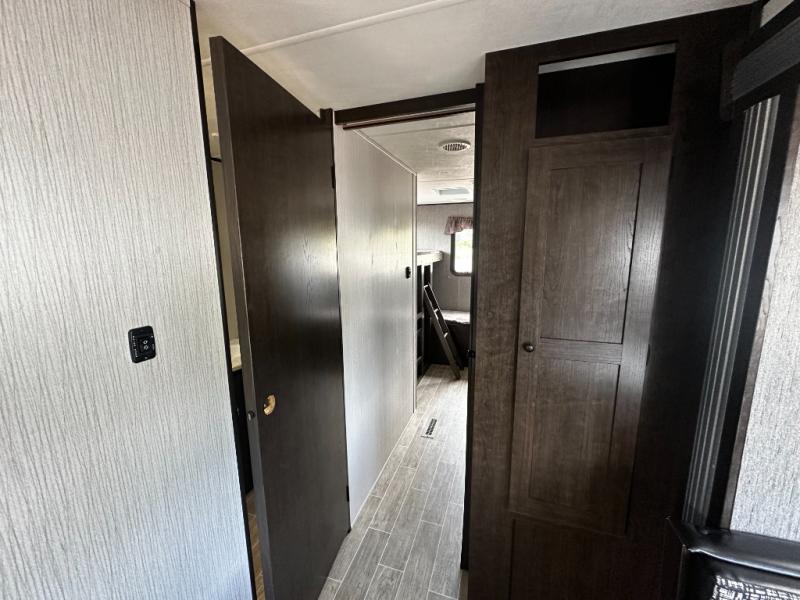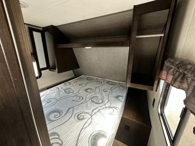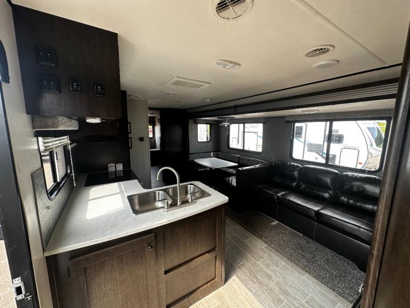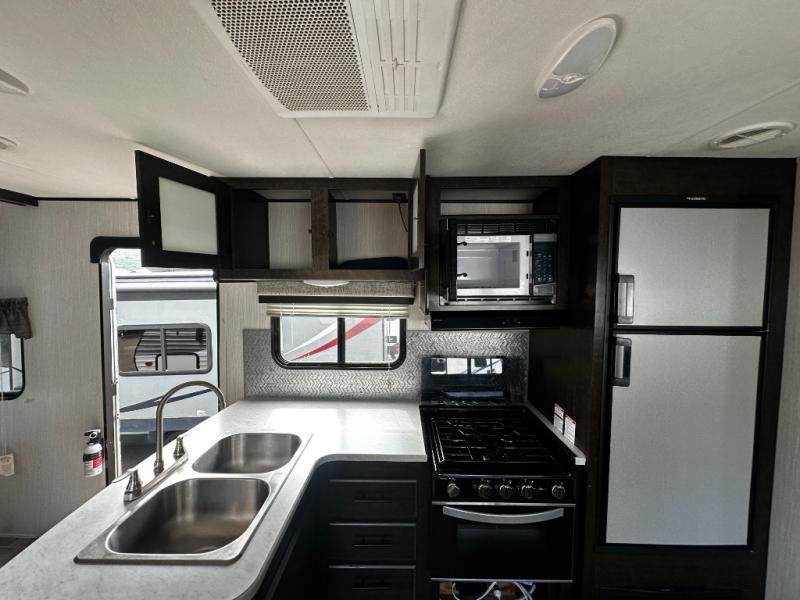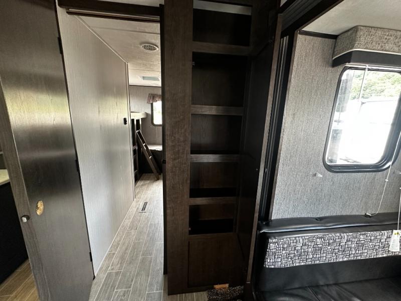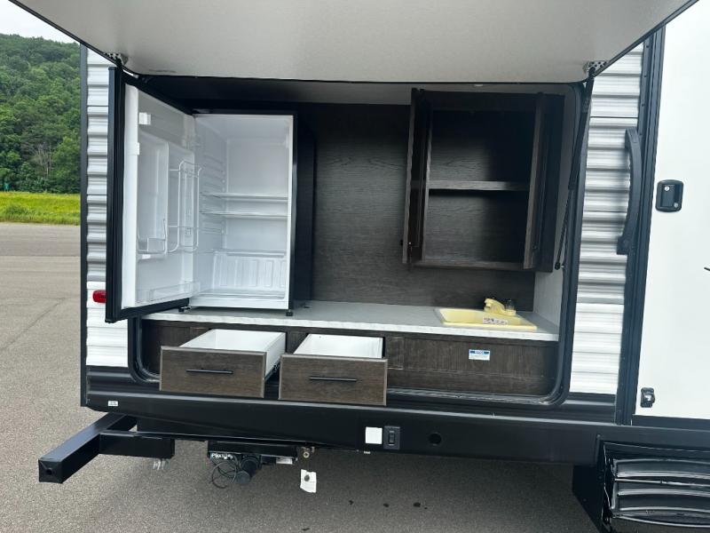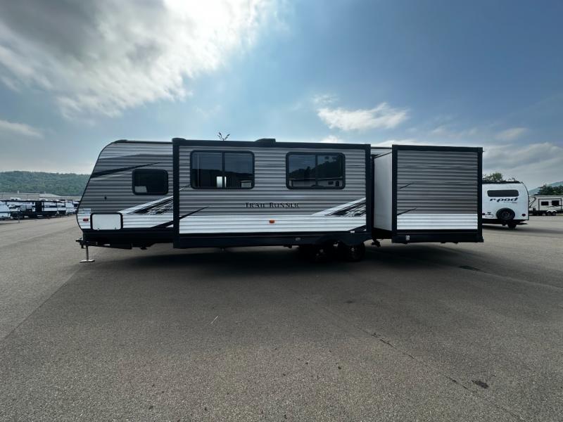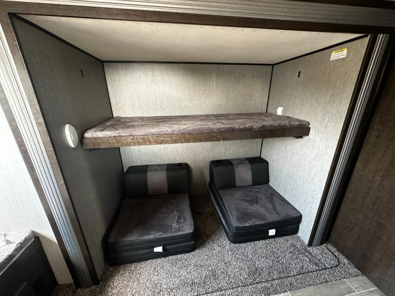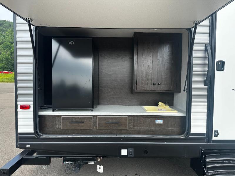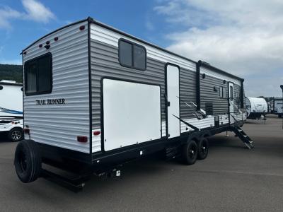 This Trail Runner is the trailer of doubles, from the double slides to the double entry doors. There are also double kitchens - one inside with stainless steel appliances, and one outside. The hardest decision that you will have to make is where to make your food. The outside kitchen features a sink, refrigerator, and an overhead cabinet. The handy second exterior entry leads directly into the bathroom so that you don't have to walk all the way through the kitchen and living area. And in the private bunkhouse, your kids or guests will enjoy their own space with triple bunk beds, game chairs and storage.