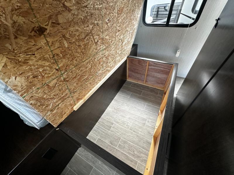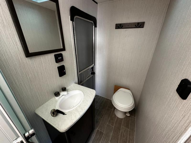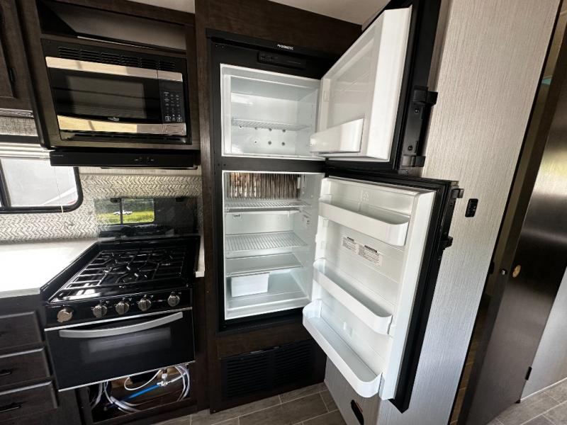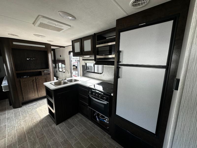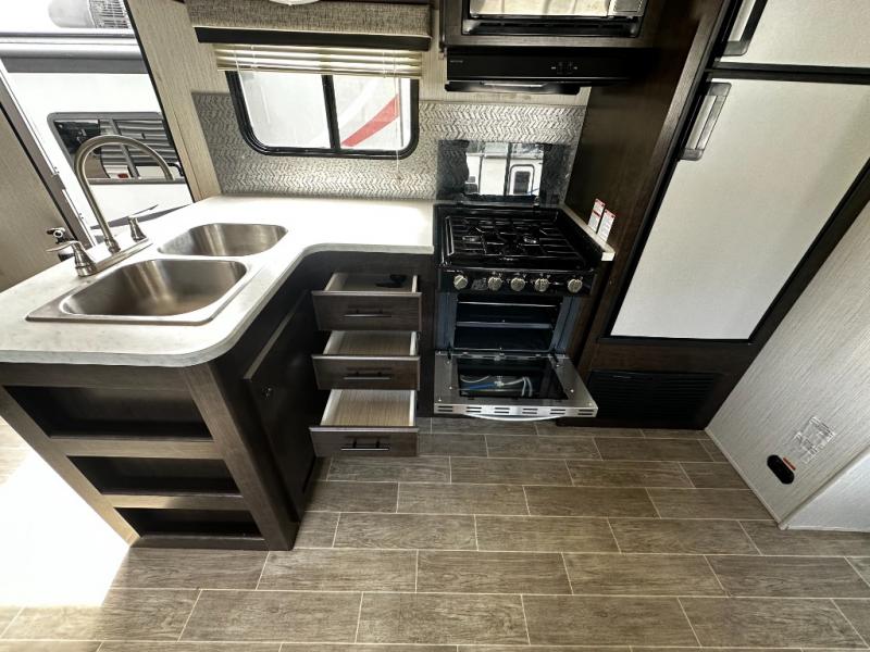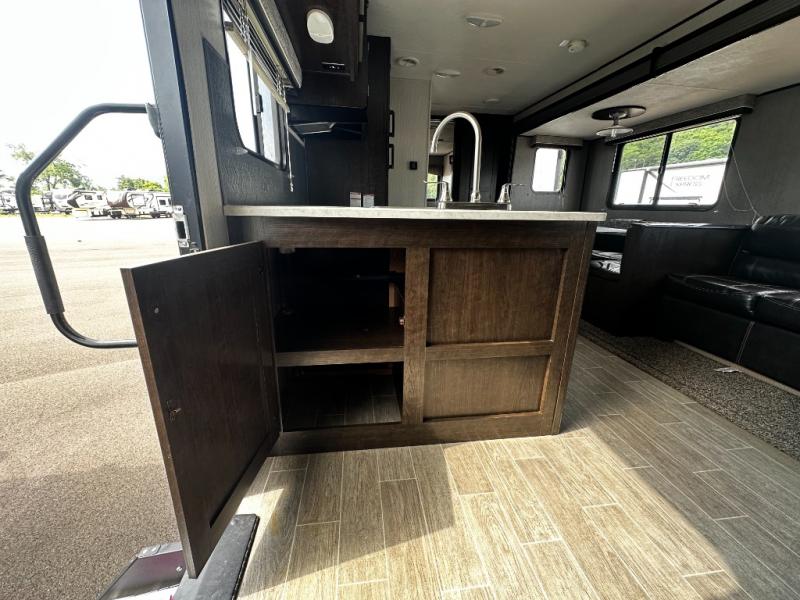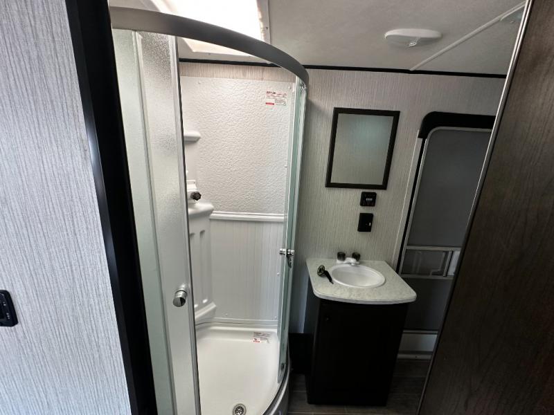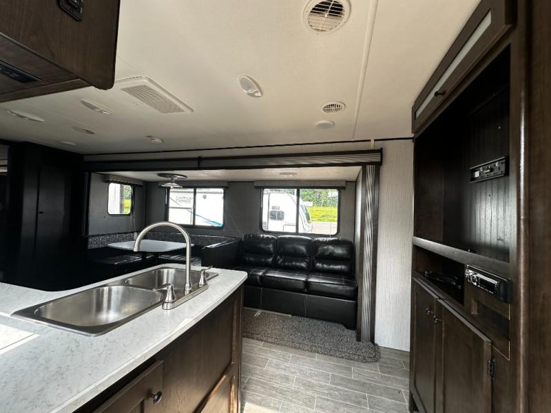 This Trail Runner is the trailer of doubles, from the double slides to the double entry doors. There are also double kitchens - one inside with stainless steel appliances, and one outside. The hardest decision that you will have to make is where to make your food. The outside kitchen features a sink, refrigerator, and an overhead cabinet. The handy second exterior entry leads directly into the bathroom so that you don't have to walk all the way through the kitchen and living area. And in the private bunkhouse, your kids or guests will enjoy their own space with triple bunk beds, game chairs and storage.