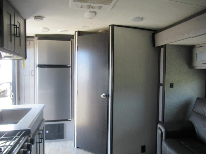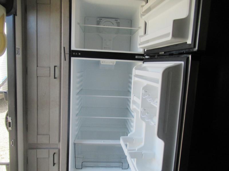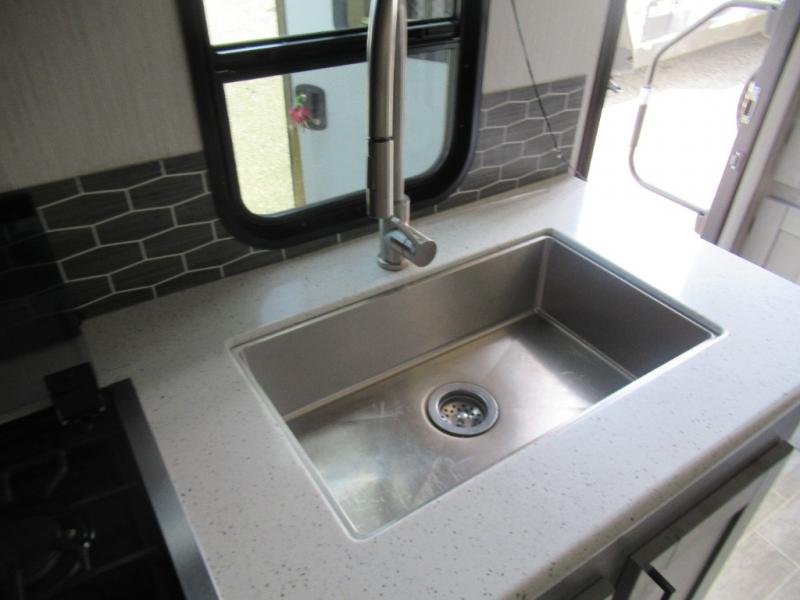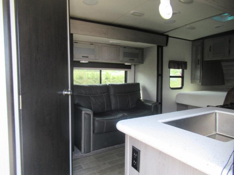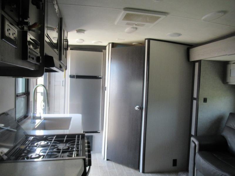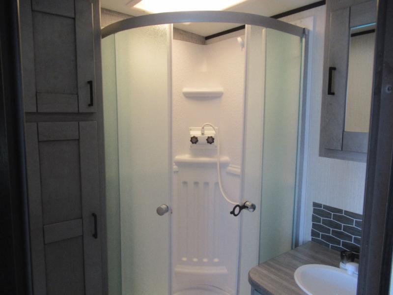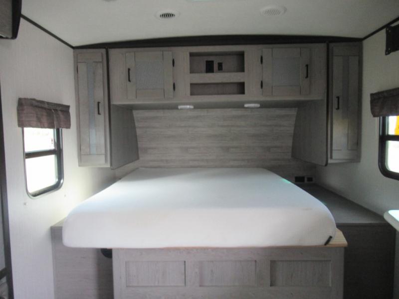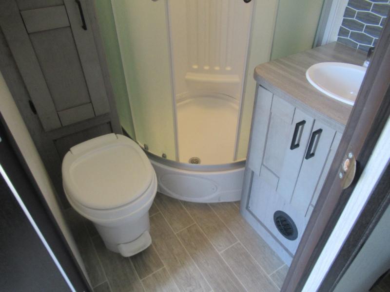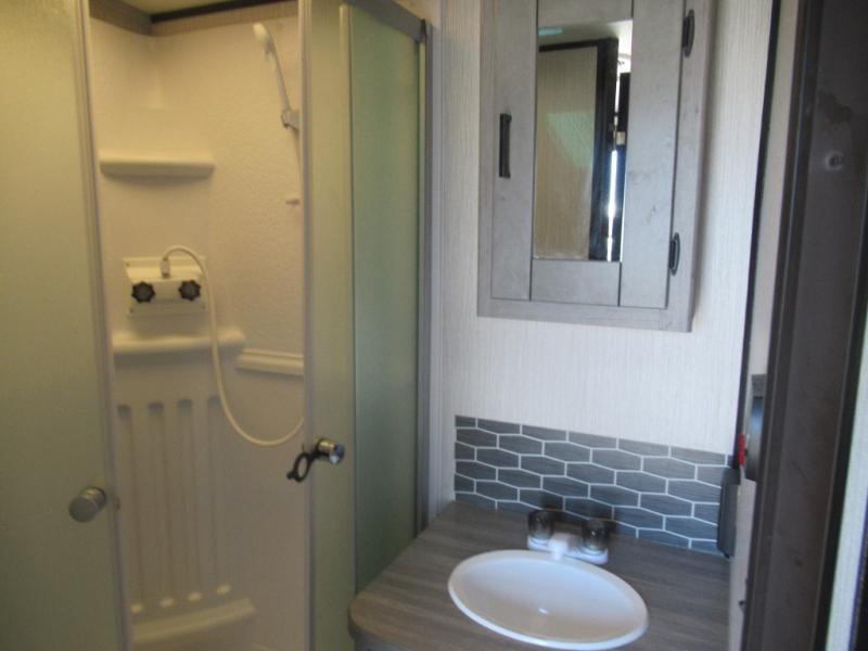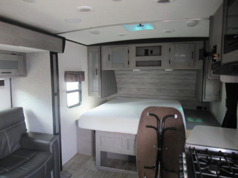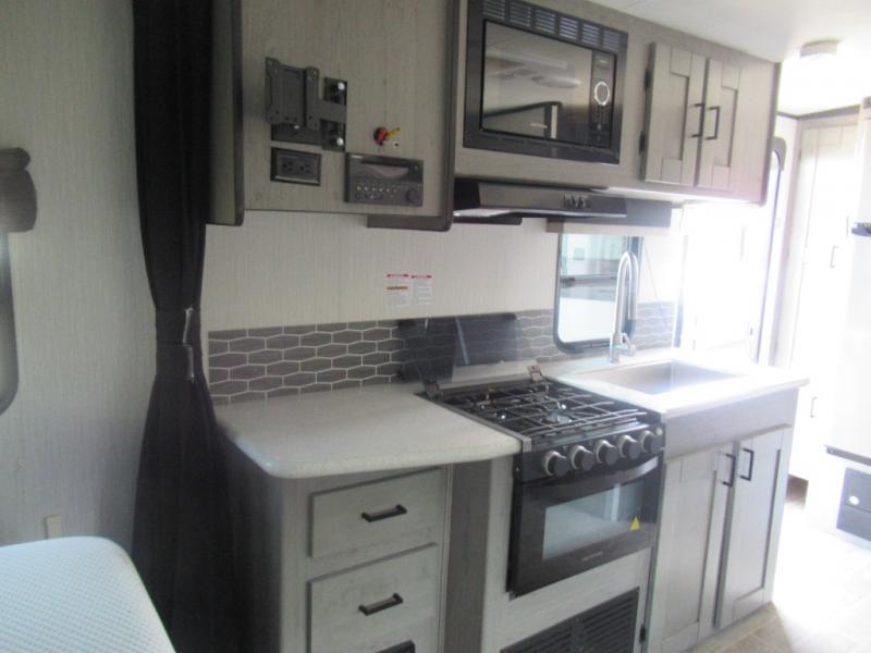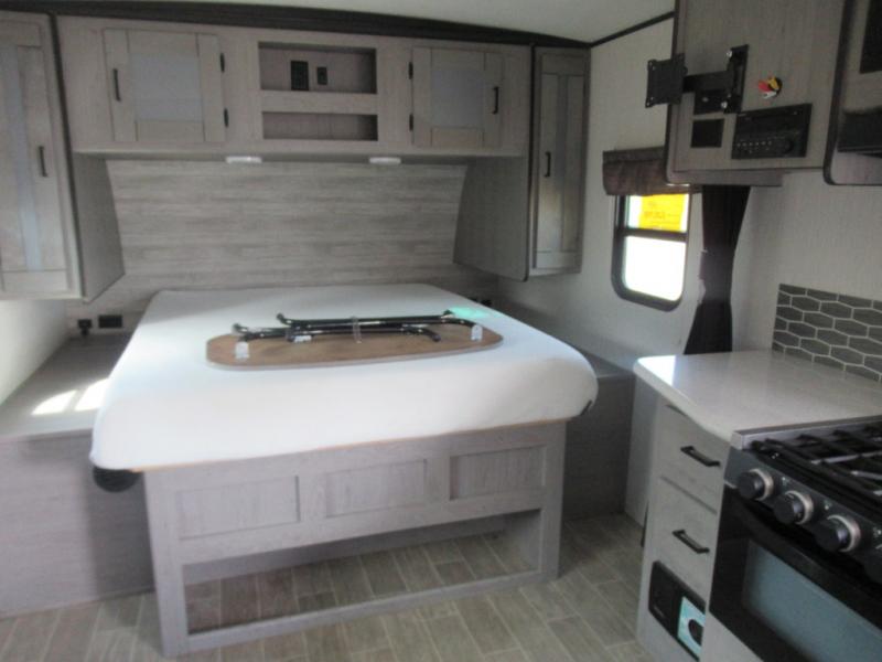 This is the perfect couples trailer with space for an overnight guest on the tri-fold sofa. You and your spouse will enjoy the king bed up front, your own privacy curtain, and dual shirt closets to hang your clothes. Prepare breakfast on the three burner range or use the overhead microwave. You can then dine on the tri-fold sofa that includes a table with folding legs. When it's time to clean up, the rear corner bath with a shower skylight will provide additional standing space and natural light in!