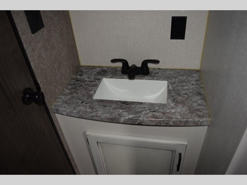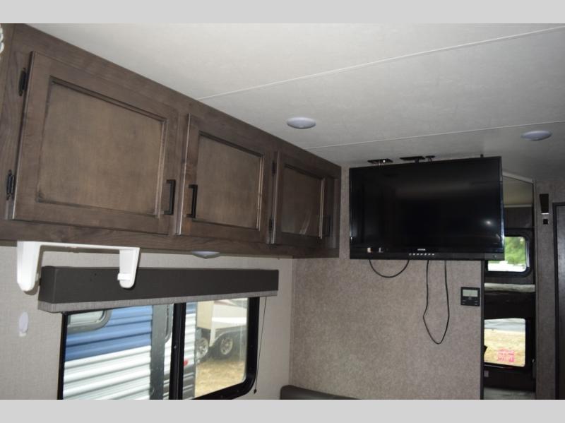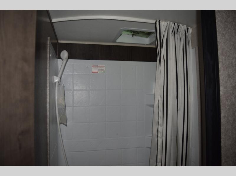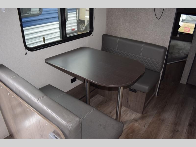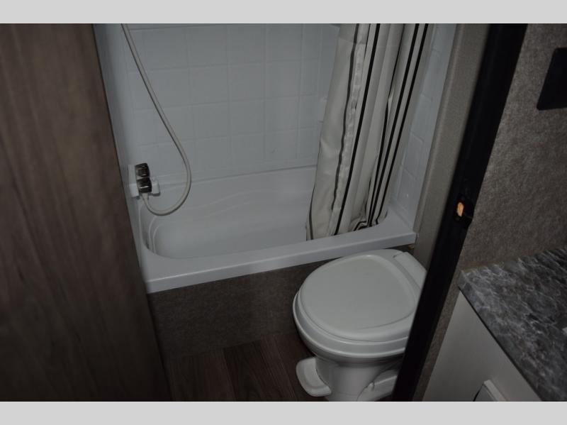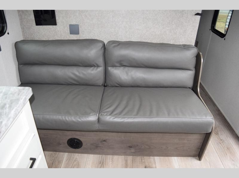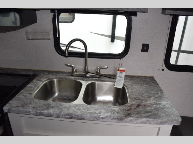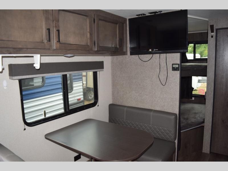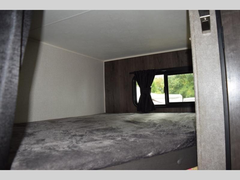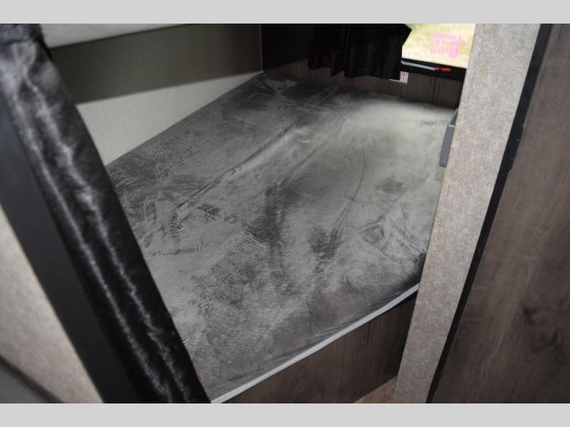 Whether you're camping with family or a group of friends, you will love every minute spent in this travel trailer. The double size bunks are perfect for the kids or the adults since they have a 600 lb. capacity, and the rear corner bath is right next to the bunks for convenience. If it's raining outside, get comfortable on the jackknife sofa and watch a show on the LED TV, or play a board game at the booth dinette. You may want to take a rest, and the front private bedroom will be perfect for that. This model also includes a lighted pass-through storage so you can easily grab your fishing poles for night fishing!