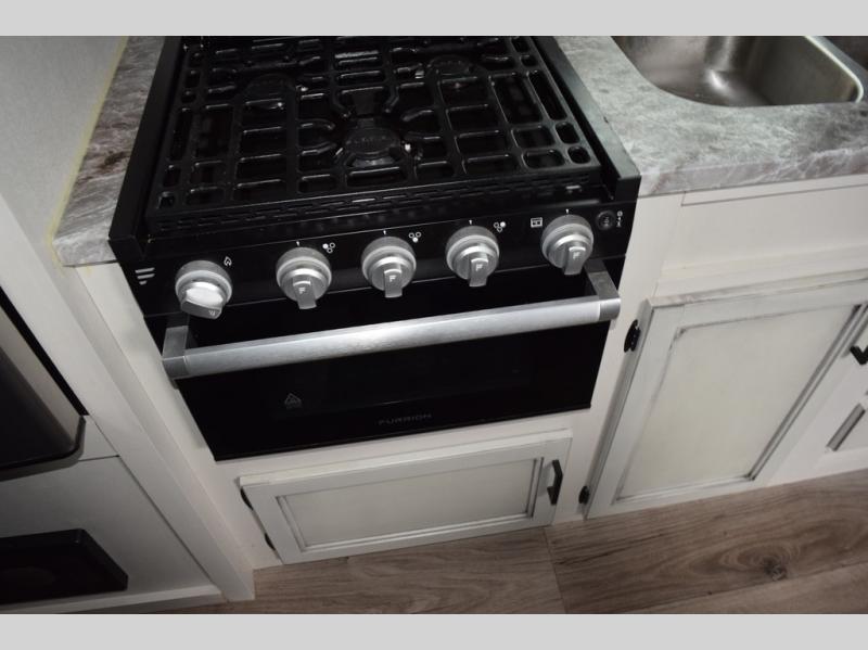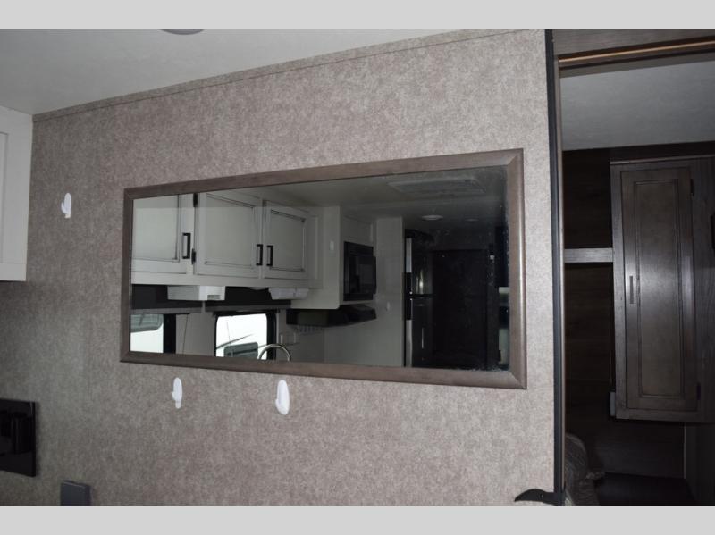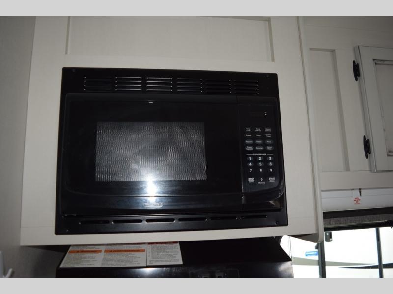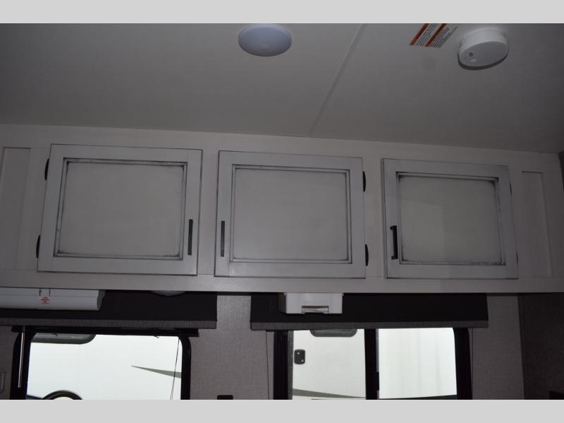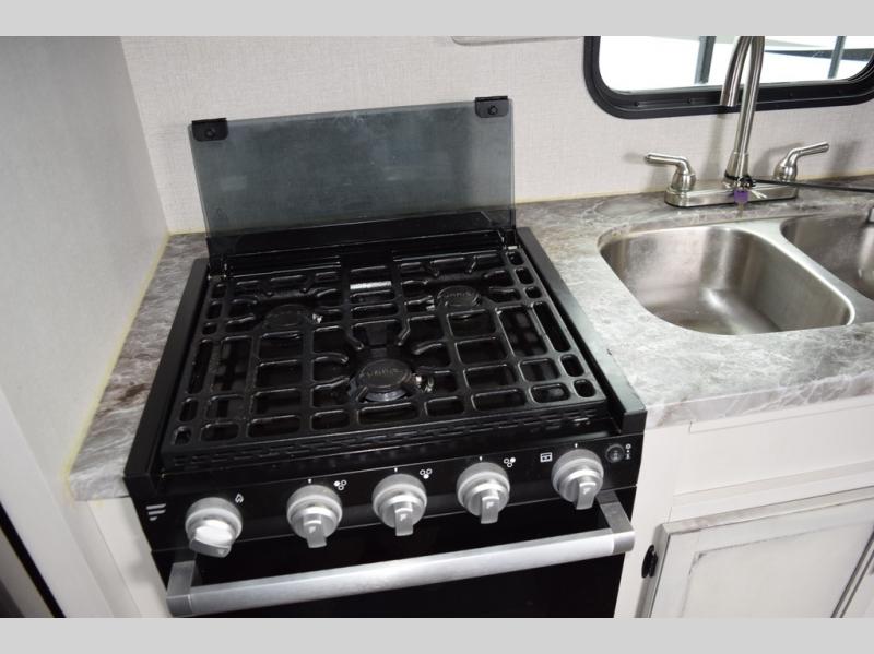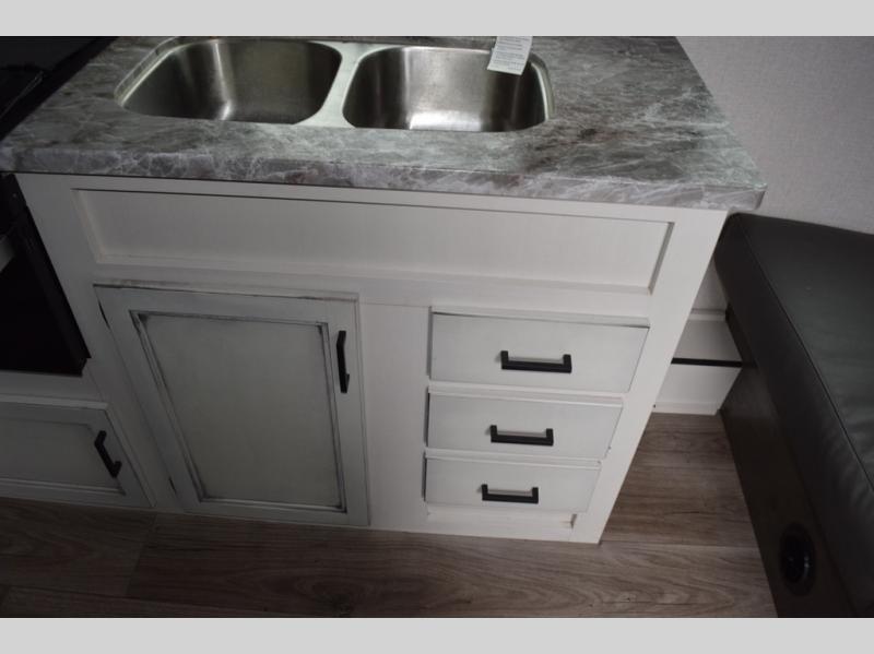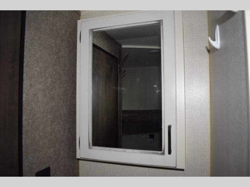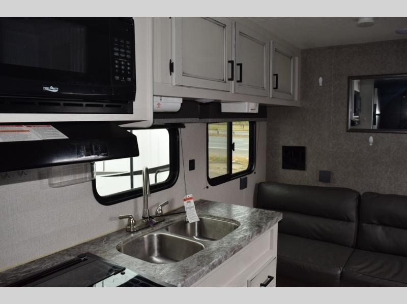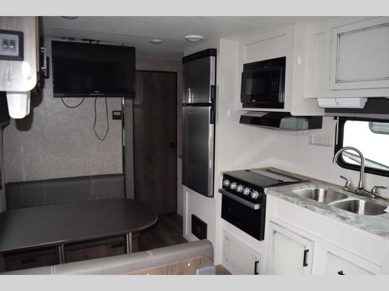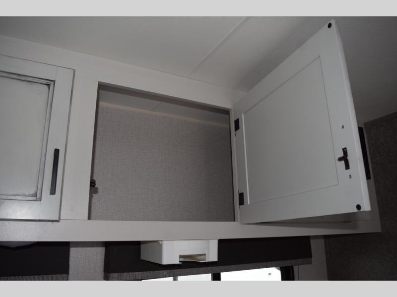 Whether you're camping with family or a group of friends, you will love every minute spent in this travel trailer. The double size bunks are perfect for the kids or the adults since they have a 600 lb. capacity, and the rear corner bath is right next to the bunks for convenience. If it's raining outside, get comfortable on the jackknife sofa and watch a show on the LED TV, or play a board game at the booth dinette. You may want to take a rest, and the front private bedroom will be perfect for that. This model also includes a lighted pass-through storage so you can easily grab your fishing poles for night fishing!