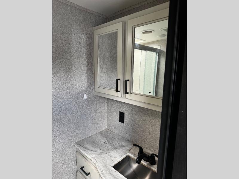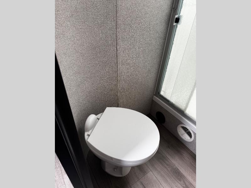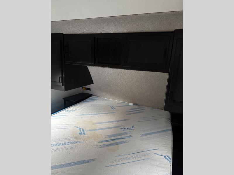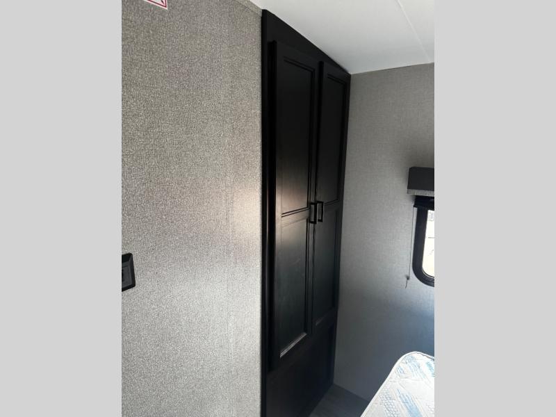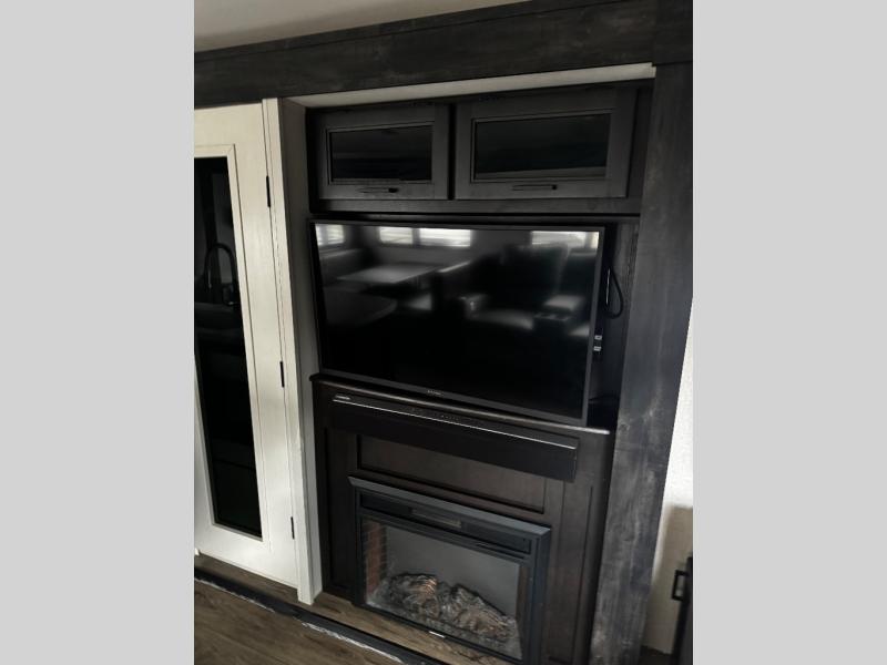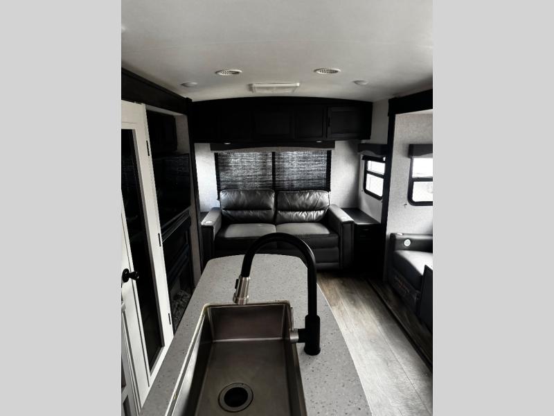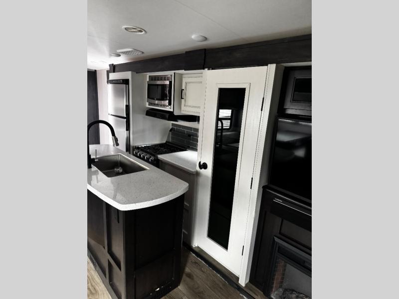 The main living area on this Open Range Light travel trailer is very comfortable with its opposing slides, theater seating, tri-fold sofa, 39" LED HDTV, and fireplace. The slides add extra room so that the kitchen island can be accessed from all around, and you can easily get one of your favorite meals together in the 17" gas oven with three-burner range. The hutch is a great place to store your dishes and cooking utensils. You will be grateful to find a private bedroom with a queen-size bed up at the front, and the full bathroom is right next to the bedroom.
