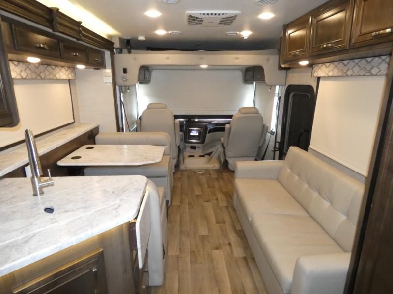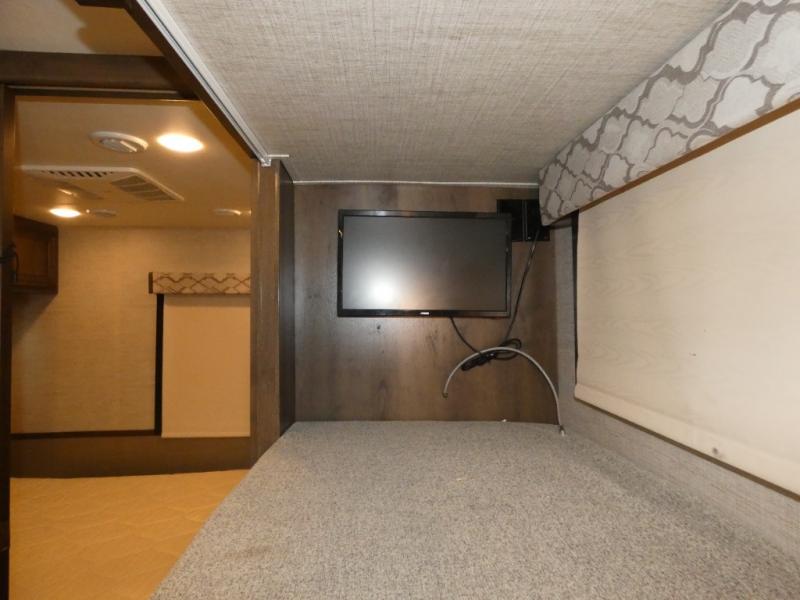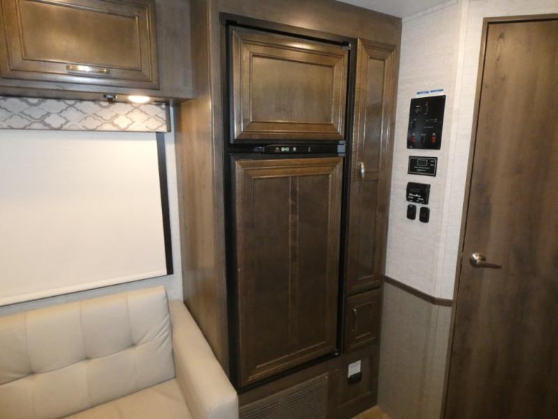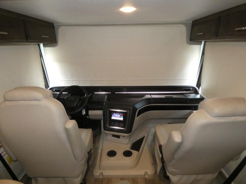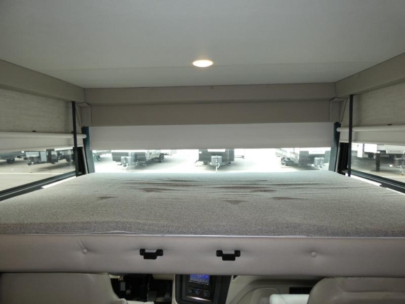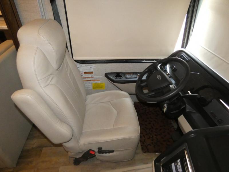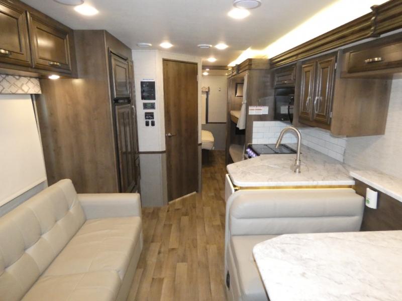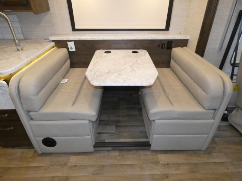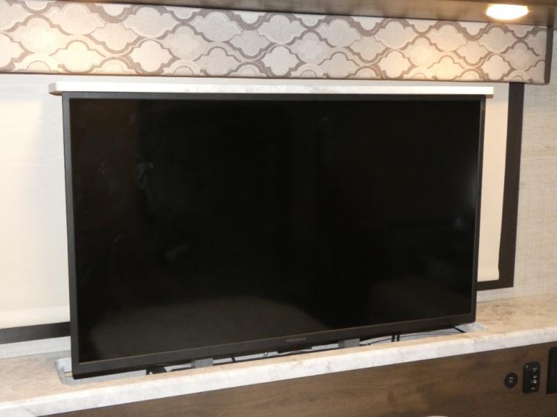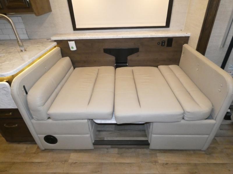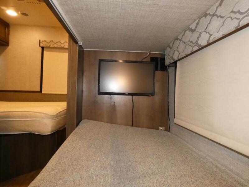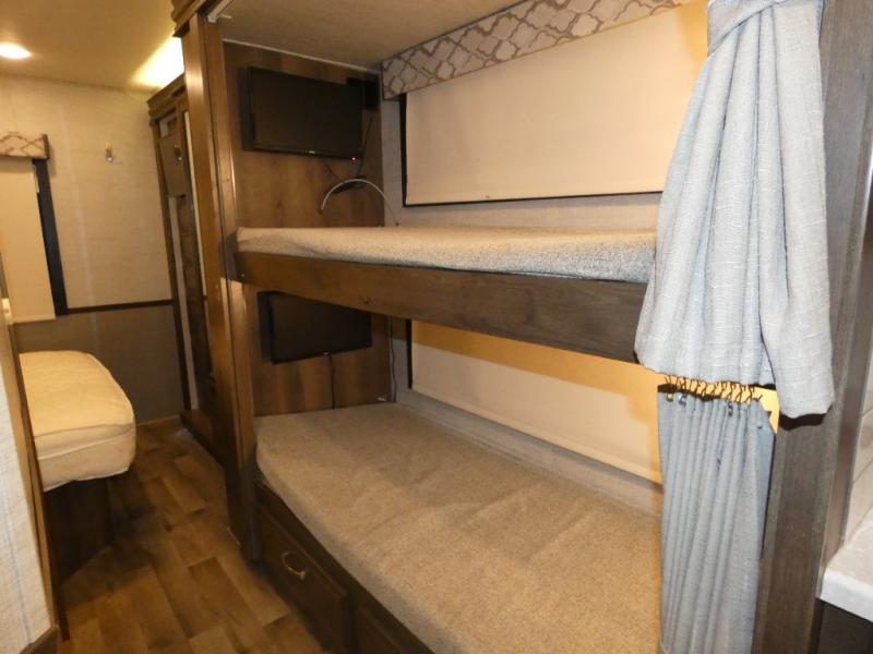 You and your family can travel to a local sporting event with ease or a long vacation in this motorhome. There is sleeping space for six to eight if you decide to utilize the furniture and if you added the drop down overhead bunk option. The kids will love their own bunk bed with a TV while you sleep in privacy in the rear bedroom with access to the full bathroom. The second entry into the bathroom is near the bunks and kitchen area for easy access for all. You can make warm meals to enjoy at the legless dinette table or while sitting on the sofa, and the captain's chairs with a cockpit table. The 39" TV on a lift offers entertainment as well as the exterior LED TV under the 23' electric awning with LED lights.