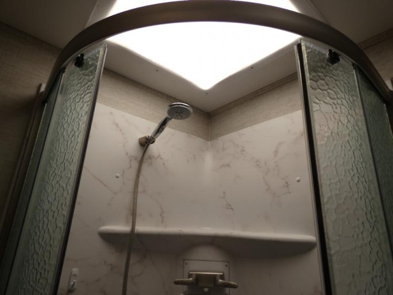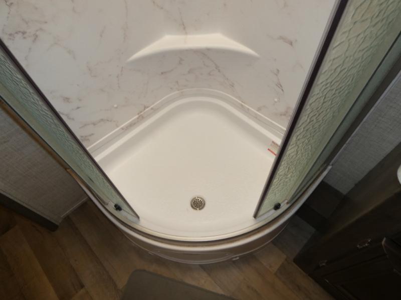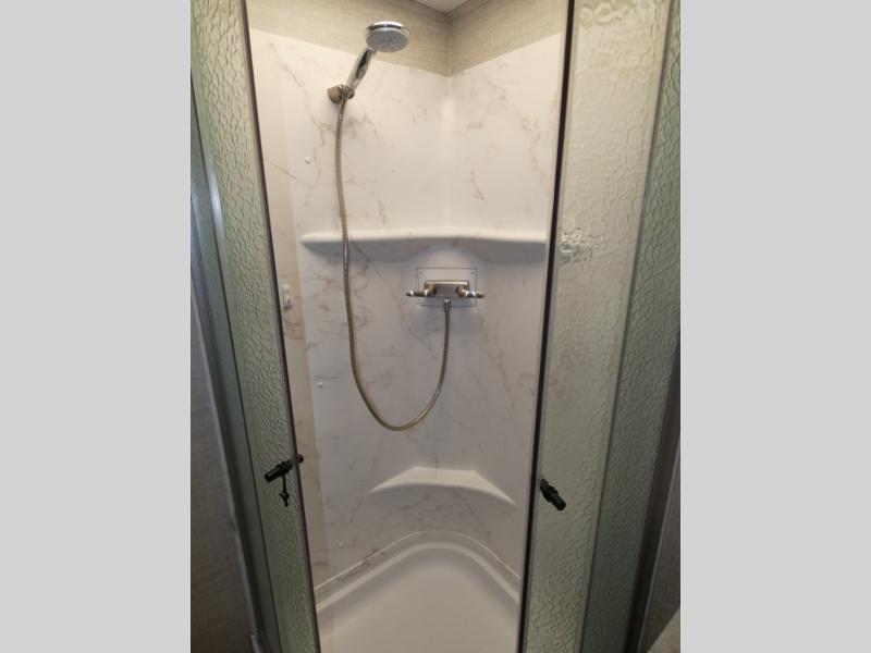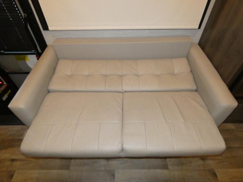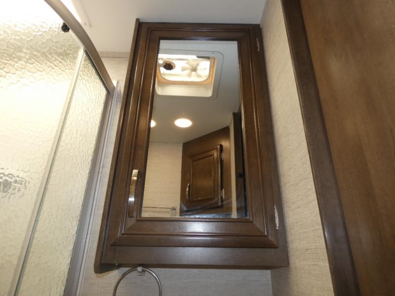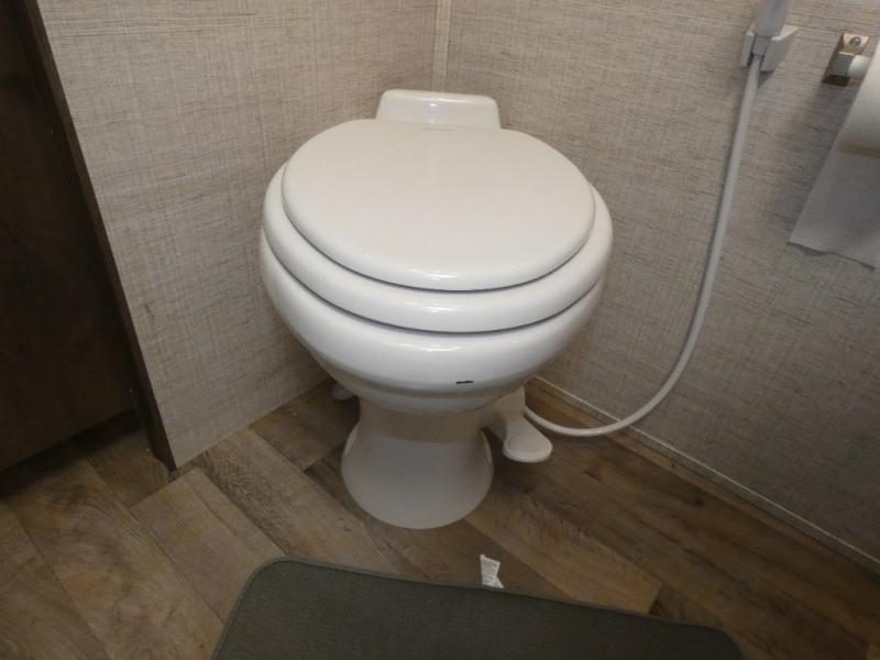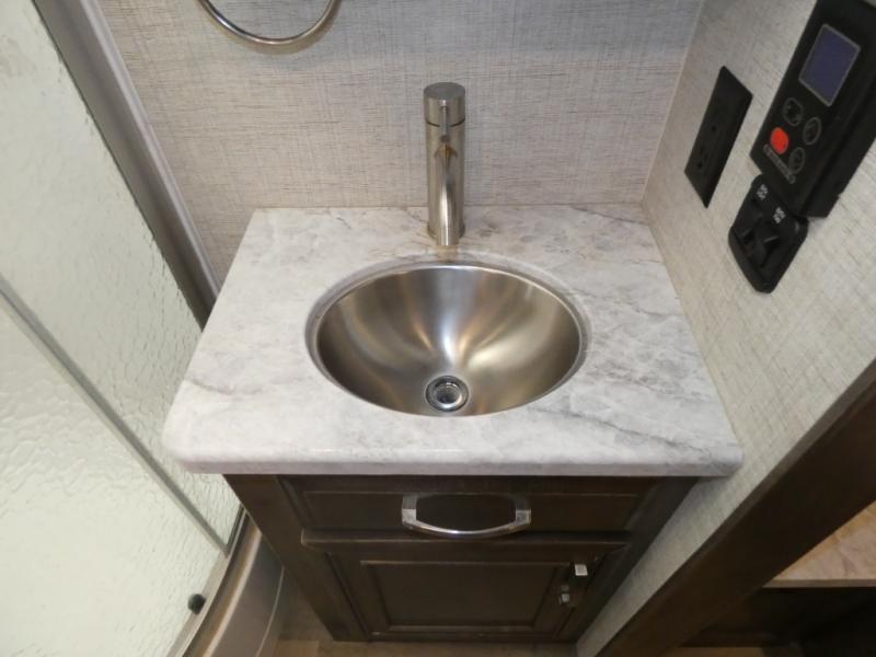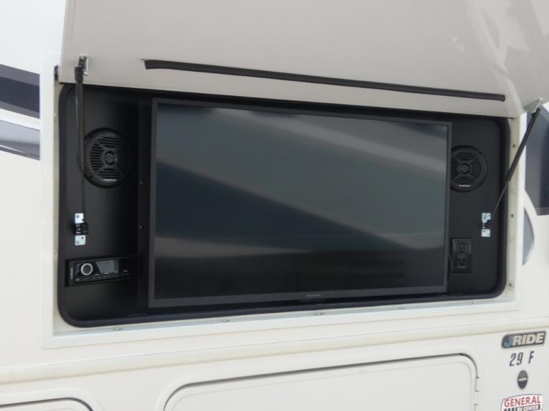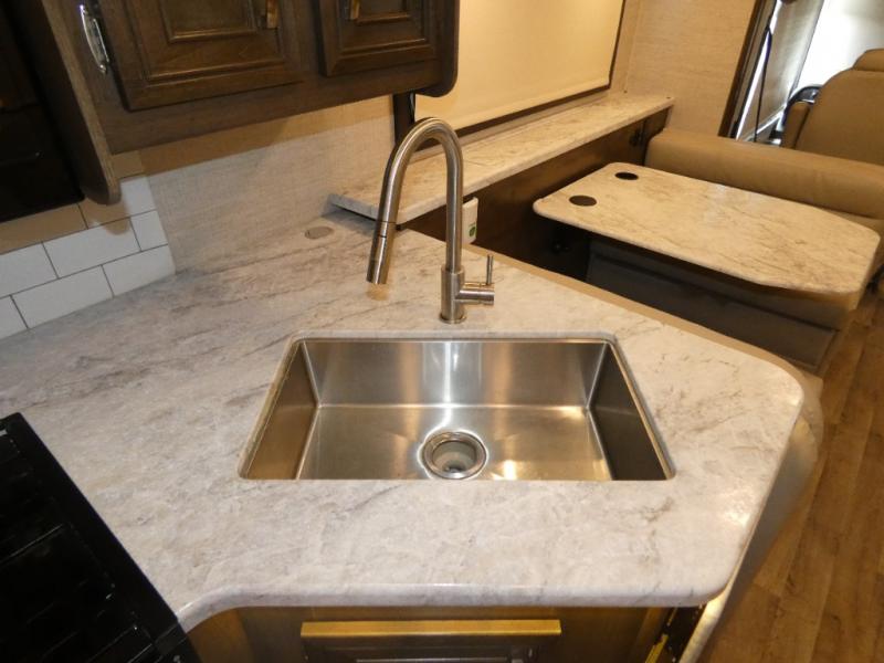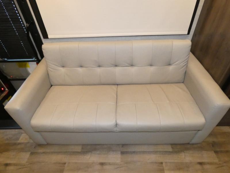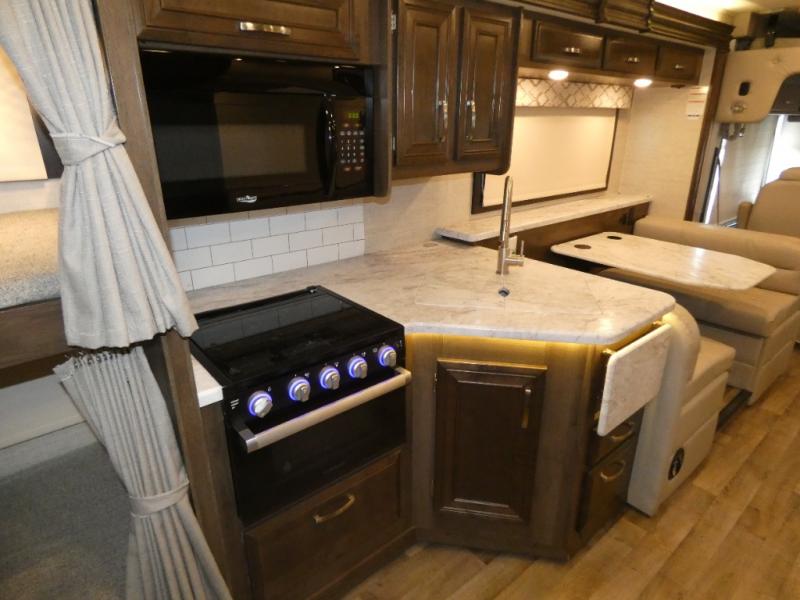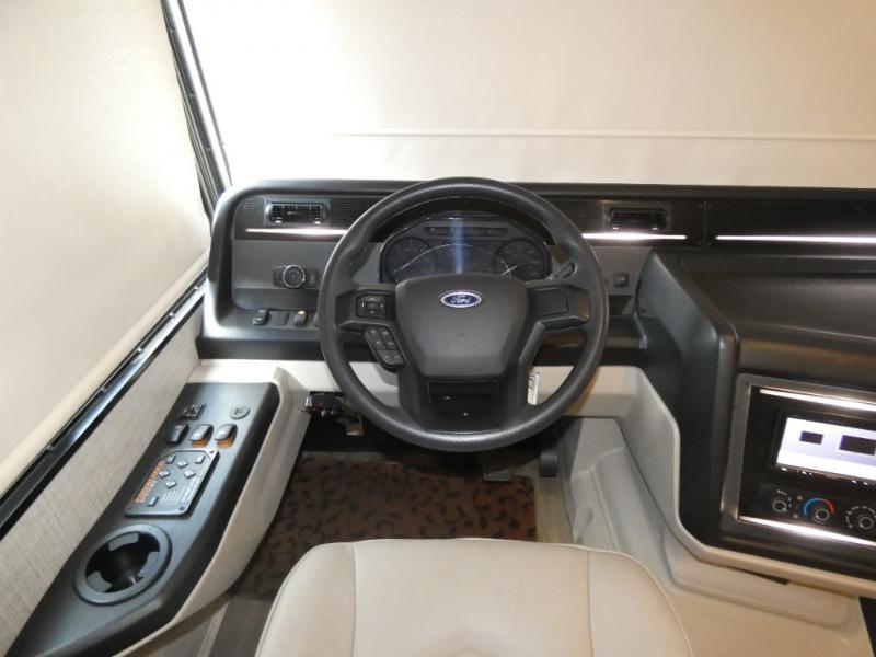 You and your family can travel to a local sporting event with ease or a long vacation in this motorhome. There is sleeping space for six to eight if you decide to utilize the furniture and if you added the drop down overhead bunk option. The kids will love their own bunk bed with a TV while you sleep in privacy in the rear bedroom with access to the full bathroom. The second entry into the bathroom is near the bunks and kitchen area for easy access for all. You can make warm meals to enjoy at the legless dinette table or while sitting on the sofa, and the captain's chairs with a cockpit table. The 39" TV on a lift offers entertainment as well as the exterior LED TV under the 23' electric awning with LED lights.