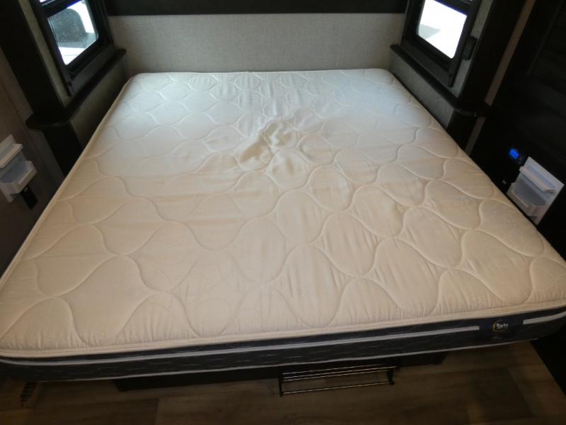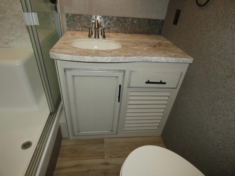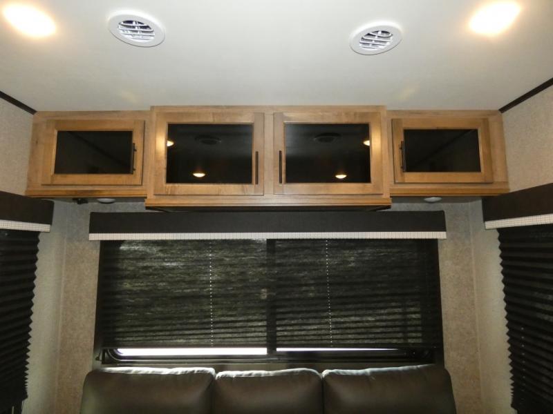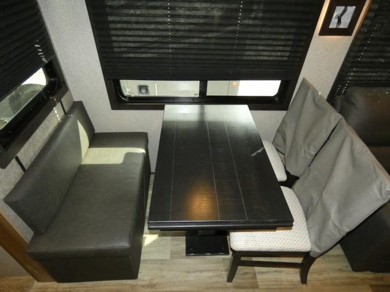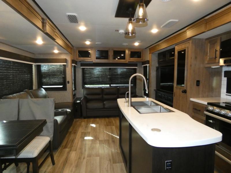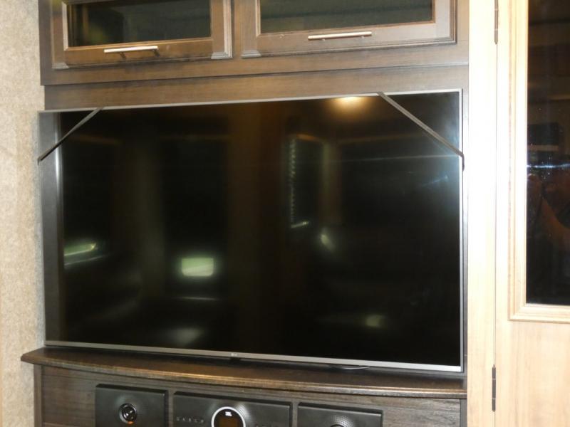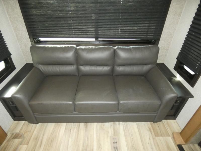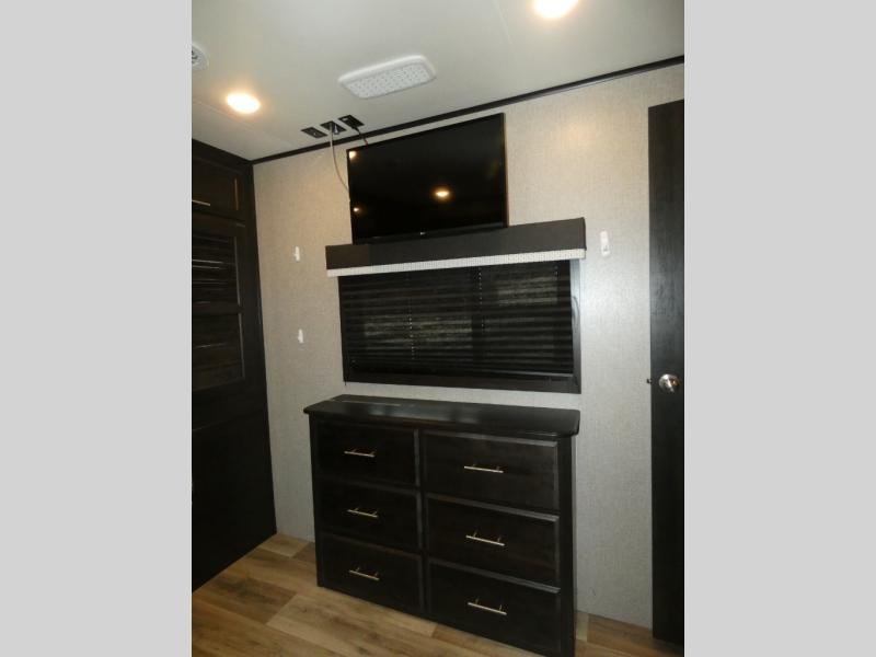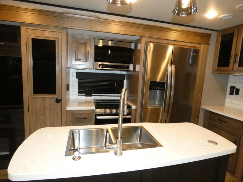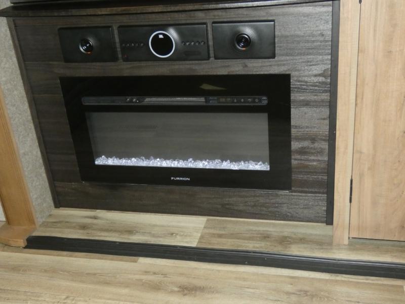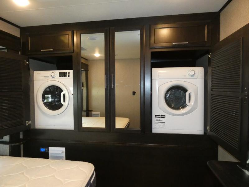 You will want this popular travel trailer for your next getaway! The rear tri-fold sofa and theater seating across from the entertainment center with a fireplace offers a comfortable place to relax at night. The kitchen island will make meal prepping easier and the walk-in pantry is big enough to store all of your favorite snacks, plus there is a hutch to store you dishes and a coat closet/pantry too. After a fun-filled day outdoors, you can head to the full bathroom and take a nice, hot shower in the shower with a seat and then head to the front private bedroom and change into your pajamas that are stored in either the dresser or the wardrobe with washer and dryer!