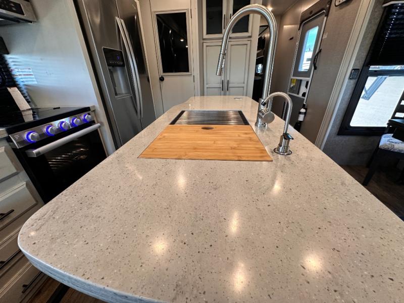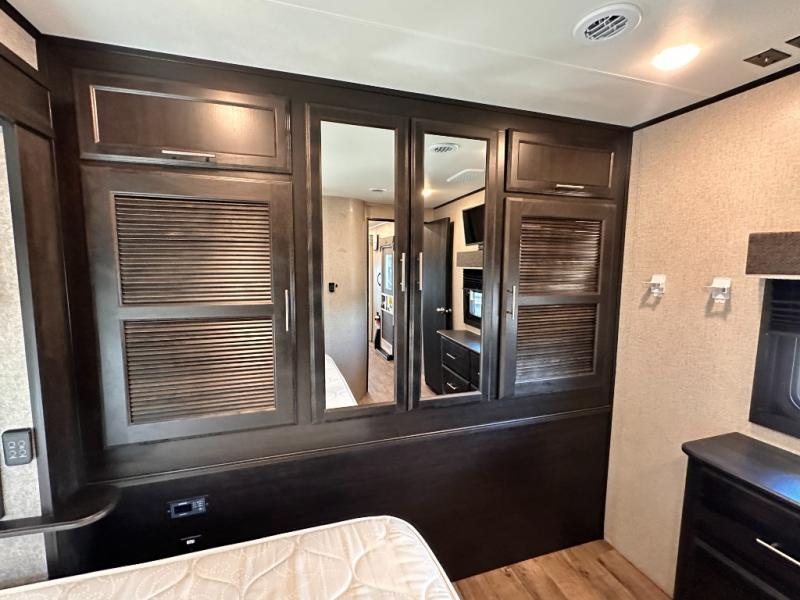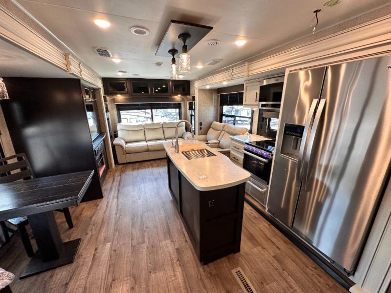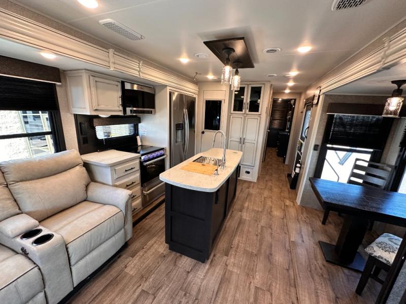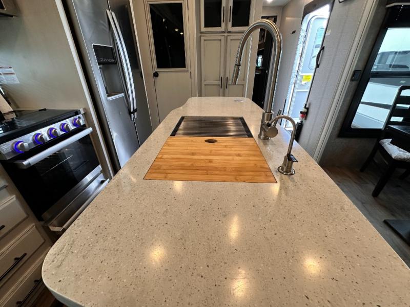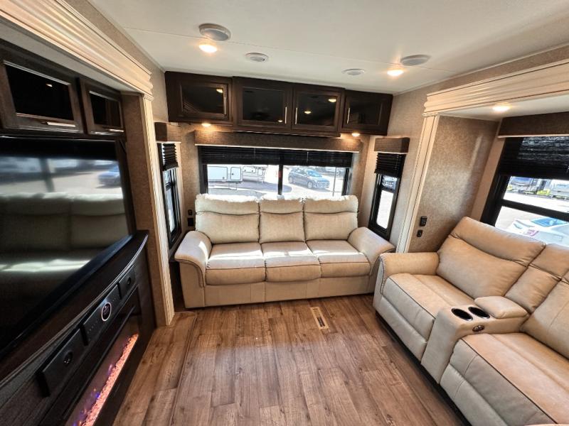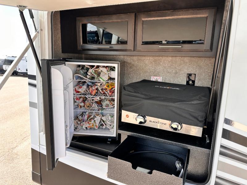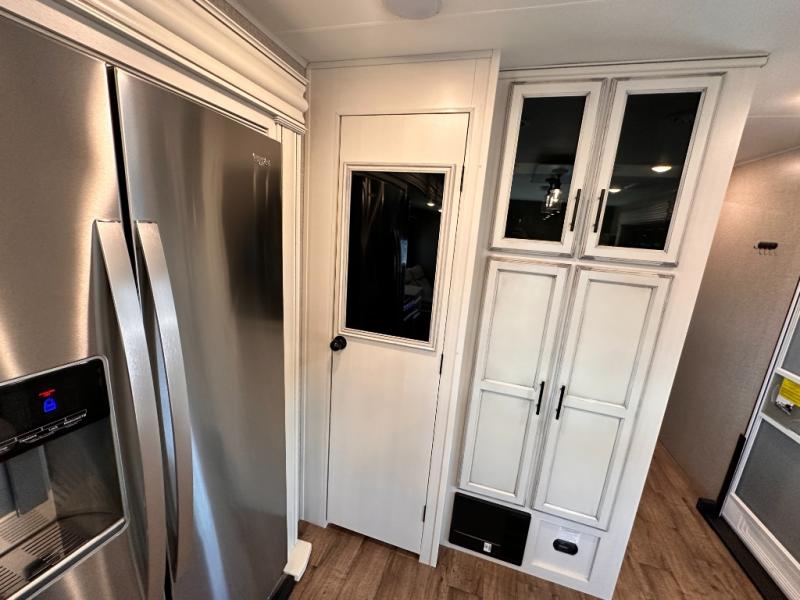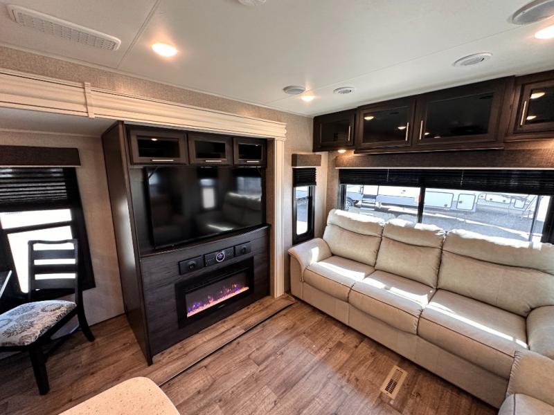 Step inside the spacious rear living area of this fifth wheel and see just how comfortable your next camping trip will be! It features a sofa with tables on either side to set your drinks on and theater seating across from the entertainment center with a fireplace and 50" HDTV with a JBL sound system. The kitchen has everything you will need to whip up a delicious home cooked meal with the kitchen island, the walk-in pantry, the 21 cu. ft. residential refrigerator, and the three burner cooktop, plus there is a microwave for those days when you don't feel like cooking. You can even watch the kids play outside while you cook dinner thanks to the outside kitchen which even has a refrigerator to keep your beverage cool. Everyone can freshen up in the full bathroom with the 60" shower with a seat and a linen closet to store your towels. The front private bedroom has a comfortable queen bed with nightstands on either side for you to place your electronics or glass of water, a dresser with a TV option that can be added, and a wardrobe that is prepped for the optional washer and dryer to be added too!