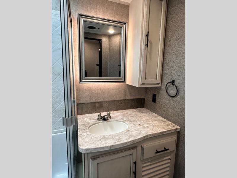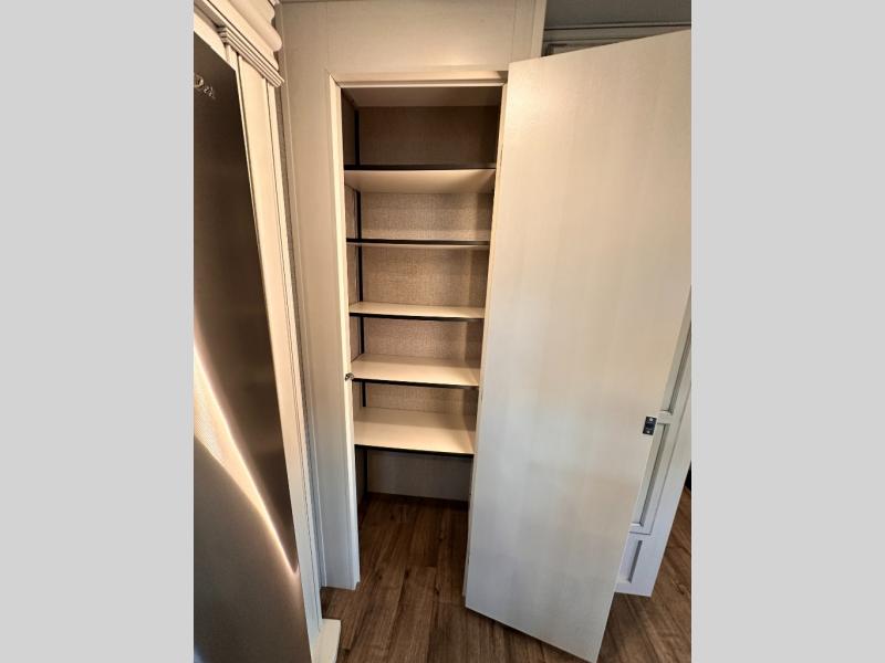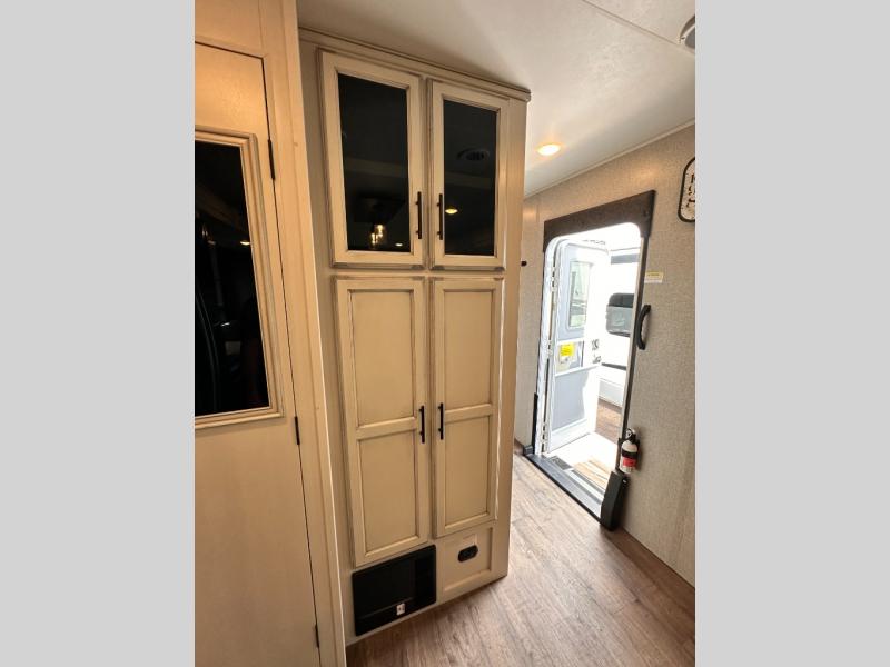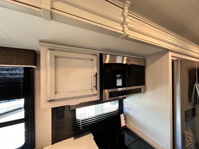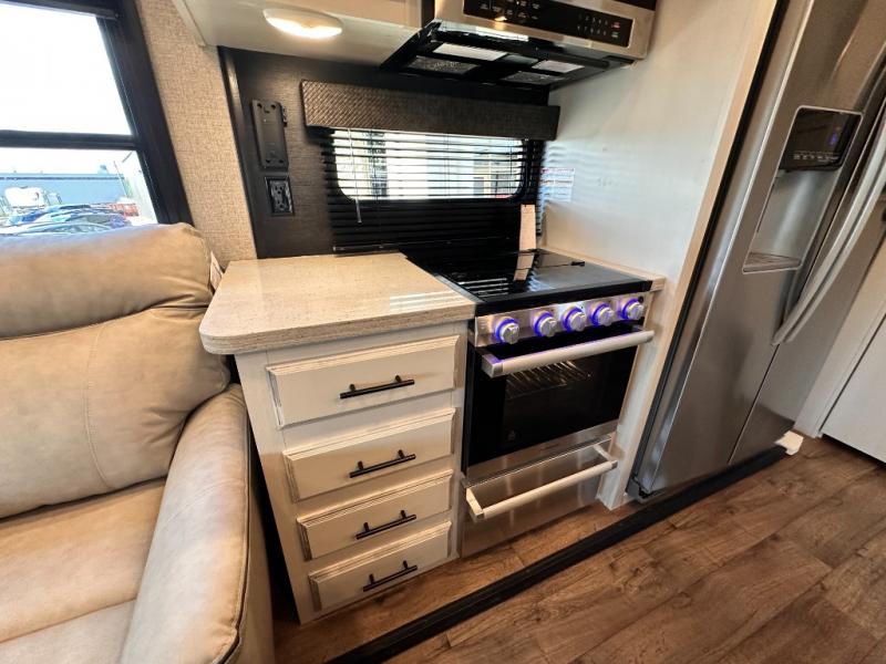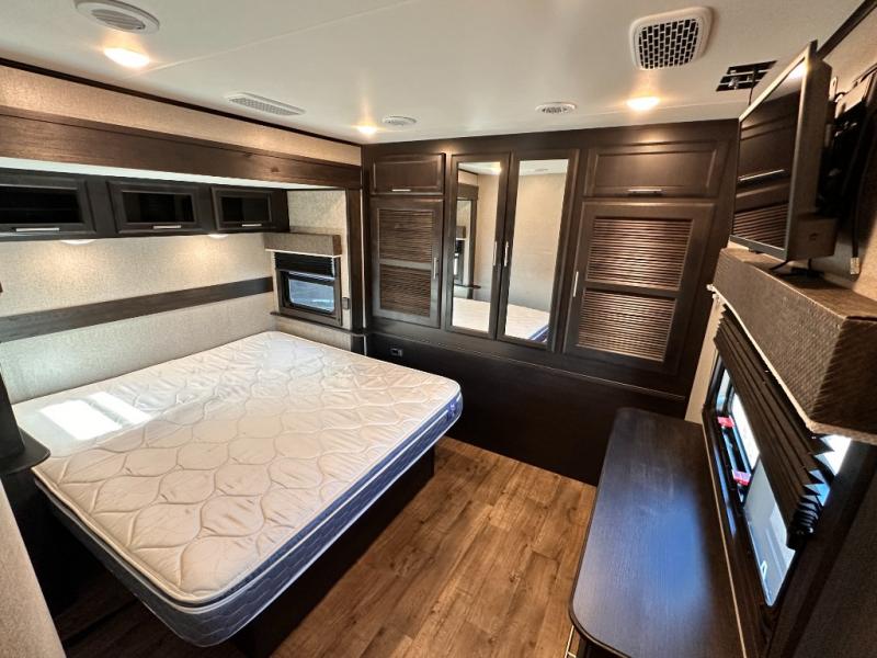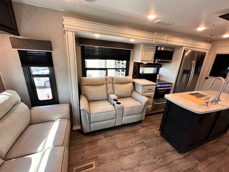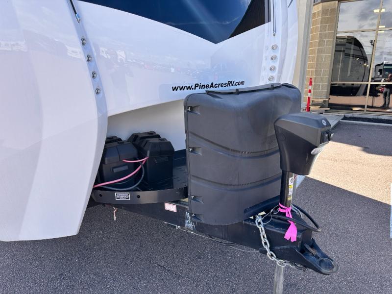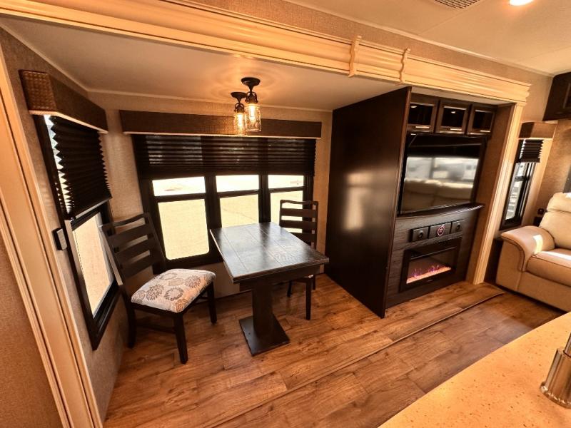 Step inside the spacious rear living area of this fifth wheel and see just how comfortable your next camping trip will be! It features a sofa with tables on either side to set your drinks on and theater seating across from the entertainment center with a fireplace and 50" HDTV with a JBL sound system. The kitchen has everything you will need to whip up a delicious home cooked meal with the kitchen island, the walk-in pantry, the 21 cu. ft. residential refrigerator, and the three burner cooktop, plus there is a microwave for those days when you don't feel like cooking. You can even watch the kids play outside while you cook dinner thanks to the outside kitchen which even has a refrigerator to keep your beverage cool. Everyone can freshen up in the full bathroom with the 60" shower with a seat and a linen closet to store your towels. The front private bedroom has a comfortable queen bed with nightstands on either side for you to place your electronics or glass of water, a dresser with a TV option that can be added, and a wardrobe that is prepped for the optional washer and dryer to be added too!