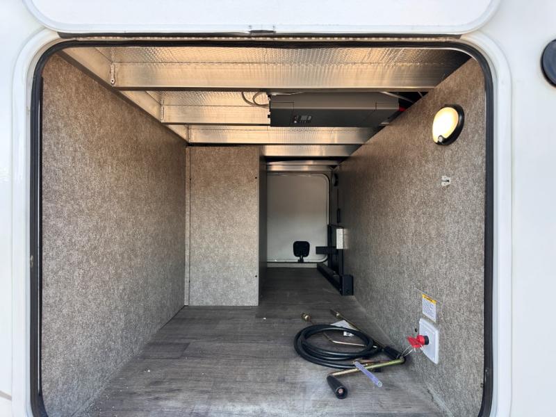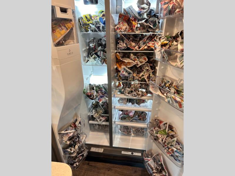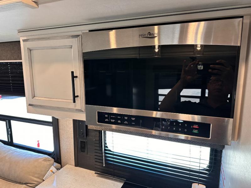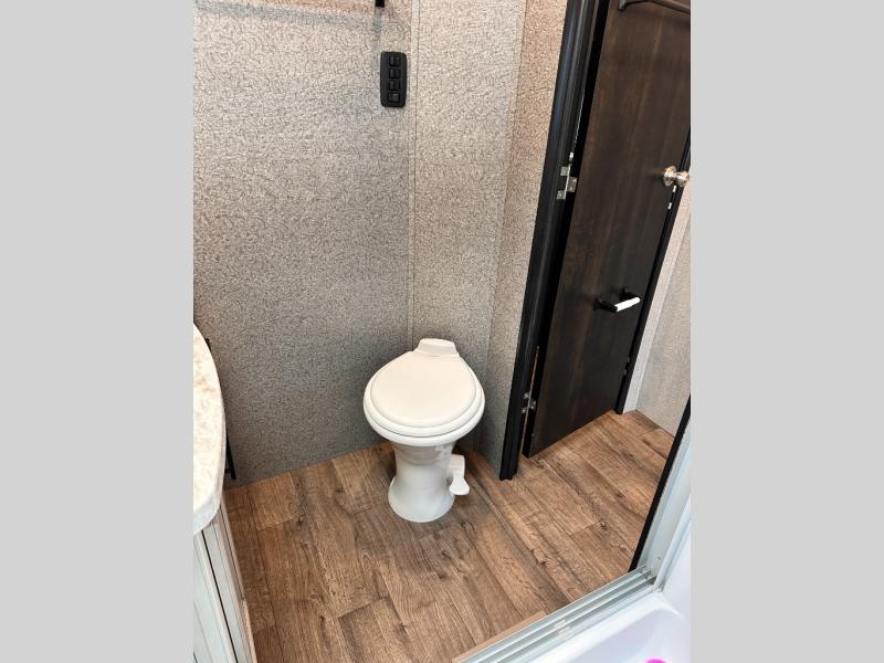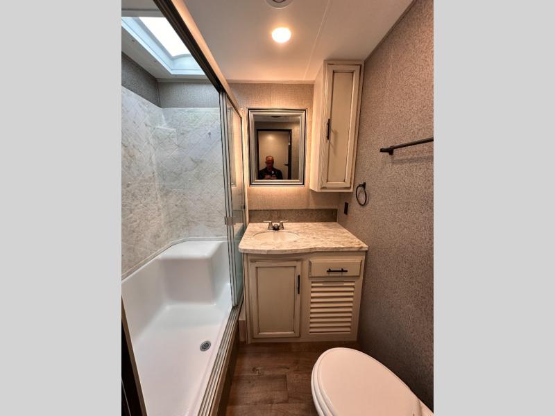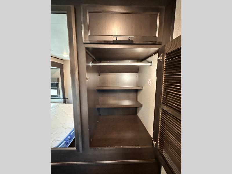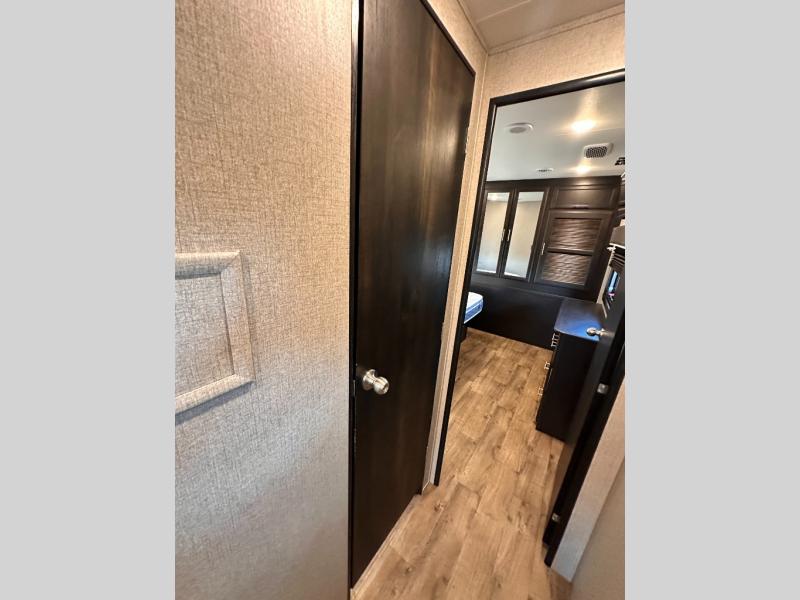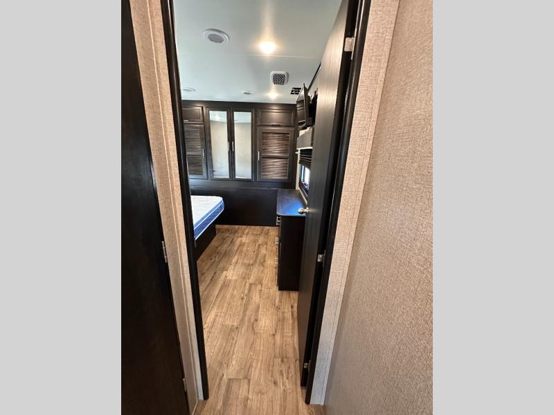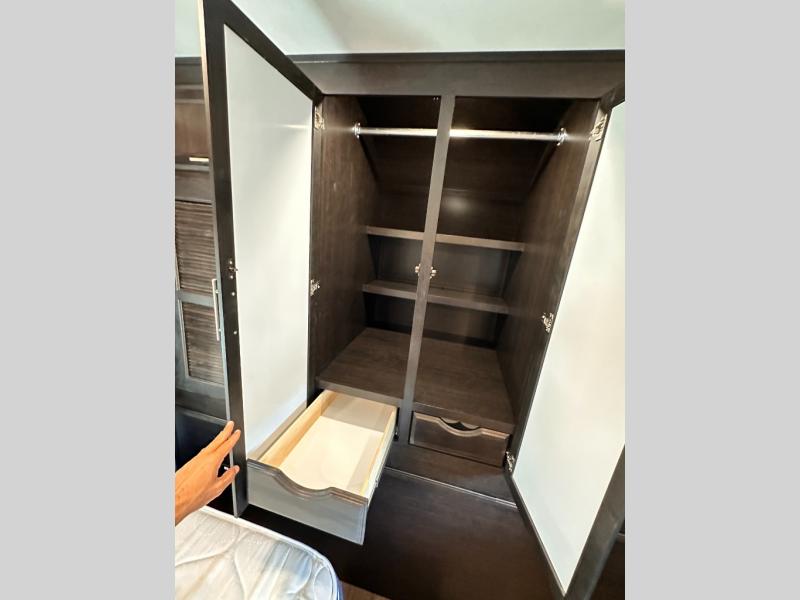 Step inside the spacious rear living area of this fifth wheel and see just how comfortable your next camping trip will be! It features a sofa with tables on either side to set your drinks on and theater seating across from the entertainment center with a fireplace and 50" HDTV with a JBL sound system. The kitchen has everything you will need to whip up a delicious home cooked meal with the kitchen island, the walk-in pantry, the 21 cu. ft. residential refrigerator, and the three burner cooktop, plus there is a microwave for those days when you don't feel like cooking. You can even watch the kids play outside while you cook dinner thanks to the outside kitchen which even has a refrigerator to keep your beverage cool. Everyone can freshen up in the full bathroom with the 60" shower with a seat and a linen closet to store your towels. The front private bedroom has a comfortable queen bed with nightstands on either side for you to place your electronics or glass of water, a dresser with a TV option that can be added, and a wardrobe that is prepped for the optional washer and dryer to be added too!