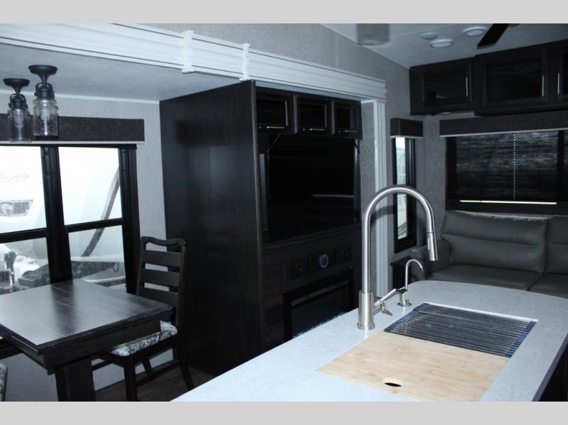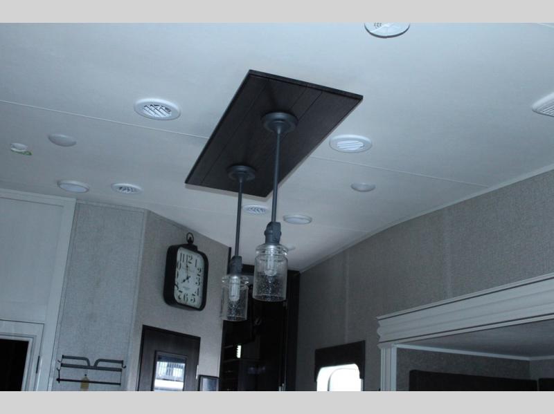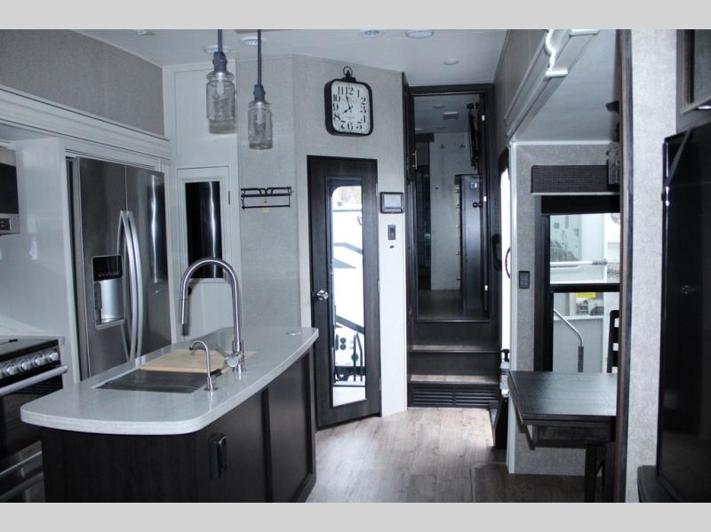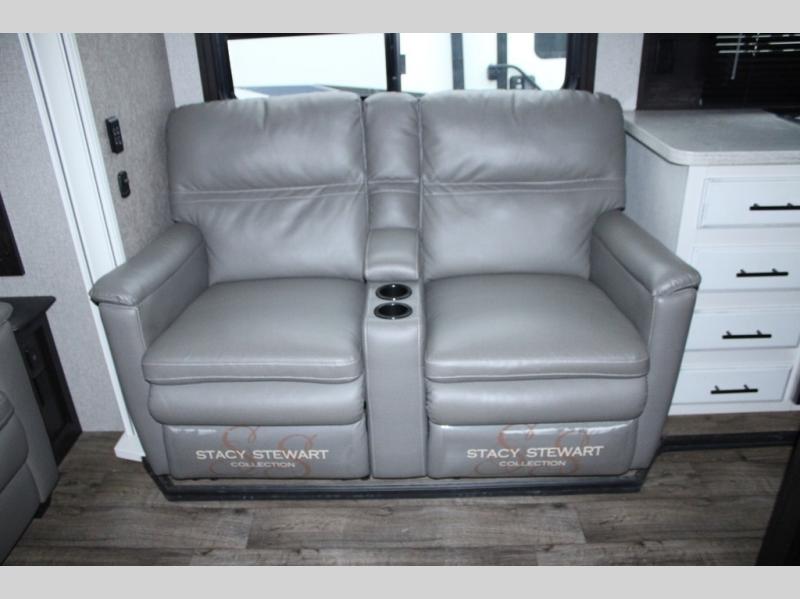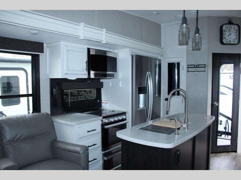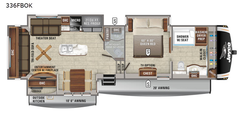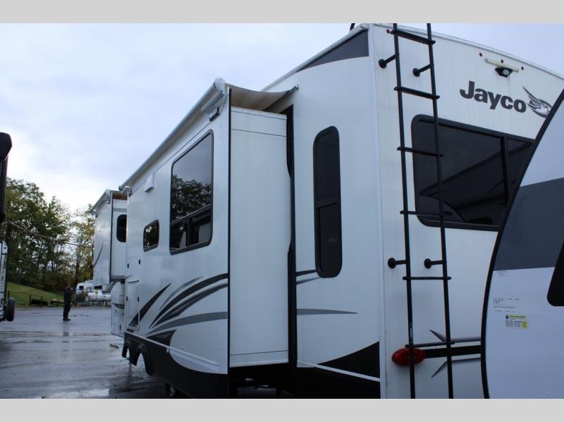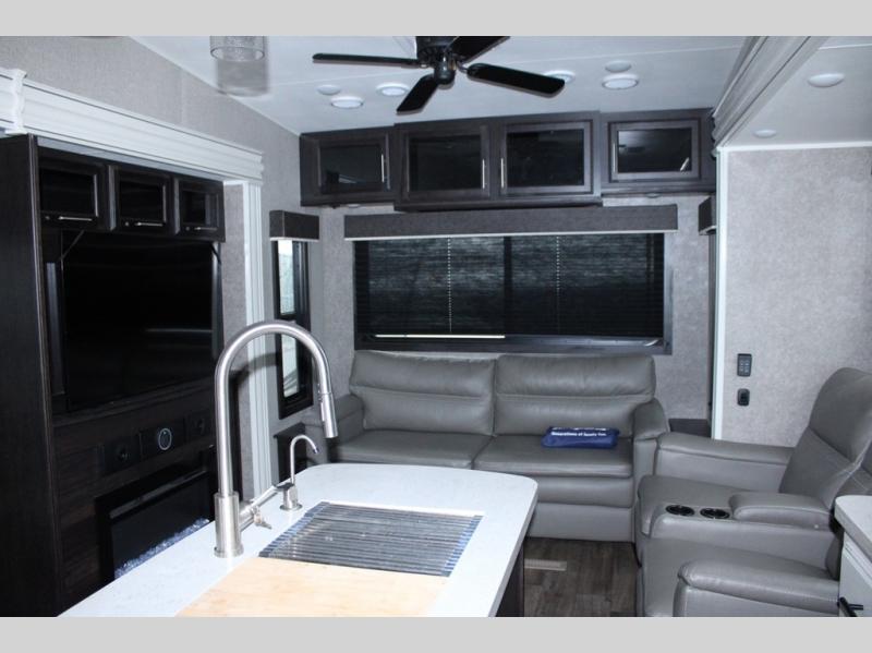 Check out the industry's first front full bathroom and half bathroom with a loft above it in this fifth wheel! Inside the front bathroom is a shower with a seat and a walk-in closet with an area prepped to add the optional washer and dryer, plus it leads right into the private bedroom that has a queen bed but can be switched out for the optional king Serta mattress. The kitchen island will make meal prepping easy and the free standing dinette is a great place to enjoy your meals then play a card game or two. The rear living area features a tri-fold sofa that can be used for seating during the day and a sleeping space at night, and theater seating across from the entertainment center with a fireplace and 50" HDTV with a JBL sound system. Outside you will find many handy features like the two electric awnings, the electric auto-leveling, the JAY COMMAND Smart RV technology, and the pass-through storage area!