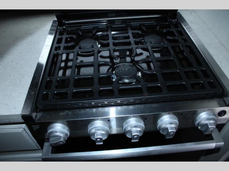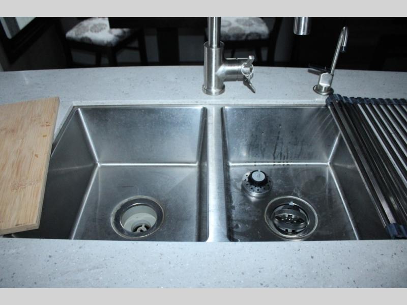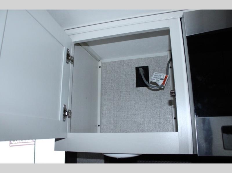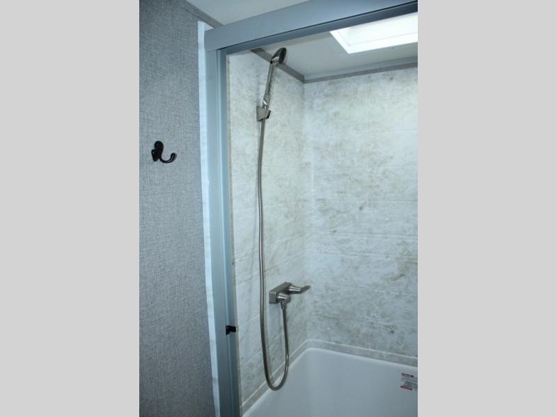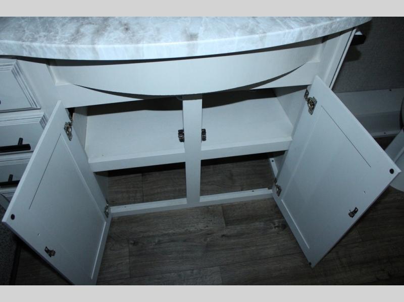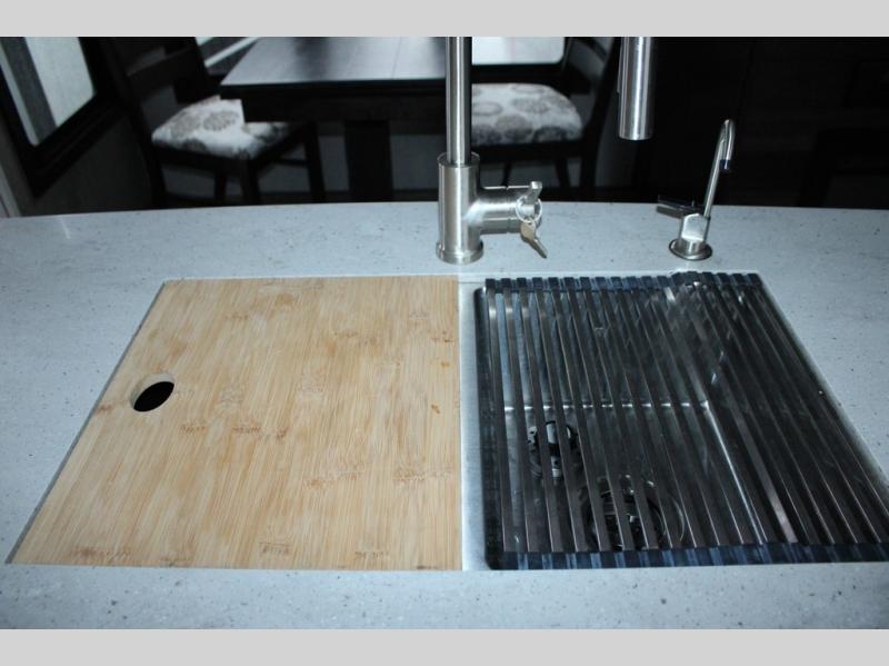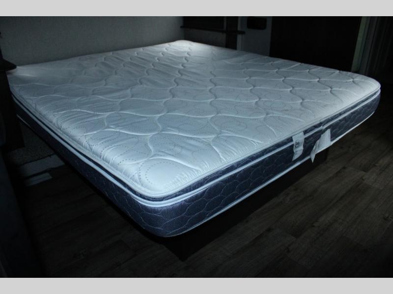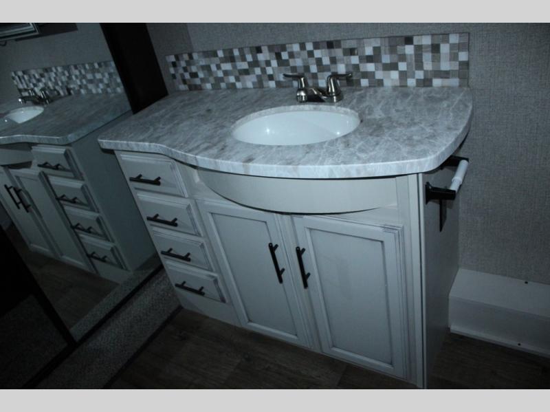 Check out the industry's first front full bathroom and half bathroom with a loft above it in this fifth wheel! Inside the front bathroom is a shower with a seat and a walk-in closet with an area prepped to add the optional washer and dryer, plus it leads right into the private bedroom that has a queen bed but can be switched out for the optional king Serta mattress. The kitchen island will make meal prepping easy and the free standing dinette is a great place to enjoy your meals then play a card game or two. The rear living area features a tri-fold sofa that can be used for seating during the day and a sleeping space at night, and theater seating across from the entertainment center with a fireplace and 50" HDTV with a JBL sound system. Outside you will find many handy features like the two electric awnings, the electric auto-leveling, the JAY COMMAND Smart RV technology, and the pass-through storage area!