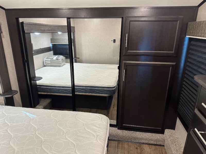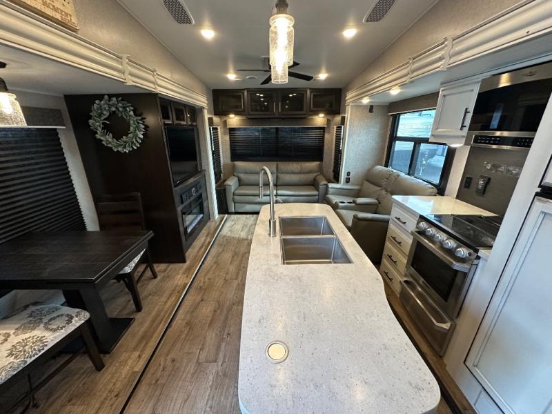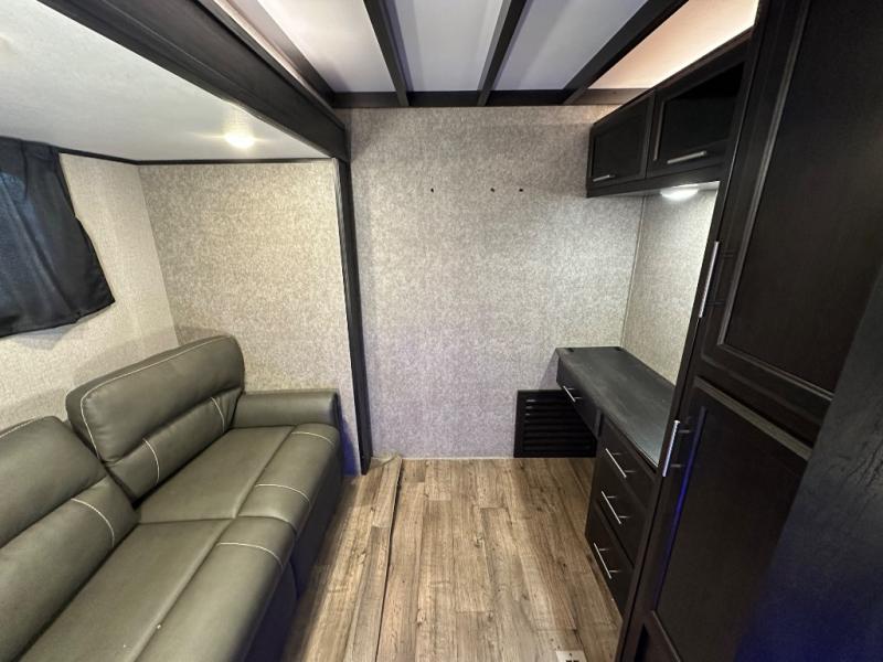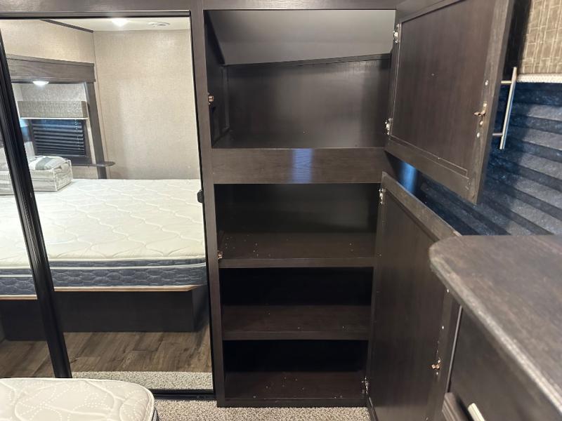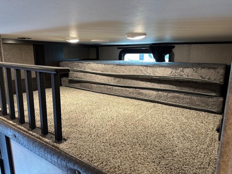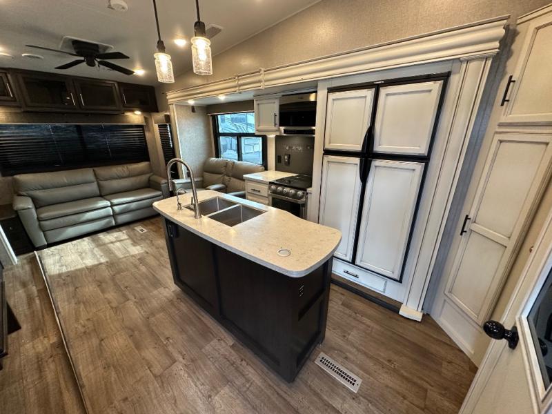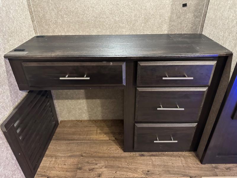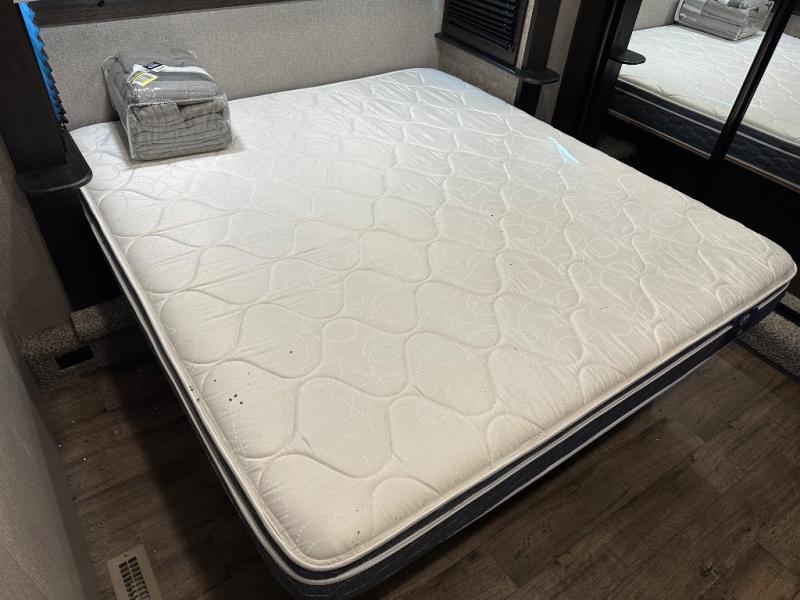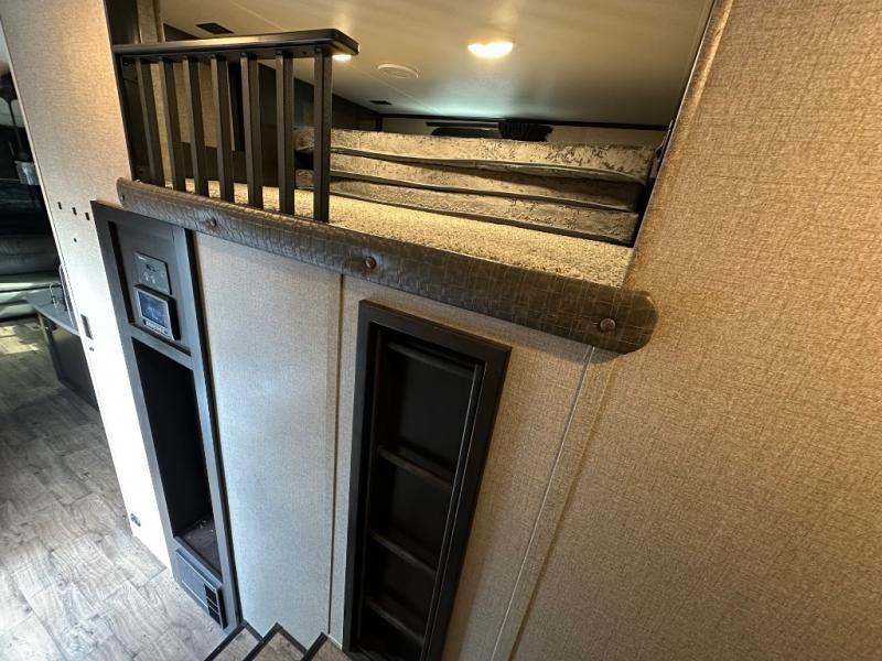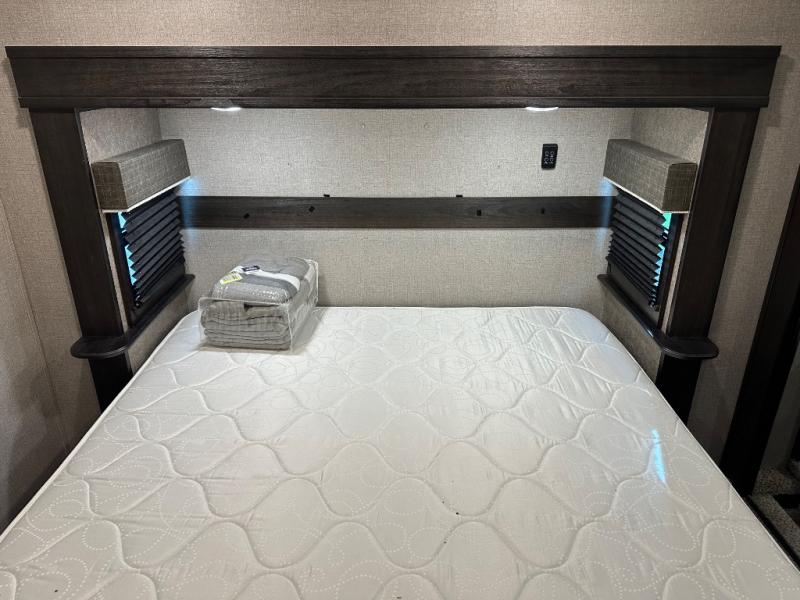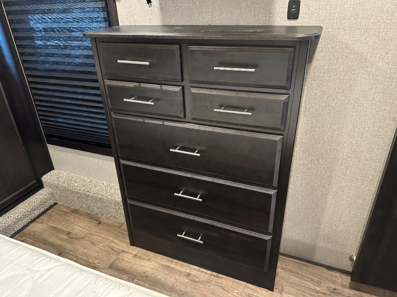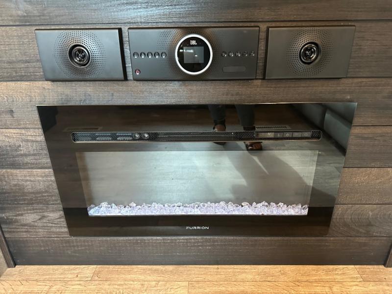 Find your favorite campsite then load up this two bedroom fifth wheel! The front private bedroom features a comfortable queen bed that can be switched out for an optional king Serta mattress, a walk-in closet with shelving and an area prepped for the optional washer and dryer. The second bedroom has a desk for you to get some work done, a hide-a-bed sofa with a top bunk and a 64" x 76" loft above it all. You can prepare your best meals in the kitchen with the island, the 21 cu. ft. residential refrigerator, and the three burner cooktop, and then comfortably enjoy eating them at the free standing table with chairs. The rear living area has a tri-fold sofa and theater seating across from an entertainment center with a fireplace and a 50" HDTV with a JBL sound system, plus there is a ceiling fan above it all to circulate the cool air from the dual Whisper Quiet air conditioners. You will stay protected underneath one of the two power awnings while you cook at the outside kitchen or prepare a beverage at the outside wet bar with a pull-out countertop!