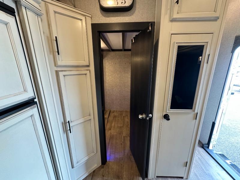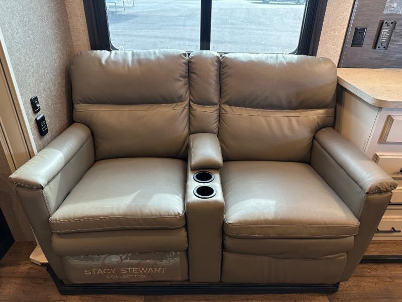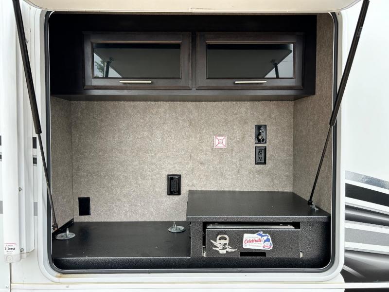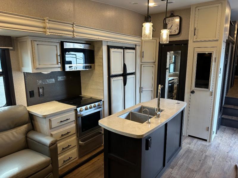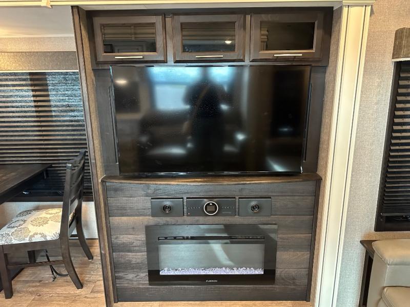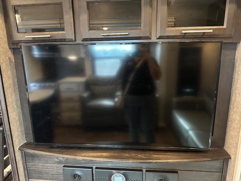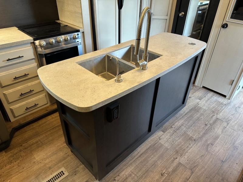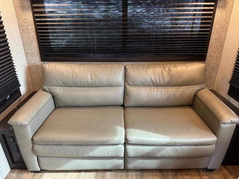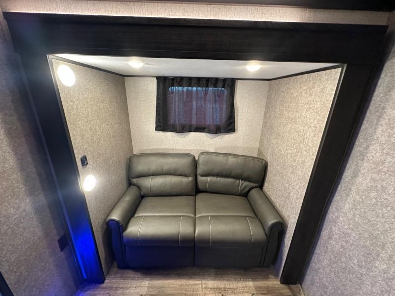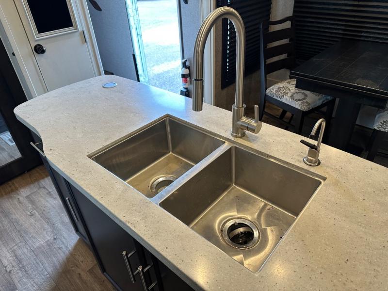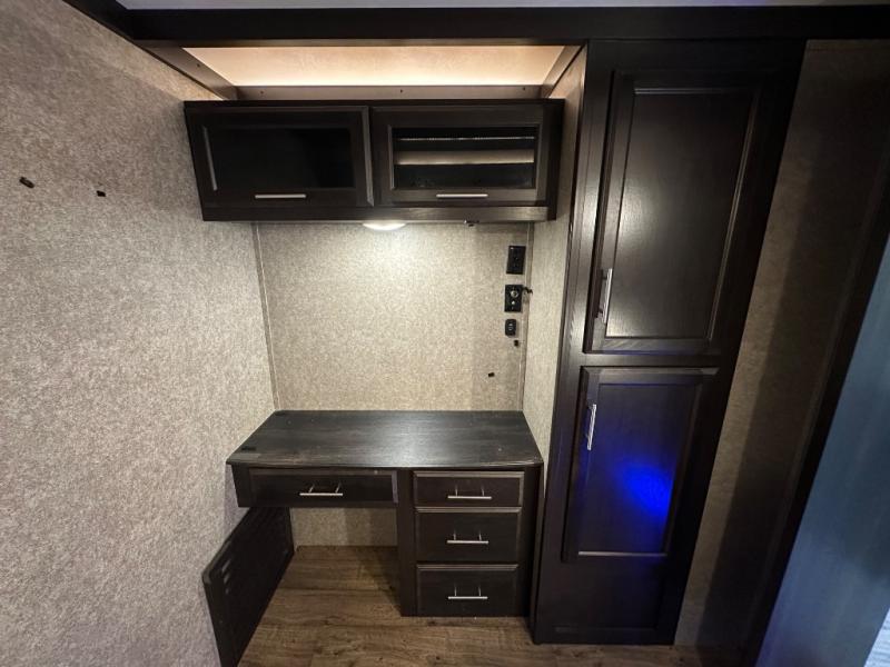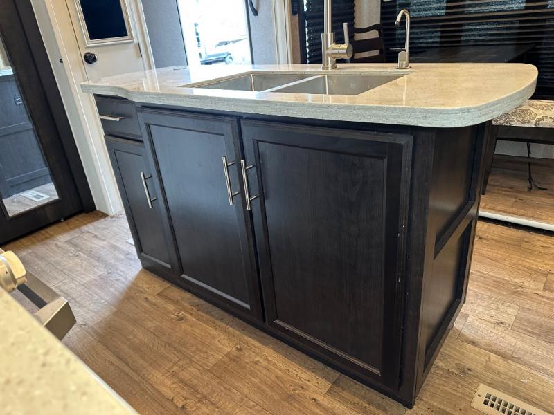 Find your favorite campsite then load up this two bedroom fifth wheel! The front private bedroom features a comfortable queen bed that can be switched out for an optional king Serta mattress, a walk-in closet with shelving and an area prepped for the optional washer and dryer. The second bedroom has a desk for you to get some work done, a hide-a-bed sofa with a top bunk and a 64" x 76" loft above it all. You can prepare your best meals in the kitchen with the island, the 21 cu. ft. residential refrigerator, and the three burner cooktop, and then comfortably enjoy eating them at the free standing table with chairs. The rear living area has a tri-fold sofa and theater seating across from an entertainment center with a fireplace and a 50" HDTV with a JBL sound system, plus there is a ceiling fan above it all to circulate the cool air from the dual Whisper Quiet air conditioners. You will stay protected underneath one of the two power awnings while you cook at the outside kitchen or prepare a beverage at the outside wet bar with a pull-out countertop!