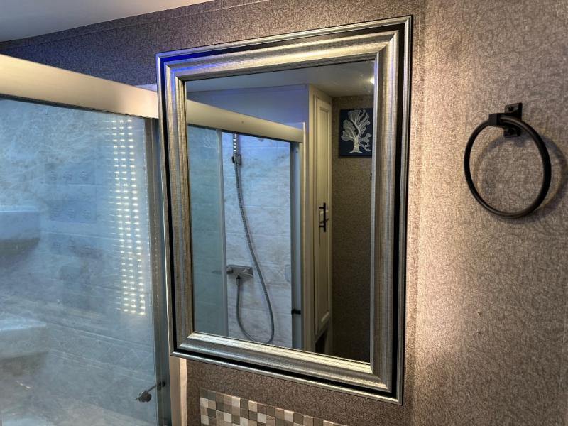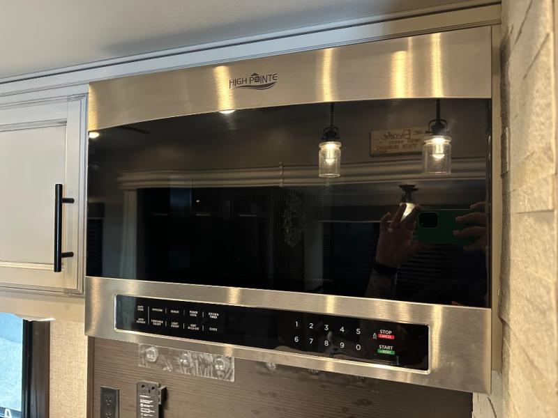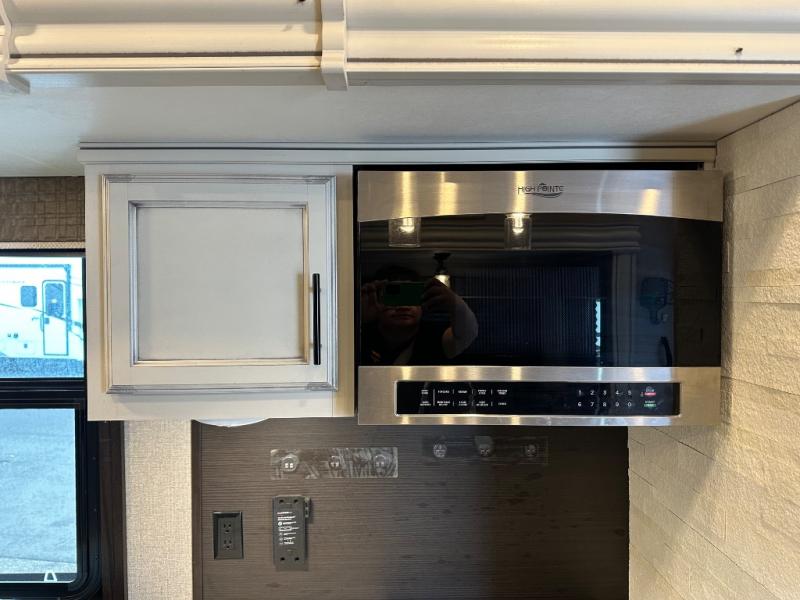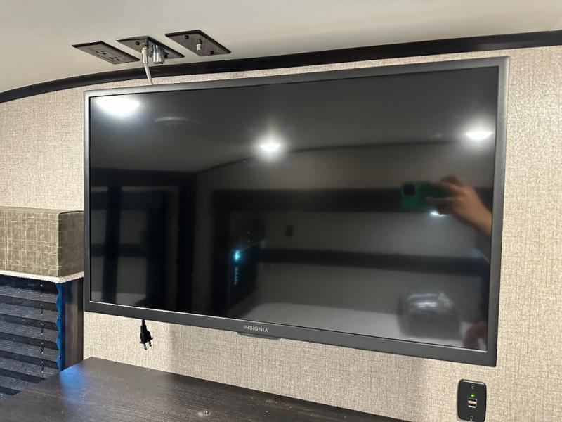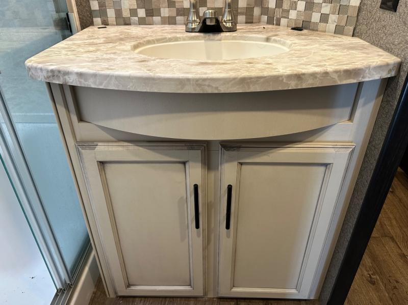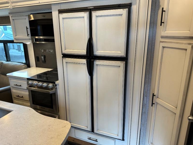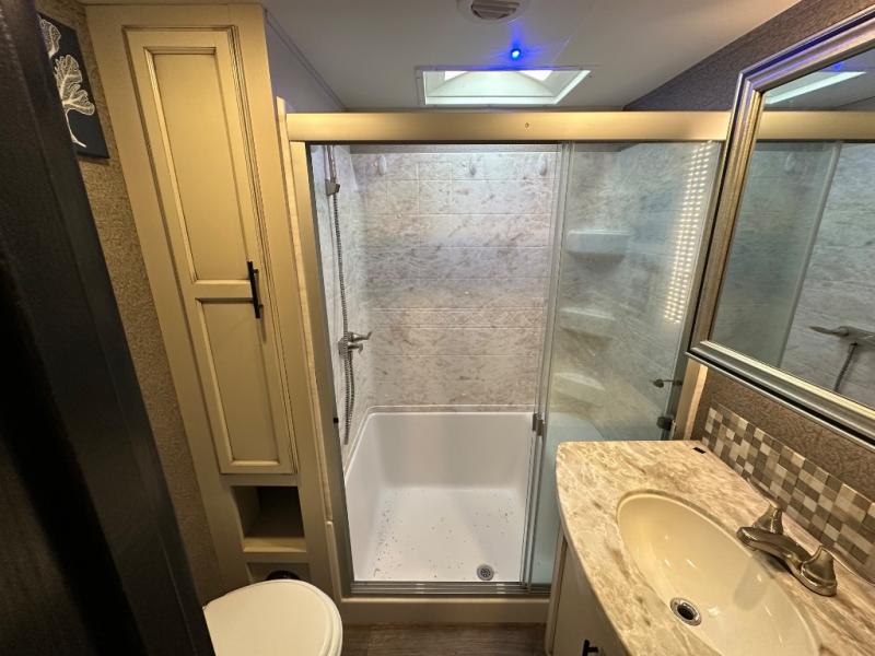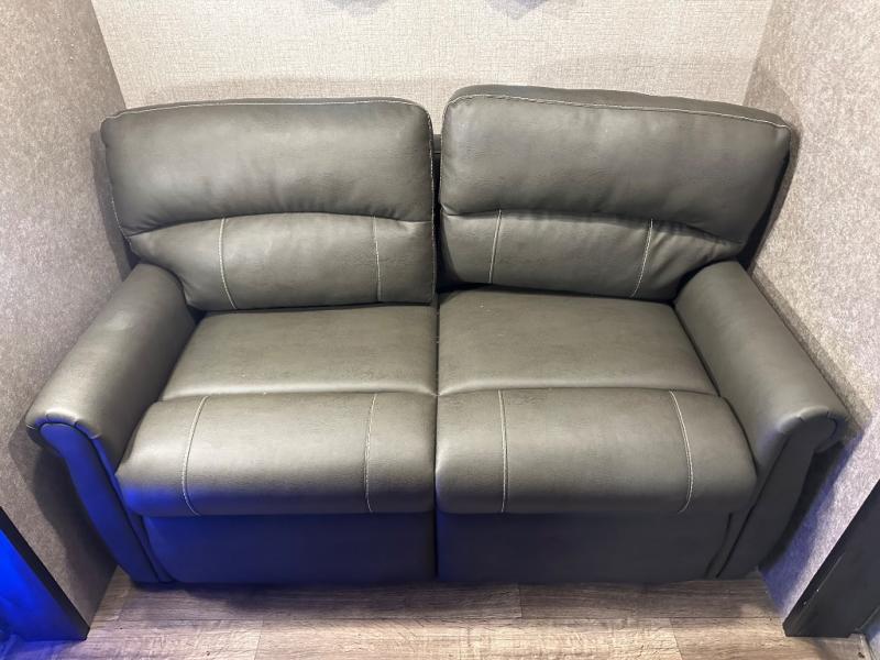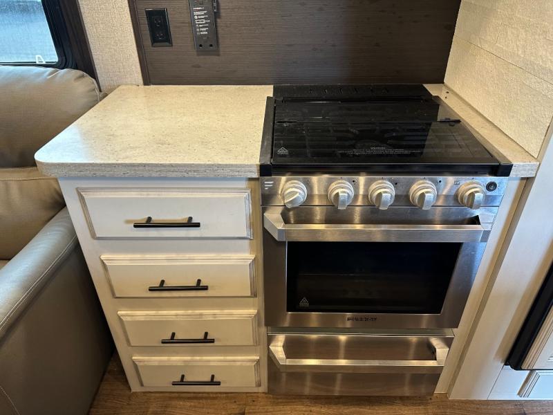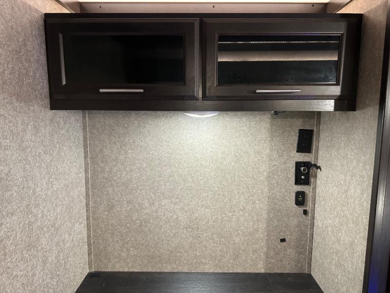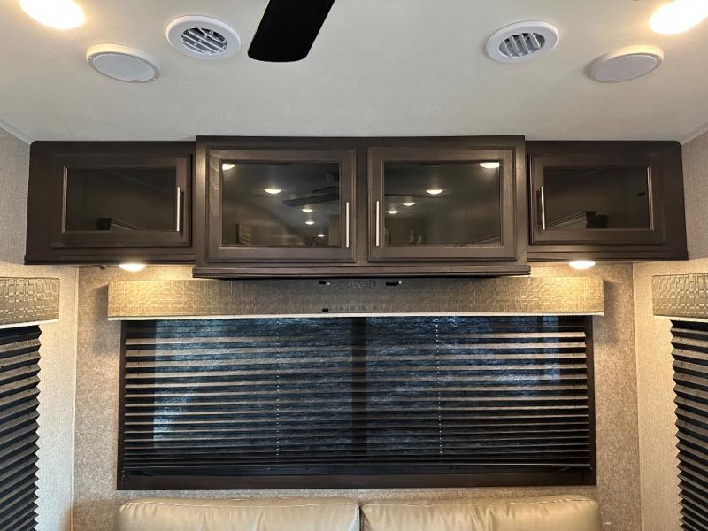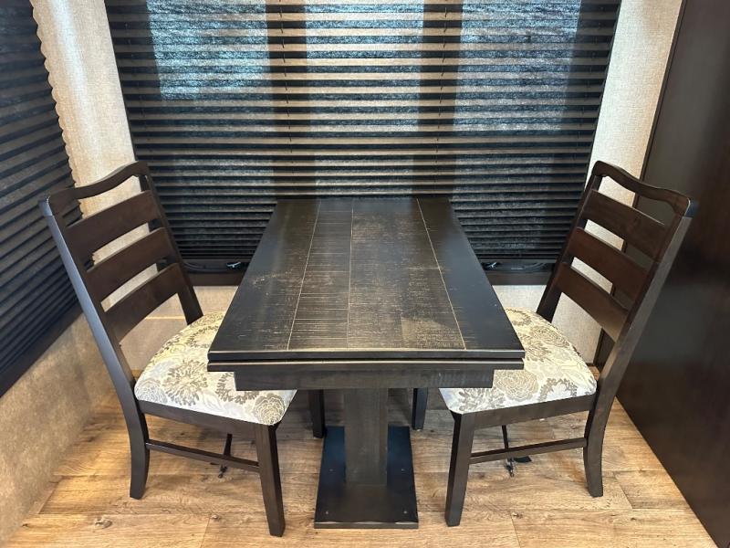 Find your favorite campsite then load up this two bedroom fifth wheel! The front private bedroom features a comfortable queen bed that can be switched out for an optional king Serta mattress, a walk-in closet with shelving and an area prepped for the optional washer and dryer. The second bedroom has a desk for you to get some work done, a hide-a-bed sofa with a top bunk and a 64" x 76" loft above it all. You can prepare your best meals in the kitchen with the island, the 21 cu. ft. residential refrigerator, and the three burner cooktop, and then comfortably enjoy eating them at the free standing table with chairs. The rear living area has a tri-fold sofa and theater seating across from an entertainment center with a fireplace and a 50" HDTV with a JBL sound system, plus there is a ceiling fan above it all to circulate the cool air from the dual Whisper Quiet air conditioners. You will stay protected underneath one of the two power awnings while you cook at the outside kitchen or prepare a beverage at the outside wet bar with a pull-out countertop!