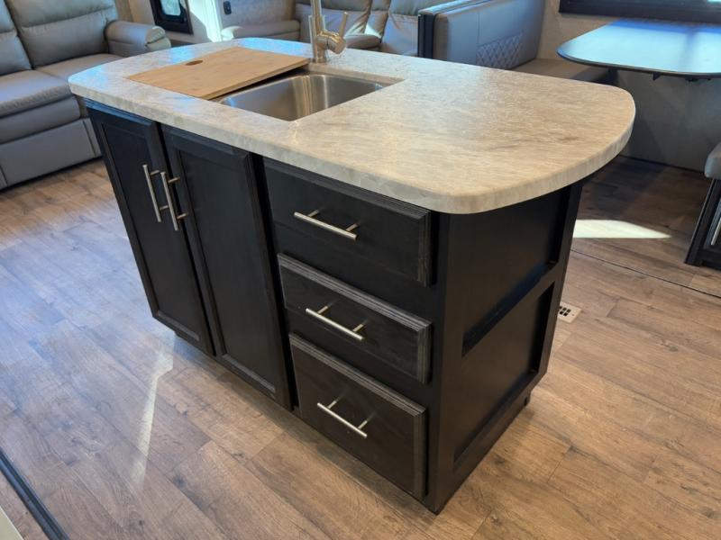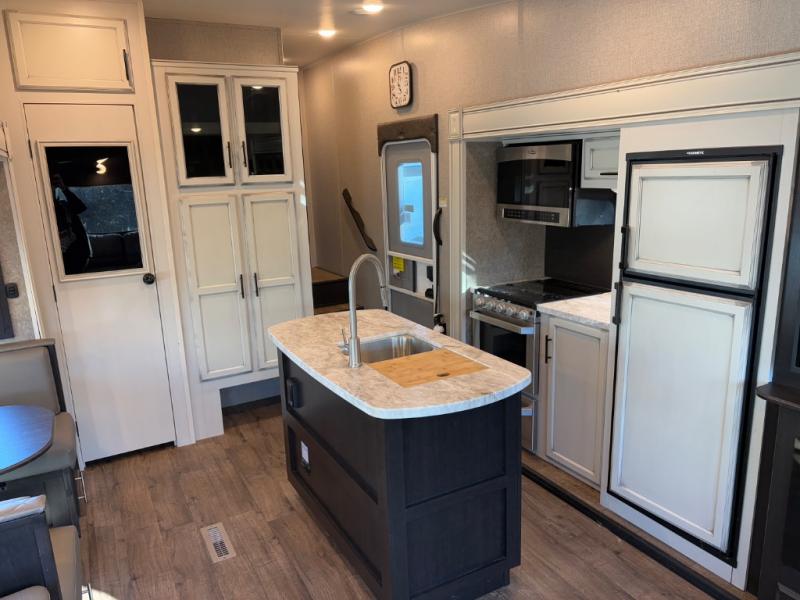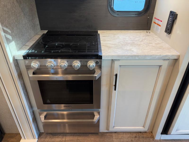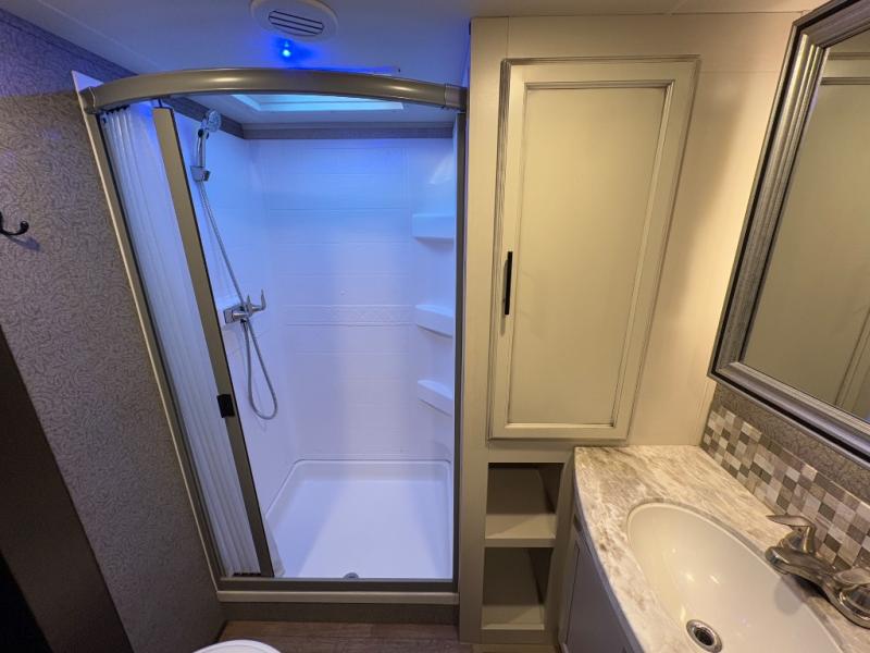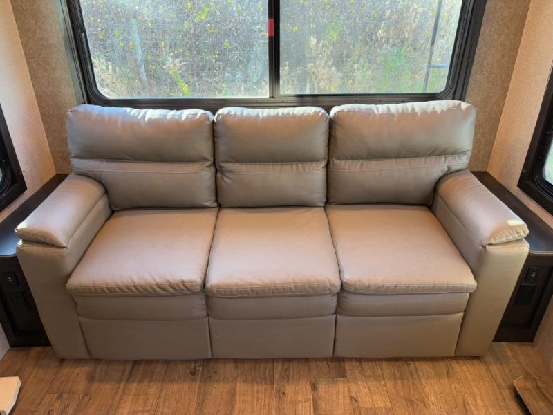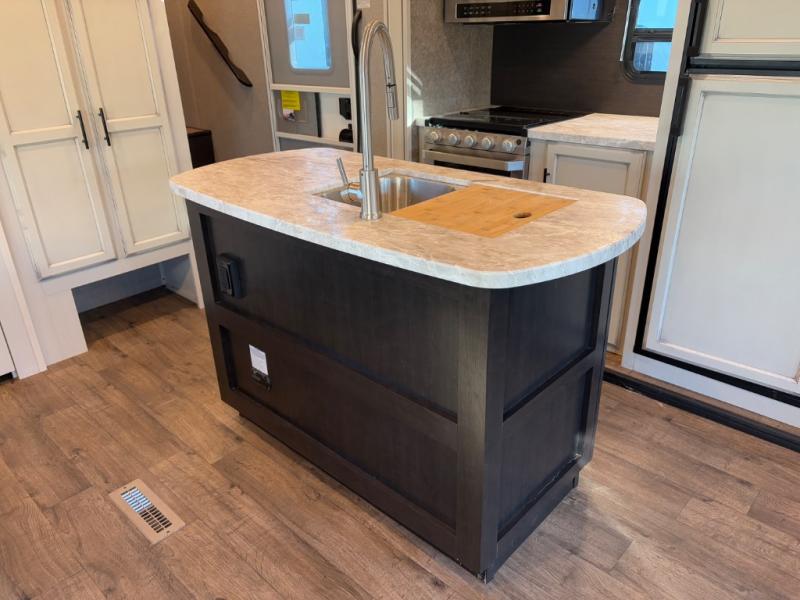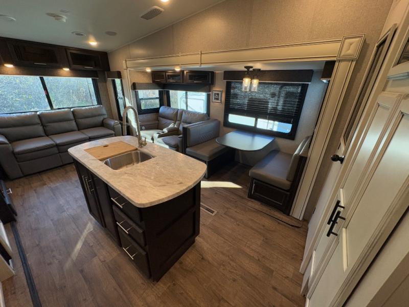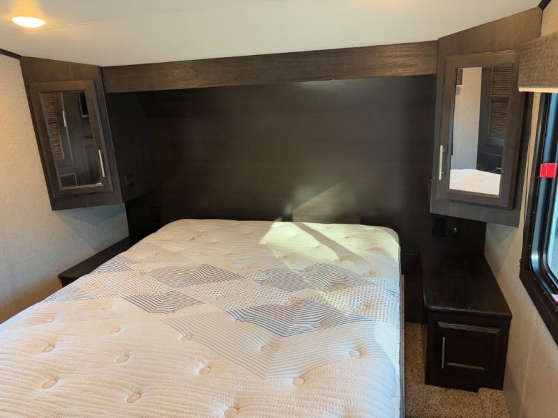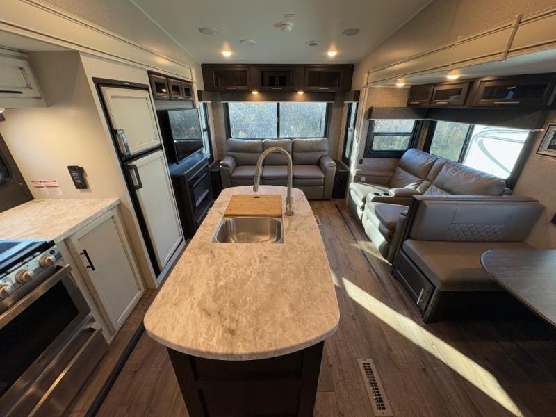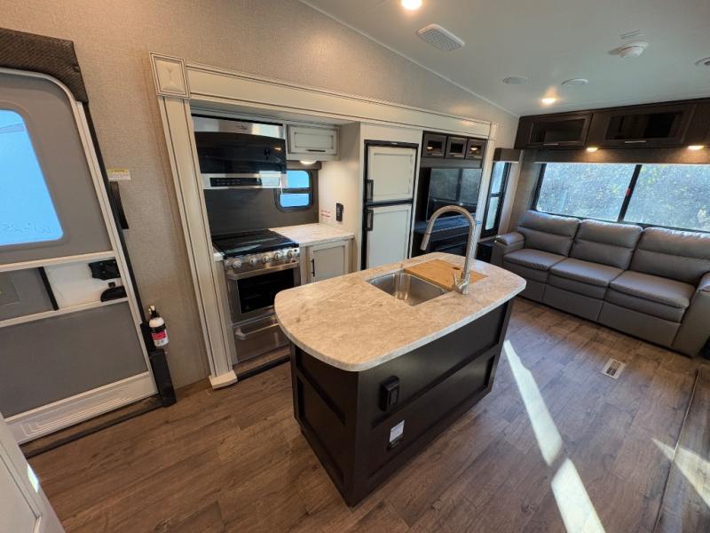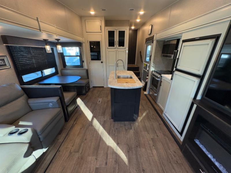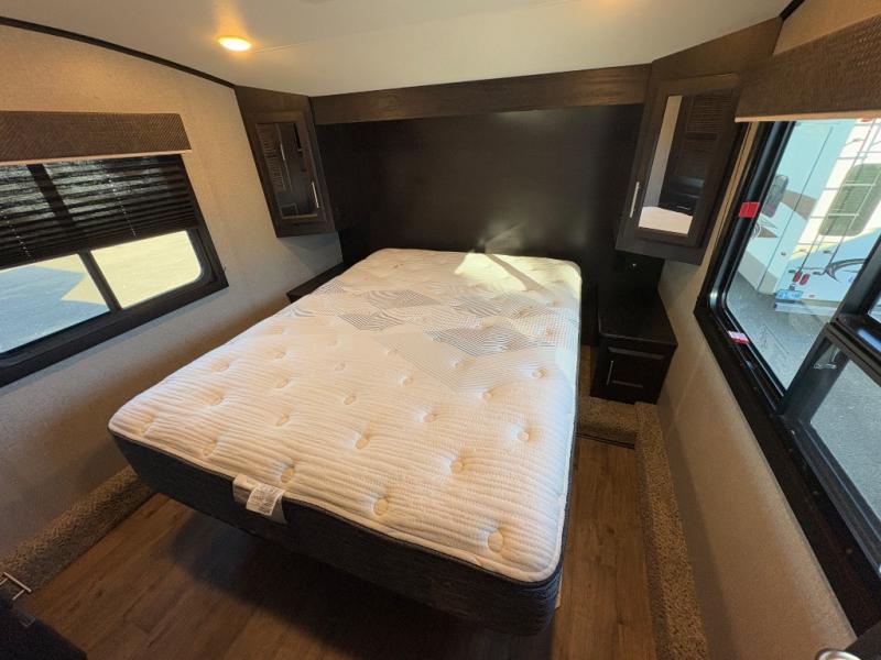 With each Jayco Eagle HT fifth wheel or travel trailer, you will enjoy all-season camping with the Climate Shield zero-degree tested weather protection that includes a fully enclosed and heated underbelly. The industry-exclusive HELIX Cooling System with a 15,000 BTU "Whisper Quiet" A/C system provides a quieter and more efficient system for your comfort. These models include the JAYCOMMAND Smart RV system powered by BMPRO which allows you to control your unit's functions right from your smartphone or tablet. Inside, you will enjoy the residential queen Serta mattress with under-bed storage, the bathroom skylight to allow natural light in, the stainless steel kitchen sink, and dual USB charging ports in the kitchen and bedroom so that you can keep your gadgets charged and ready to go.